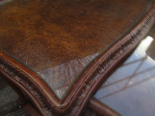 A STYLISH NEST OF 3 WALNUT VENEERED TABLES IN THE QUEEN ANNE STYLE. THE TABLES FIT UNDER EACH OTHER SO THEY NEATLY STORE AWAY. GOOD QUALITY. SLIGHT SPLIT IN THE TOP TABLE.