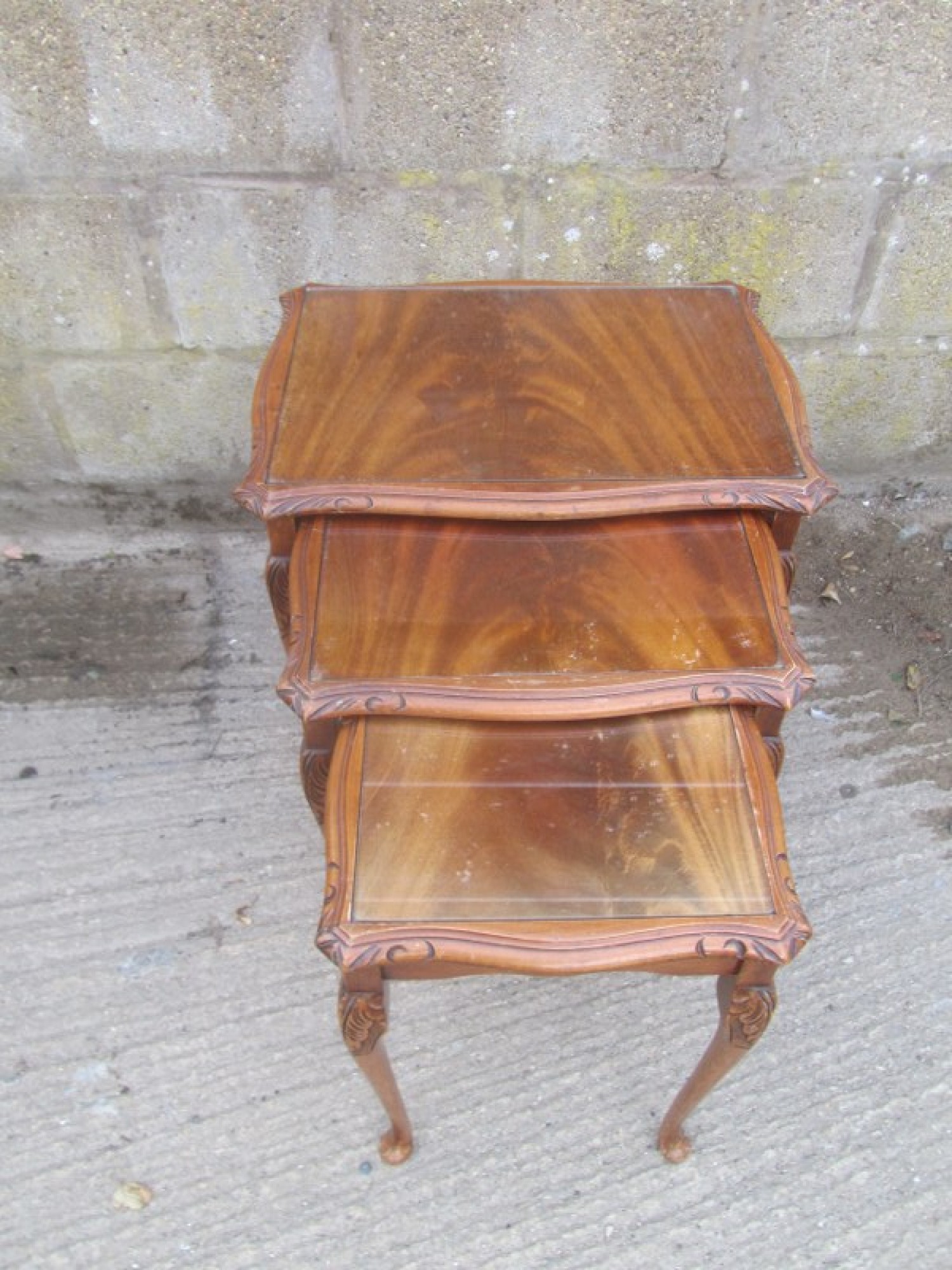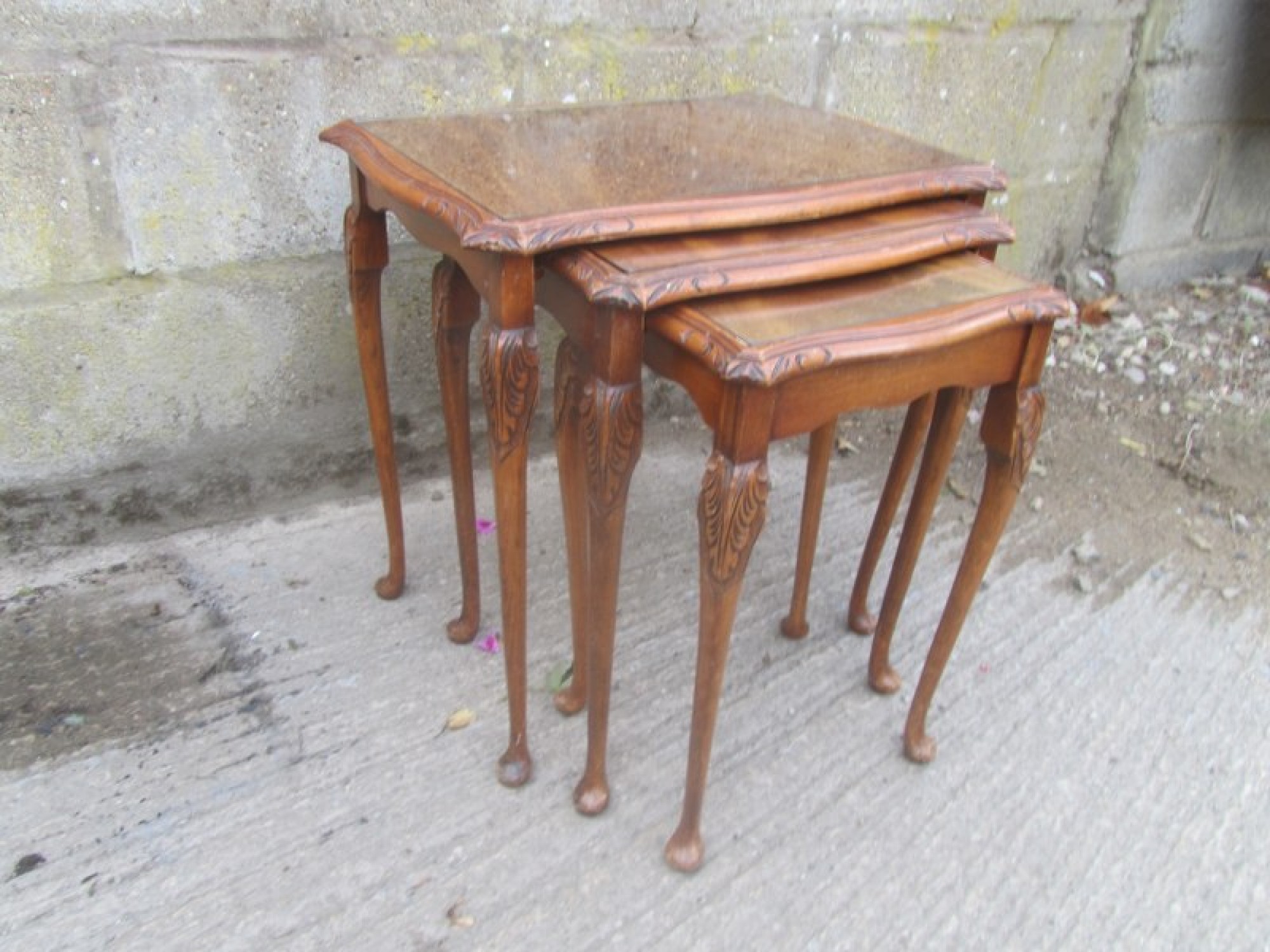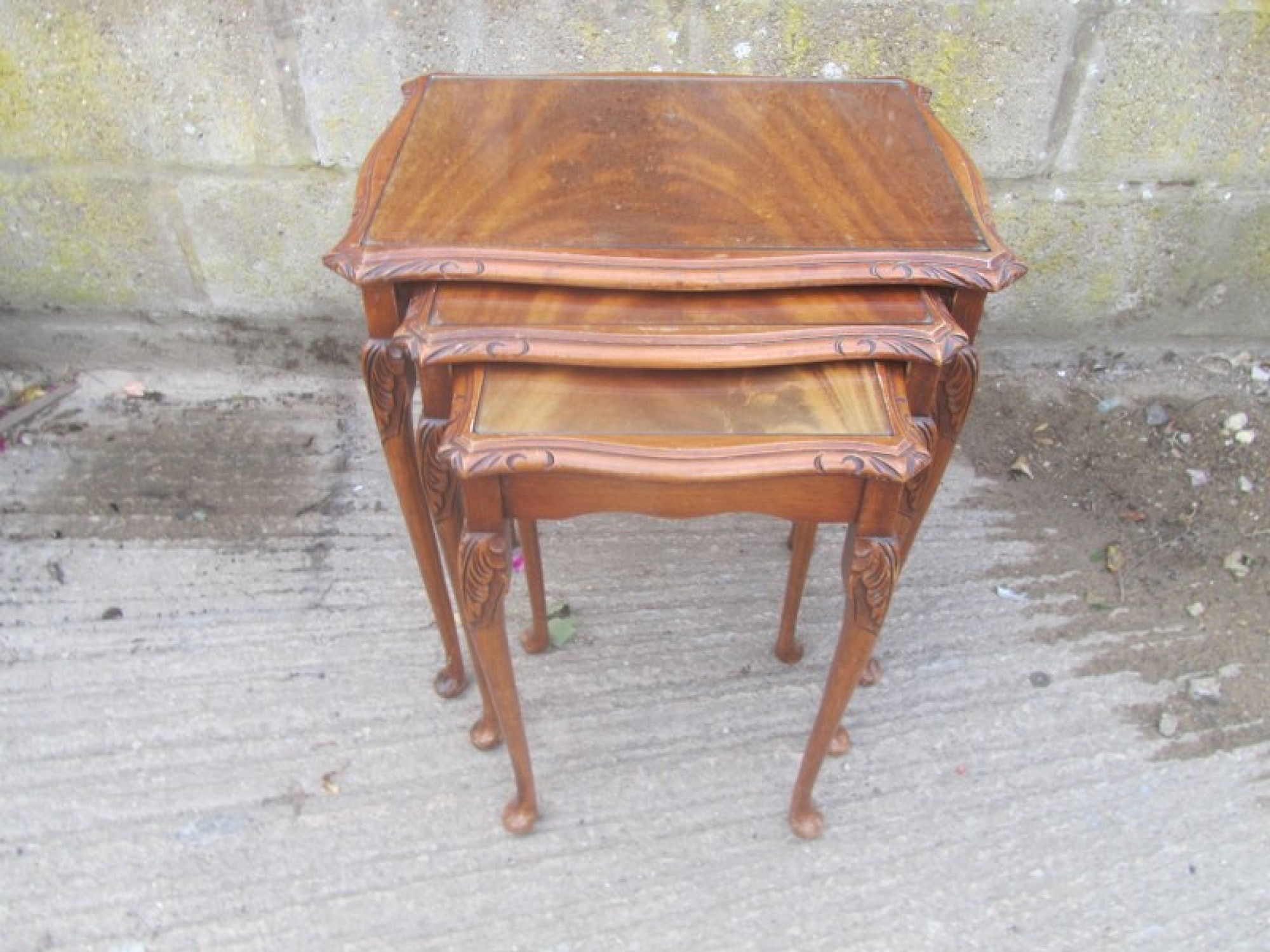 A STYLISH NEST OF 3 MAHOGANY VENEERED TABLES IN THE QUEEN ANNE STYLE. THE TABLES FIT UNDER EACH OTHER SO THEY NEATLY STORE AWAY. GOOD QUALITY, MADE BY 'BEVAN & FUNNELL' FROM THE 'REPRODUX' RANGE.