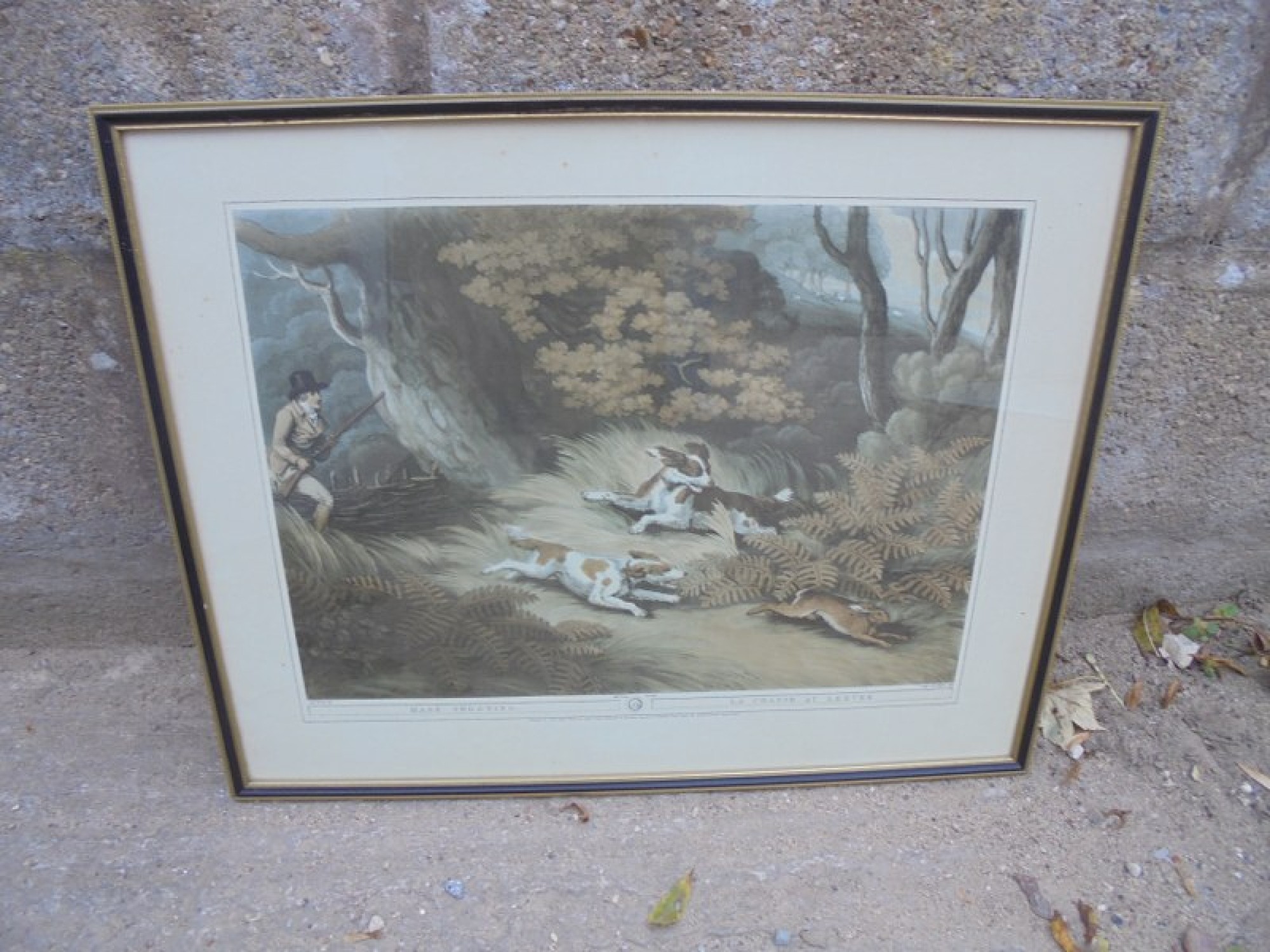A REPRODUCTION PRINT OF DOGS HUNTING HARES IN A BLACK FRAME.