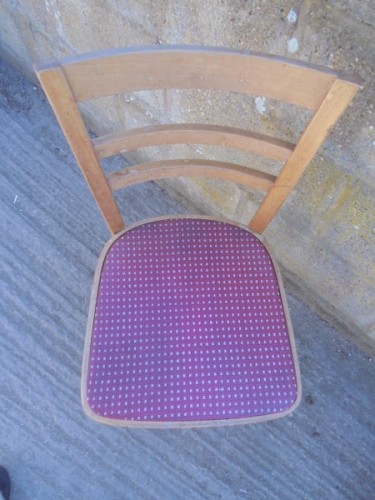 SOLID BEECH FRAME. THE SEAT PAD IS COVERED IN VINYL. IT WOULD LOOK GREAT COVERED IN A VINTAGE STYLE FABRIC. THE FRAMES STURDY. SEAT HEIGHT IS 47cm. IN AVERAGE CONDITION, MINOR WEAR AND TEAR.