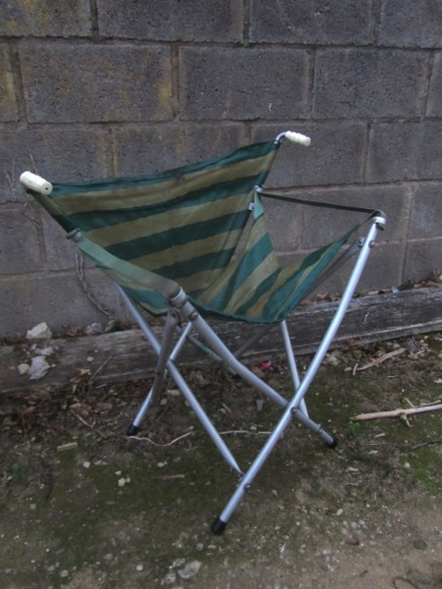 THIS IS A SMALL FOLD UP OUTDOOR CHAIR. THE FRAME IS METAL. SOME WEAR AND STAINS. SEAT HEIGHT 47cm.