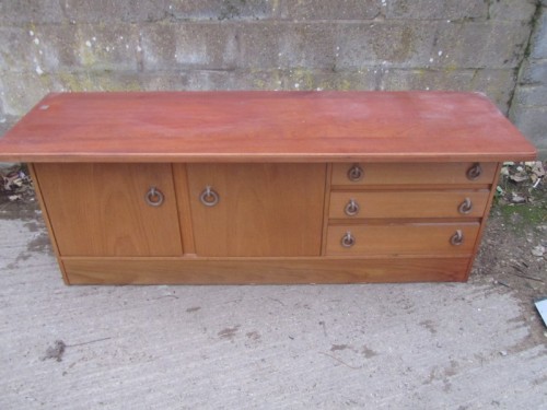 THIS IS A TEAK SIDEBOARD. IT IS TEAK VENEER. LOTS OF STORAGE SPACE. IN AVERAGE CONDITION, MINOR WEAR AND TEAR. ORIGINALLY THE BASE OF A LARGER UNIT, THE TOP IS NOT ORIGINAL, IT HAS BEEN ADDED.