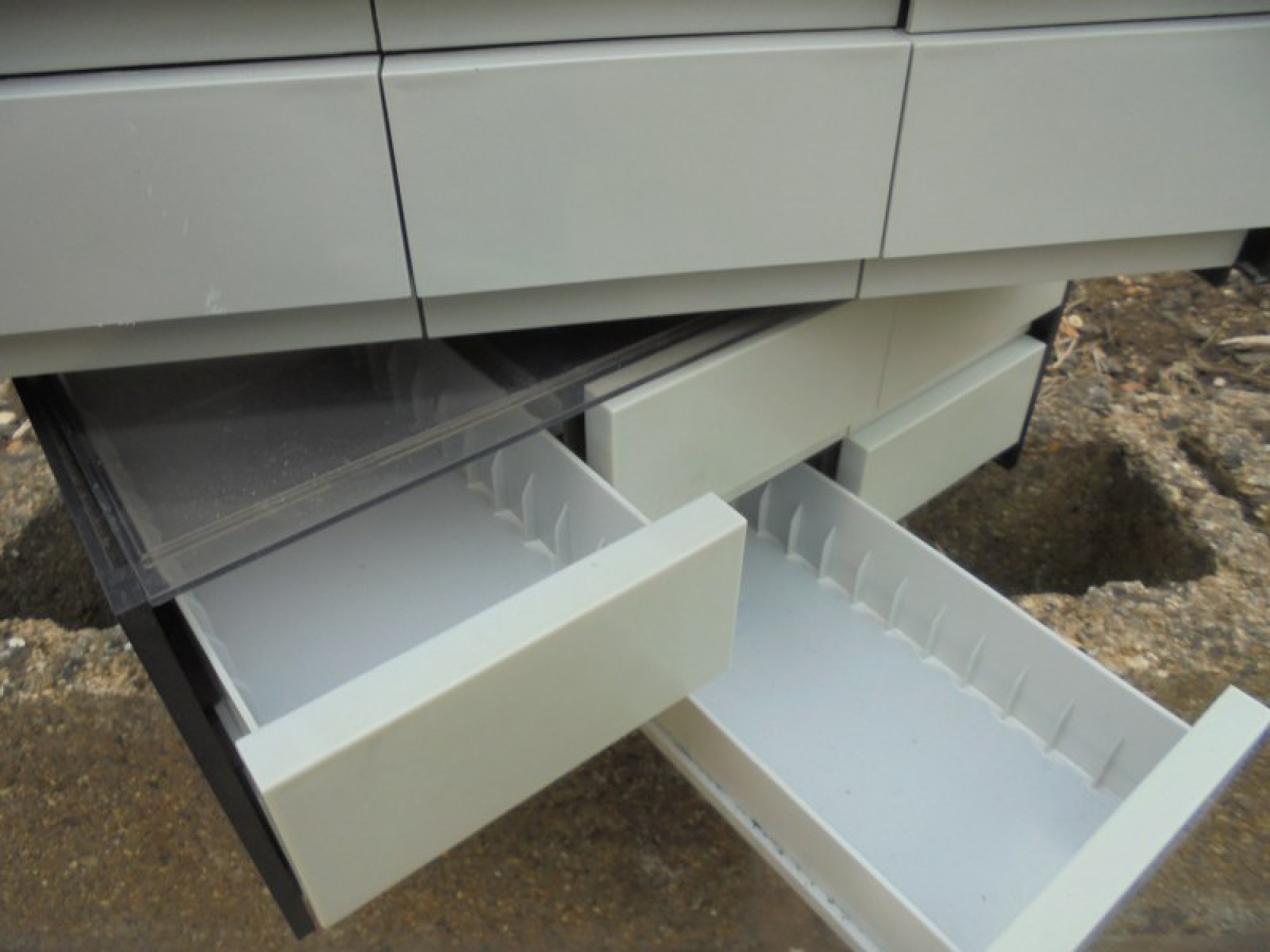 A PAIR OF RETRO PLASTIC CASSETTE TAPE STORAGE DRAWERS. SOME WEAR CRACKS ETC.