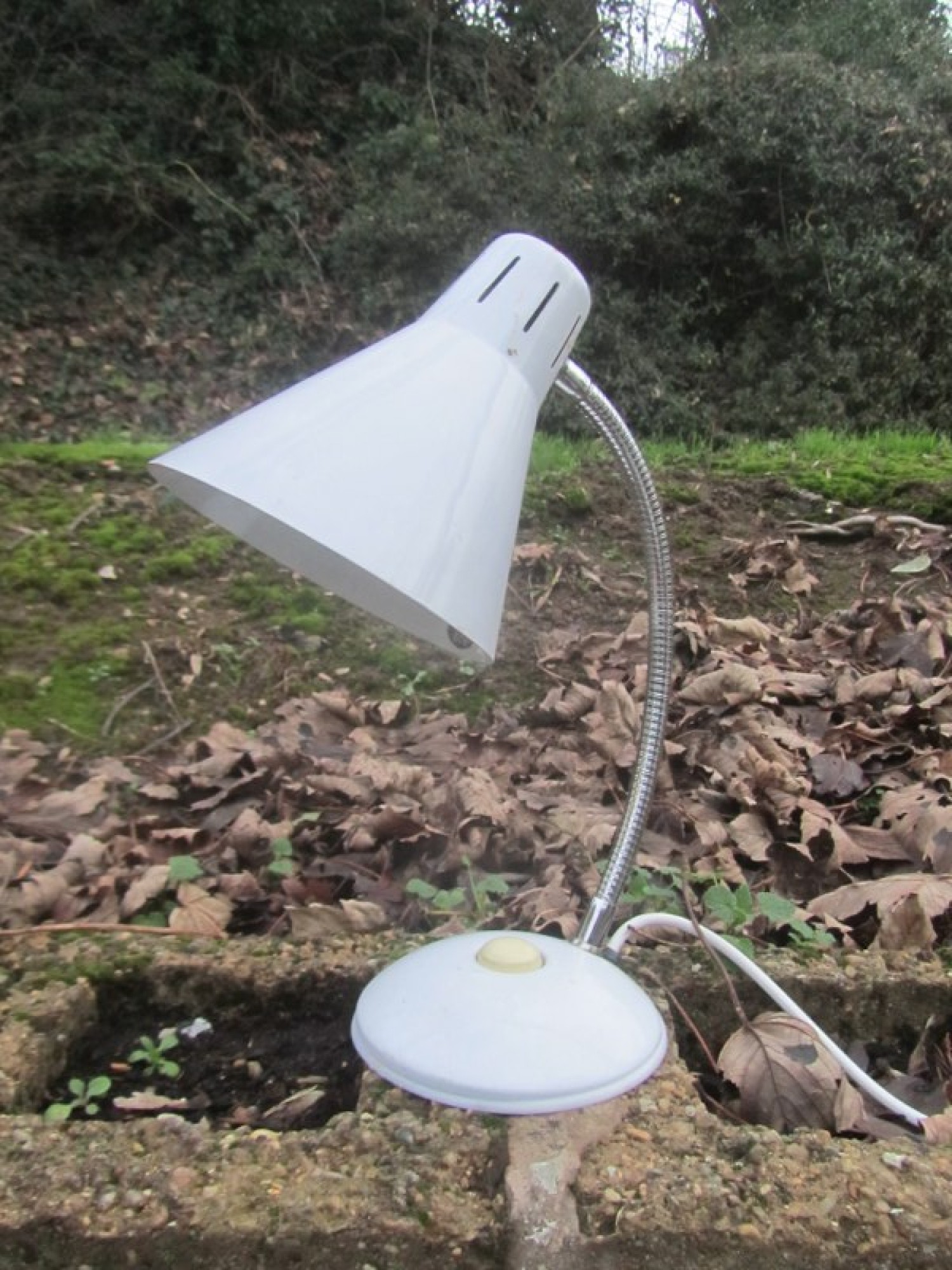 A WHITE METAL DESK LAMP. BENDY ARM AND A HEAVY BASE.