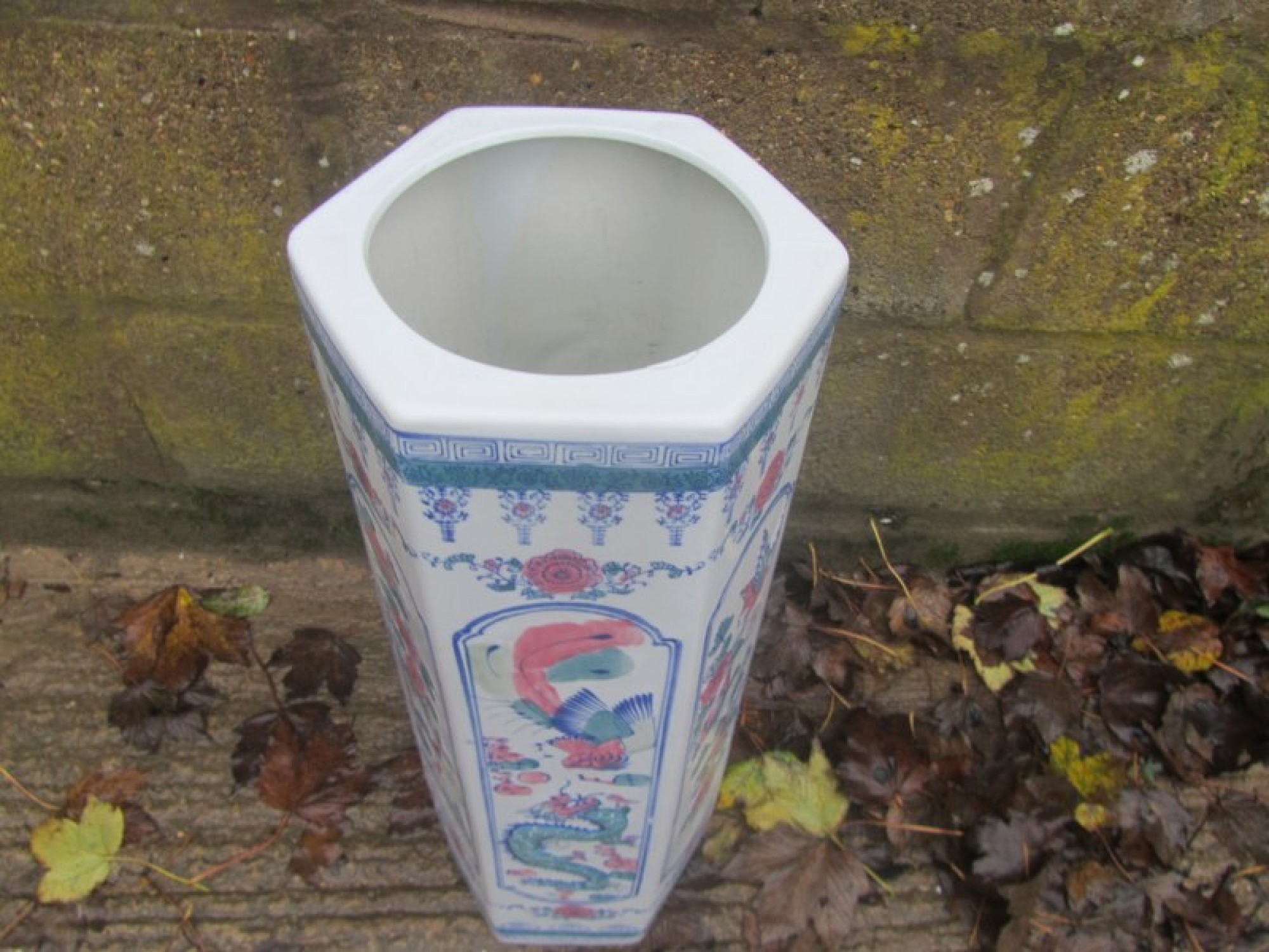 A TALL CERAMIC BROLLY HOLDER. WITH A PATTERN, A MODERN REPRODUCTION.