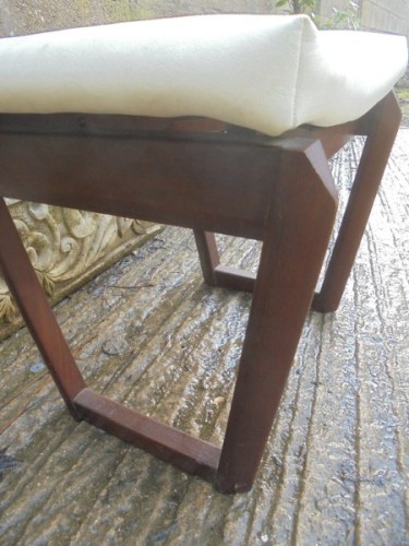 THIS IS A VINTAGE TEAK STOOL. WHITE VINYL SEAT, SOME MARKS AND WEAR. LOOSE JOINTS NEEDS REPAIR.