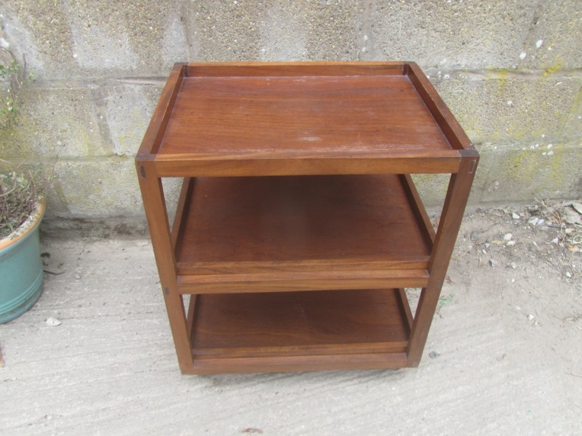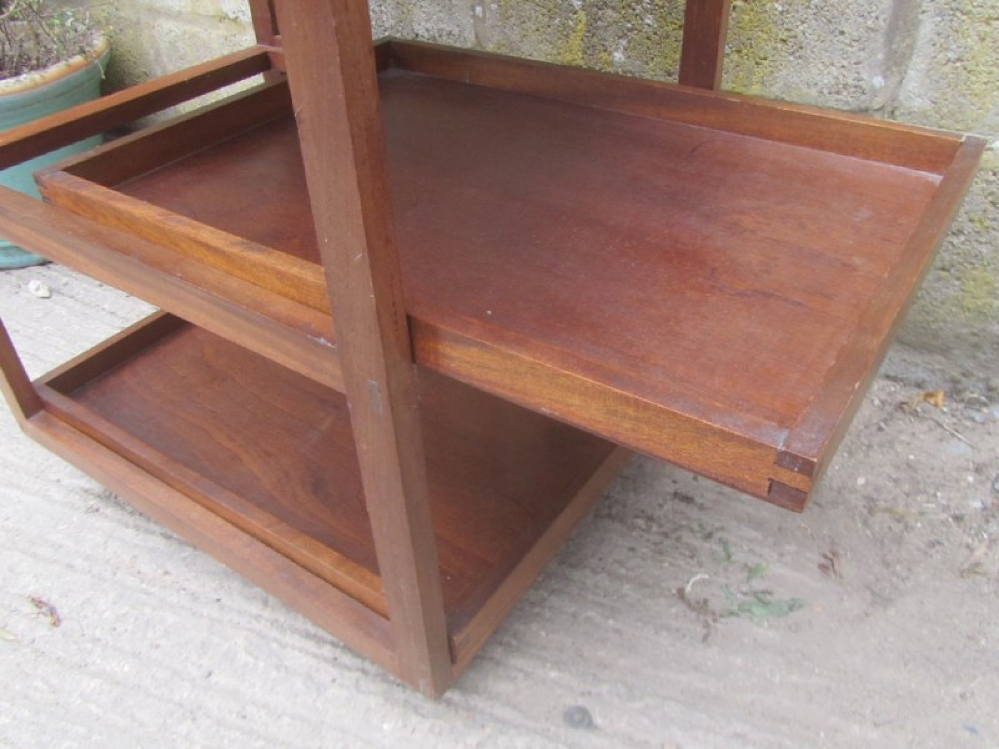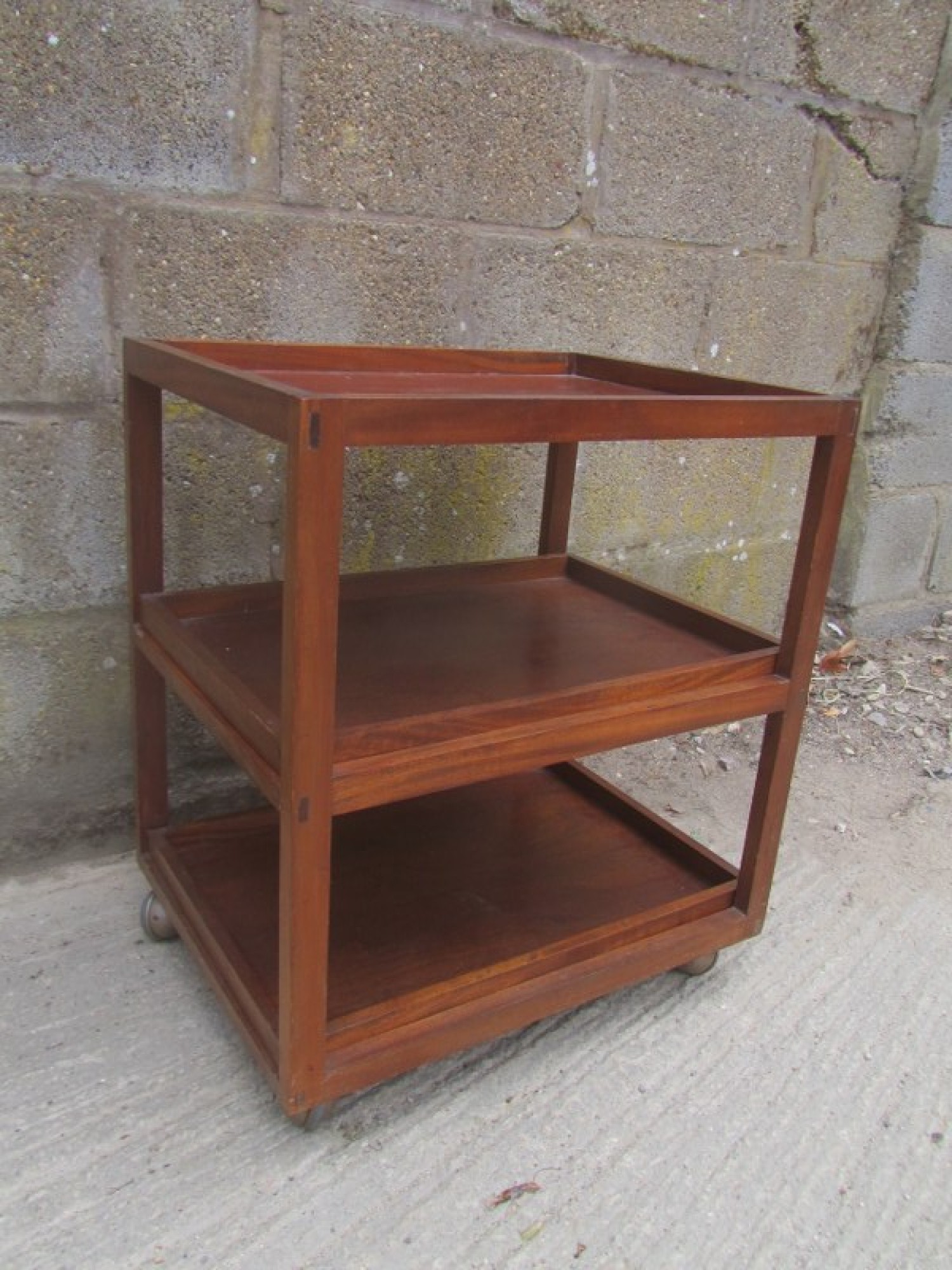 THIS IS A VINTAGE TEA TROLLEY FROM THE 1970s. IT IS TEAK, SOLID & VENEERED. THERE ARE CASTORS ON THE END OF THE LEGS. STRUCTURALLY IT IS STRONG AND STURDY. SCUFFS AND WEAR, AVERAGE CONDITION. THE TRAYS SLIDE OUT. PROBABLY HOME MADE.
