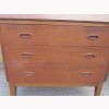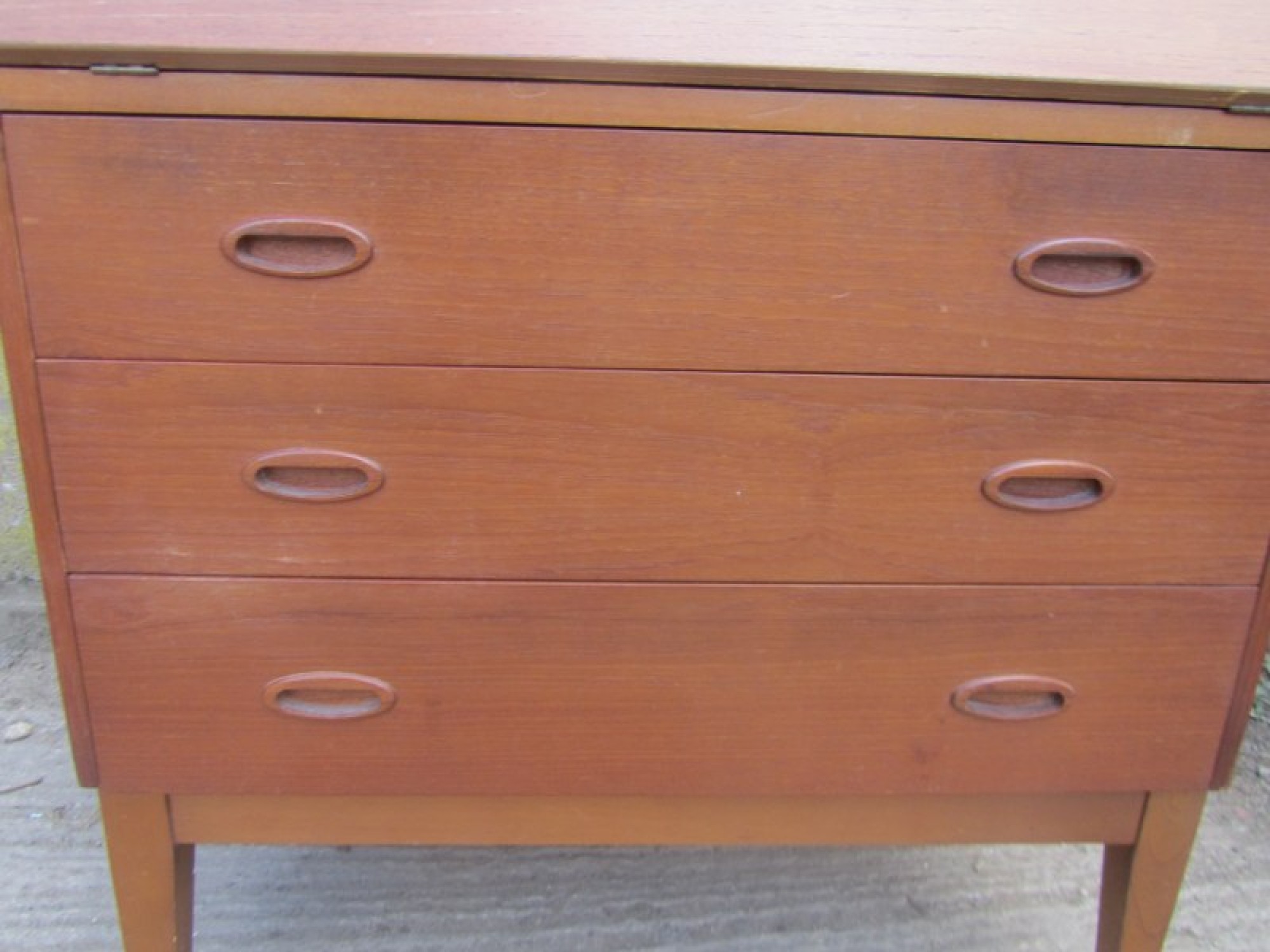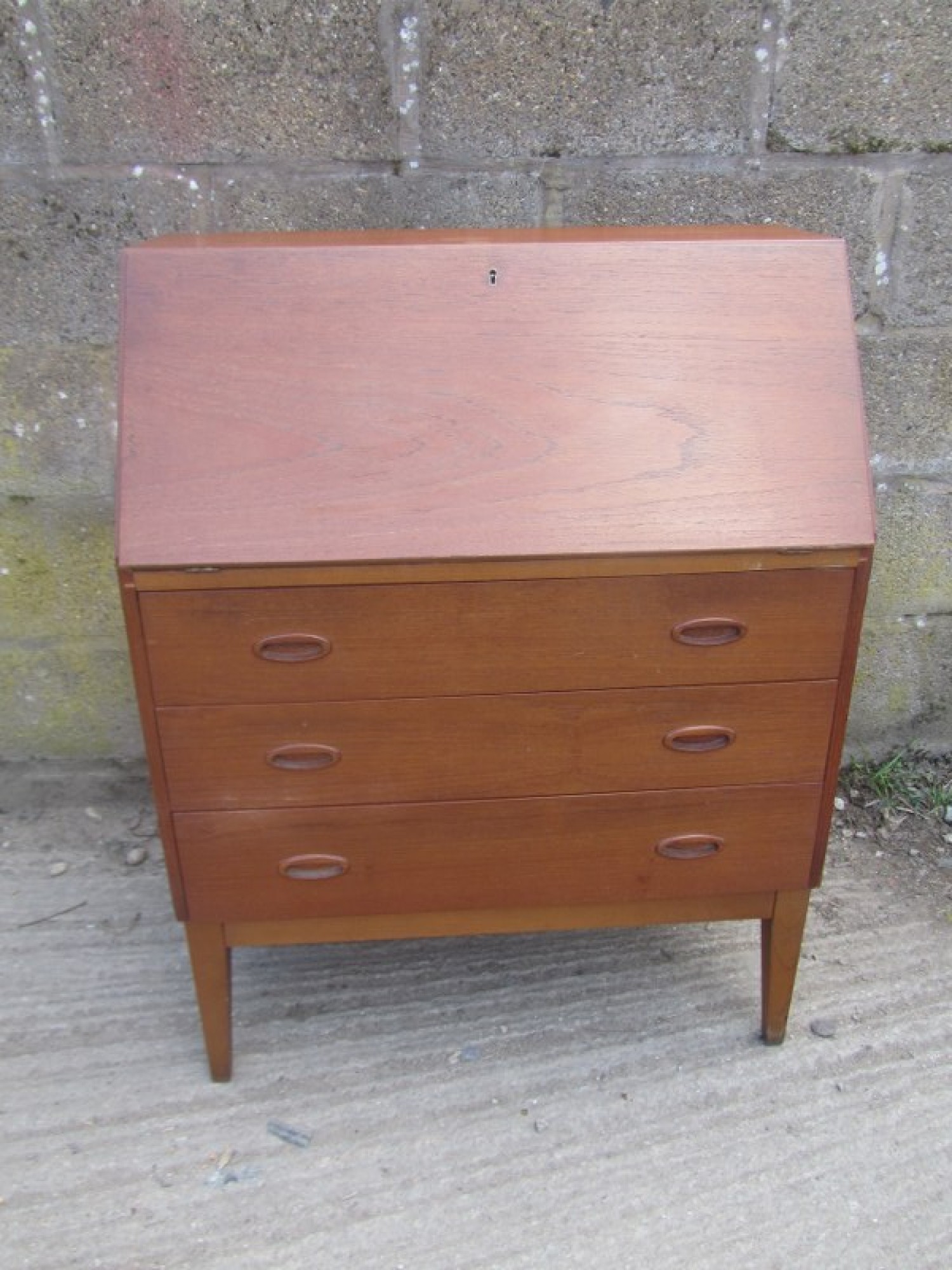 THIS IS A BUREAU IN A TEAK VENEER, THE TOP SECTION HAS A DROP DOWN FRONT WITH PIGEON HOLES INSIDE. BELOW THERE ARE DRAWERS WITH WOODEN HANDLES. WATER MARK ON THE TOP.