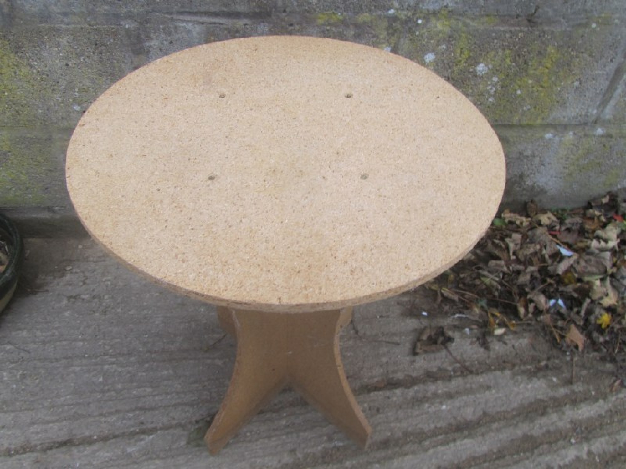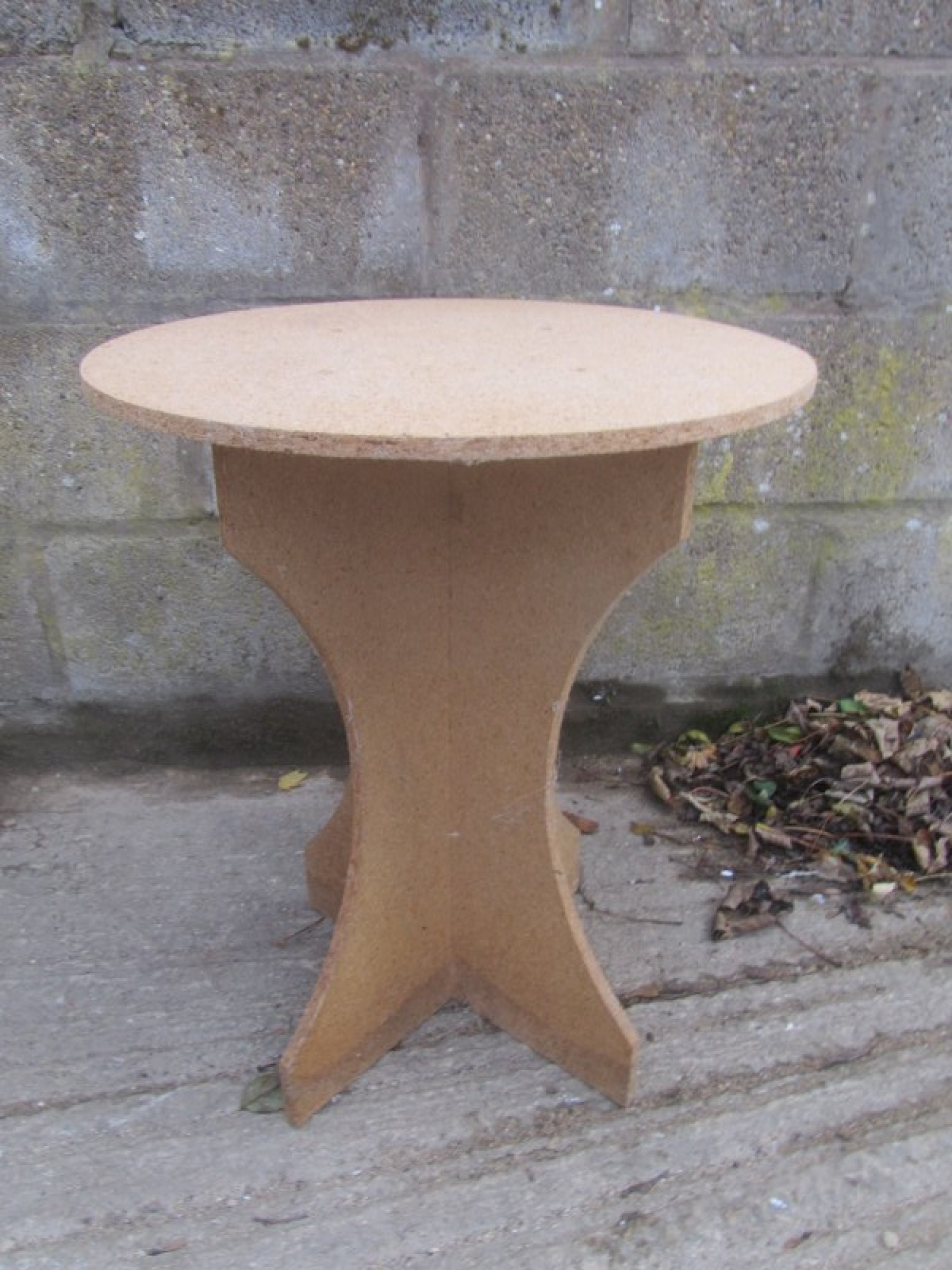 A SIMPLE ROUND TABLE, MADE FROM CHIP BOARD. TO BE USED WITH A TABLECLOTH, IDEAL FOR A SIMPLE TABLE ANYWHERE IN THE HOME.