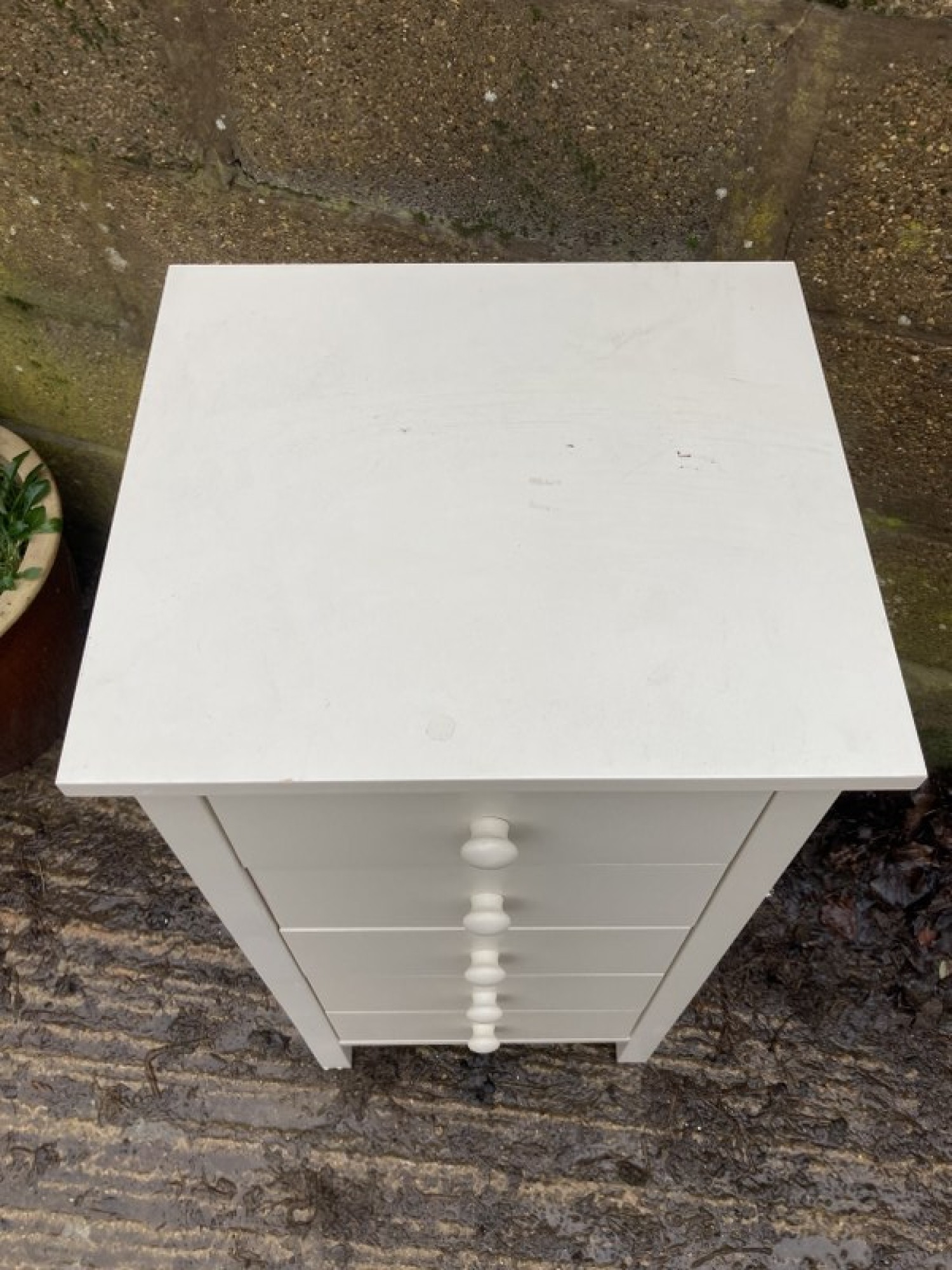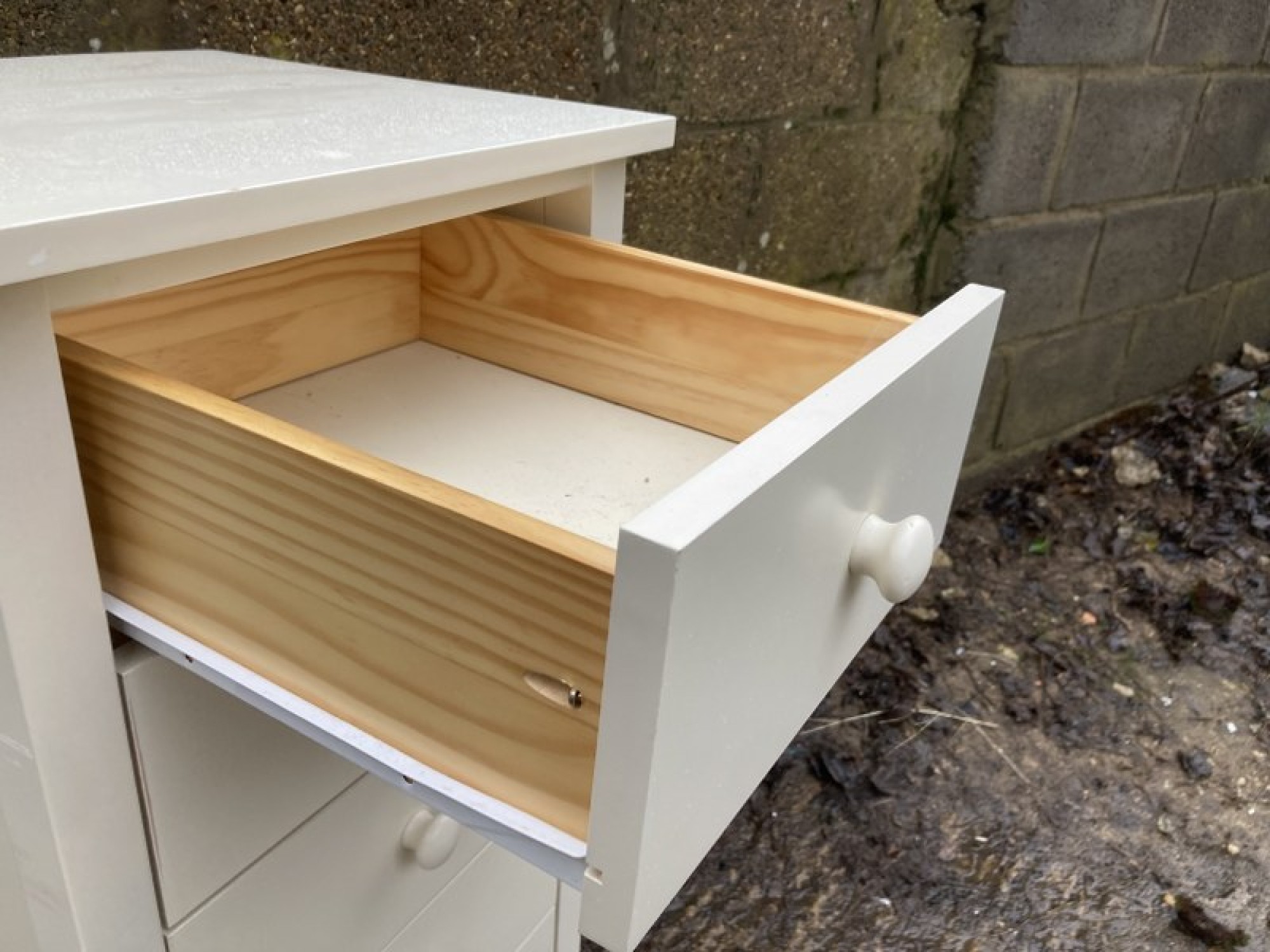 THIS IS A CHEST OF DRAWERS. IN A CREAM FINISH. STRONG AND STURDY.