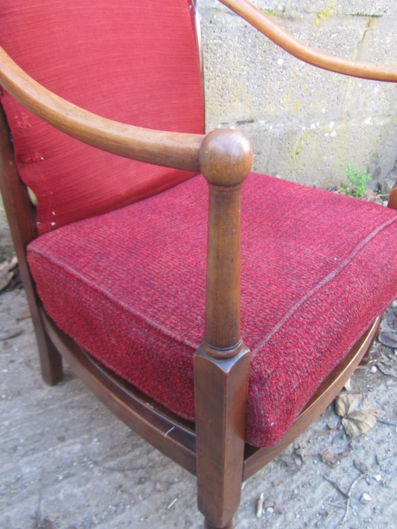 THE BACK REST AND SEAT ARE PADDED AND COVERED IN RED MATERIAL, SOME WEAR AND FADING, THE PADDING IS WORN AND THE SEAT FEELS LOW. IT WOULD LOOK GREAT RECOVERED.