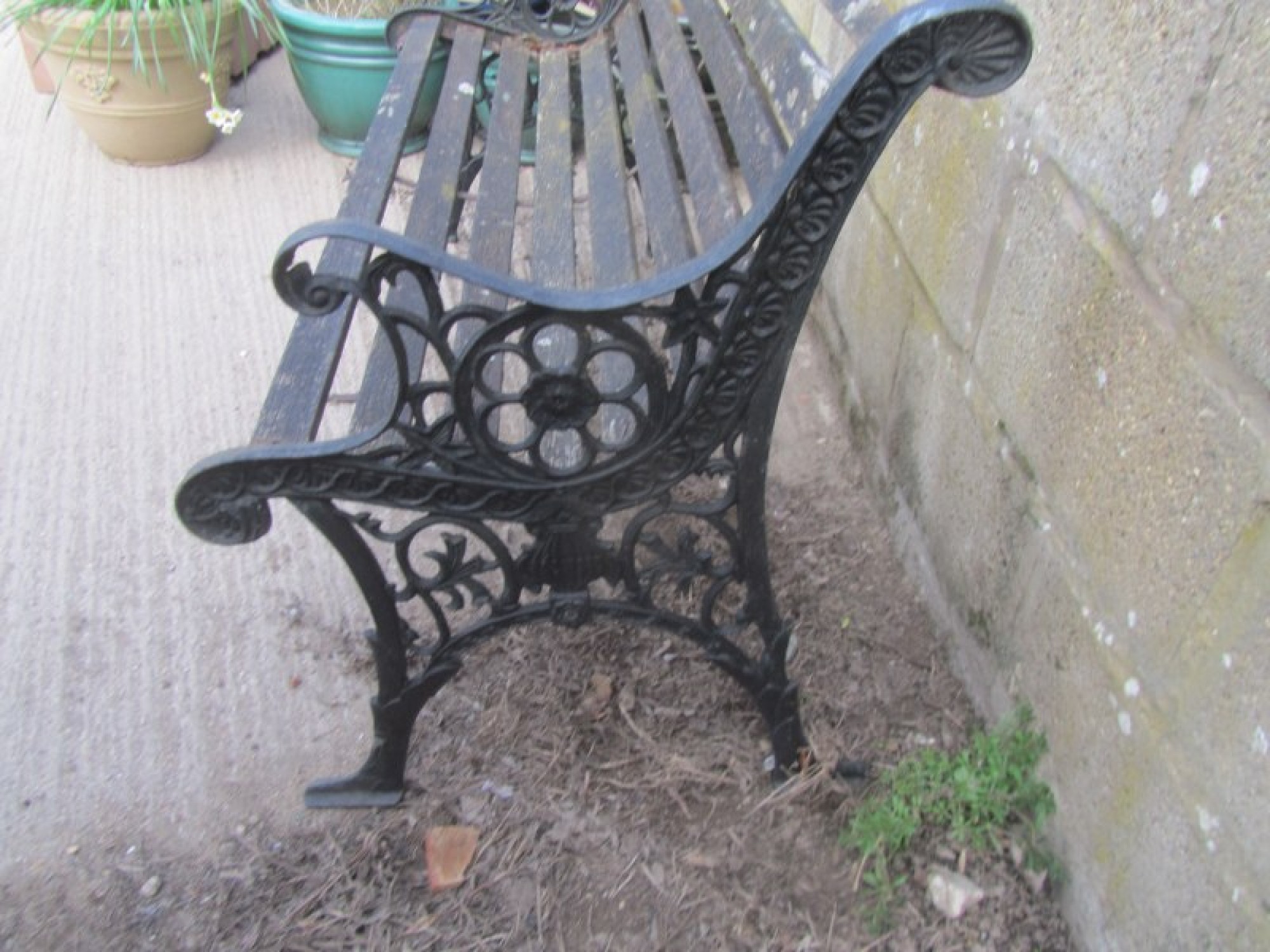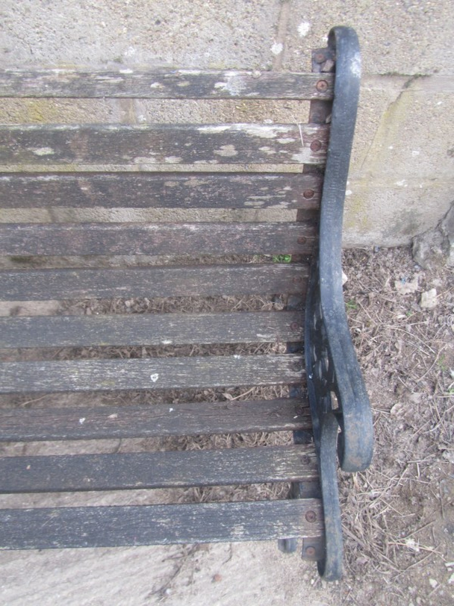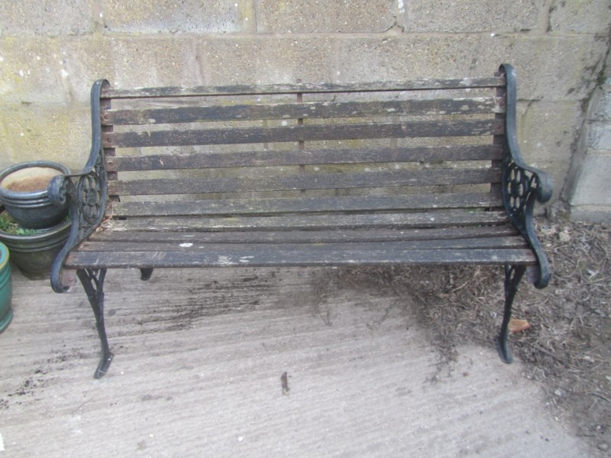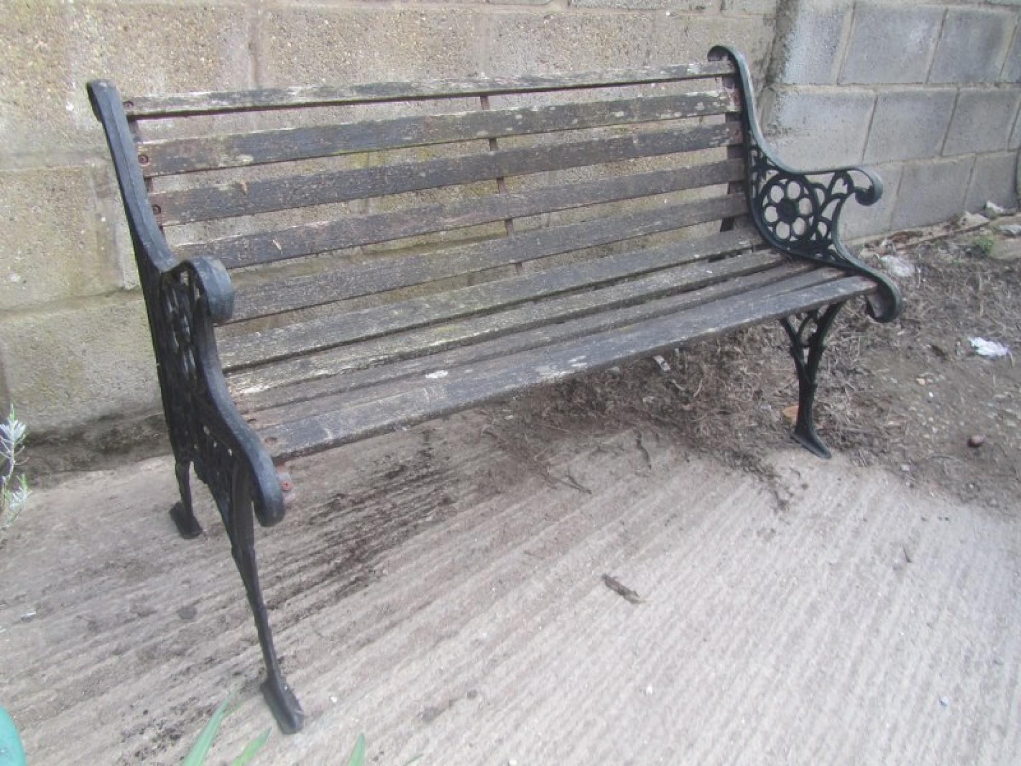 A WOODEN GARDEN BENCH WITH METAL ENDS. IT HAS SAT IN A GARDEN, THE WOOD IS WORN AND WILL NEED REPLACING, IT HAS WEATHERED FROM BEING OUTSIDE. WOBBLY AND WORN.