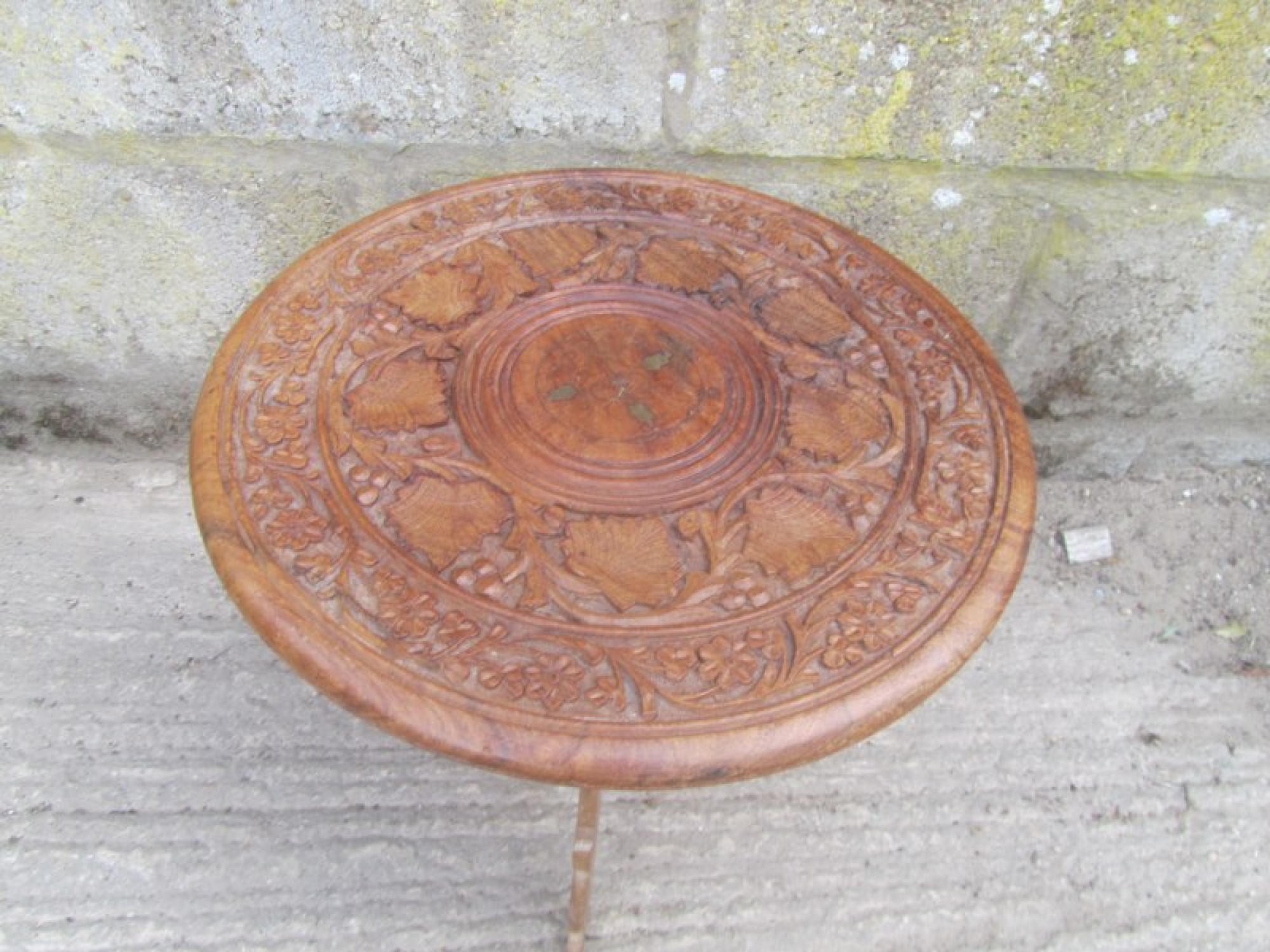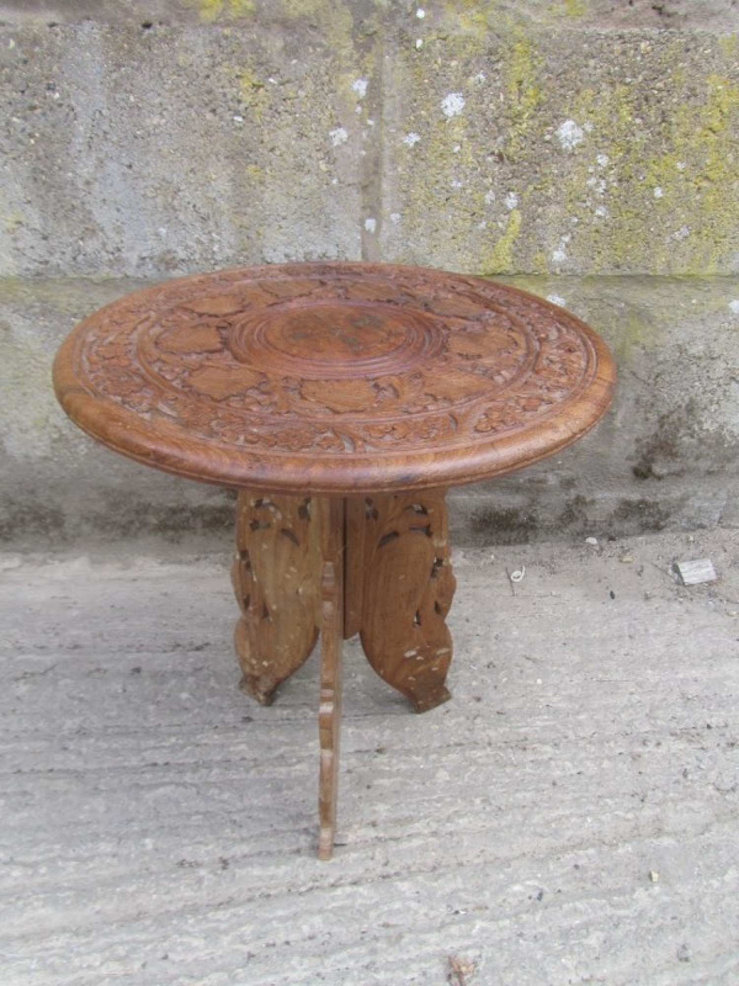 A SMALL ROUND COFFEE TABLE MADE FROM SOLID INDIAN SHEESHAM WOOD. THERE IS CARVED DETAIL ON THE TOP. AN IDEAL TABLE FOR ANYWHERE IN THE HOME.