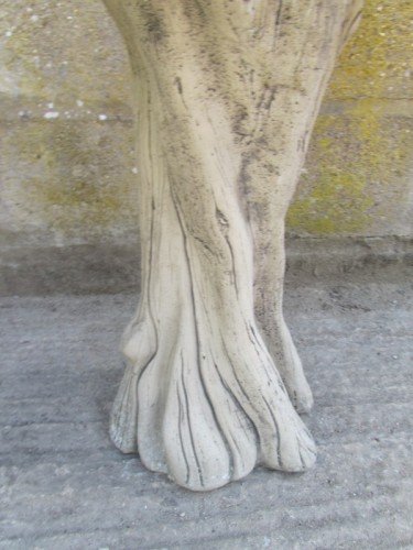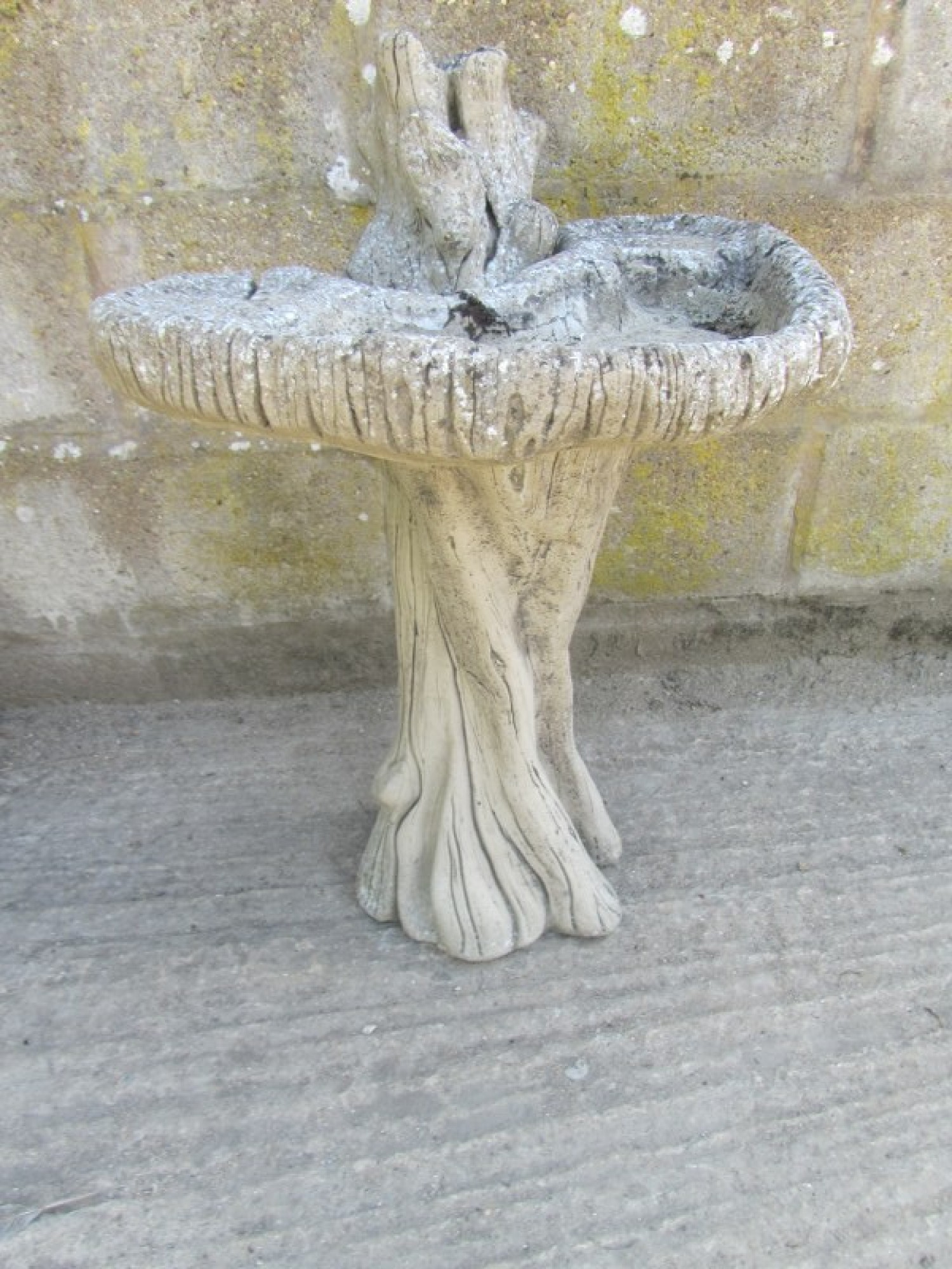 A CAST STONE BIRD BATH. IT HAS BEEN OUTSIDE FOR YEARS, IT HAS A WEATHERED LOOK. PROBABLY ABOUT 20-30 YEARS OLD. SOME CHIPS AND WEAR. THE TOP IS CRACKED AND WORN, IT WON'T HOLD WATER.