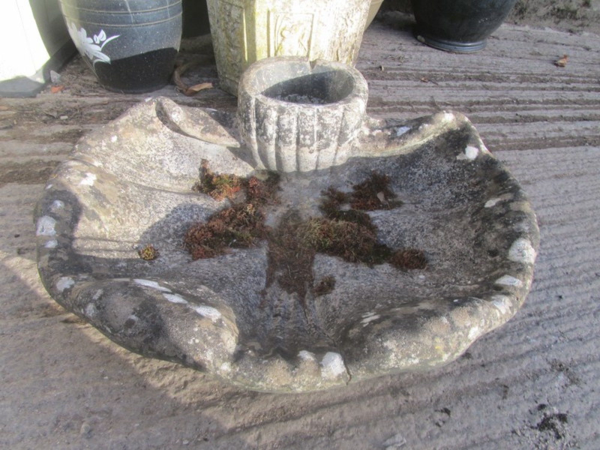 A CAST STONE BIRD BATH. IT HAS BEEN OUTSIDE FOR YEARS, IT HAS A WEATHERED LOOK. PROBABLY ABOUT 20-30 YEARS OLD. SOME CHIPS AND WEAR. CRACKED AT THE FRONT, IT WILL NOT HOLD WATER.