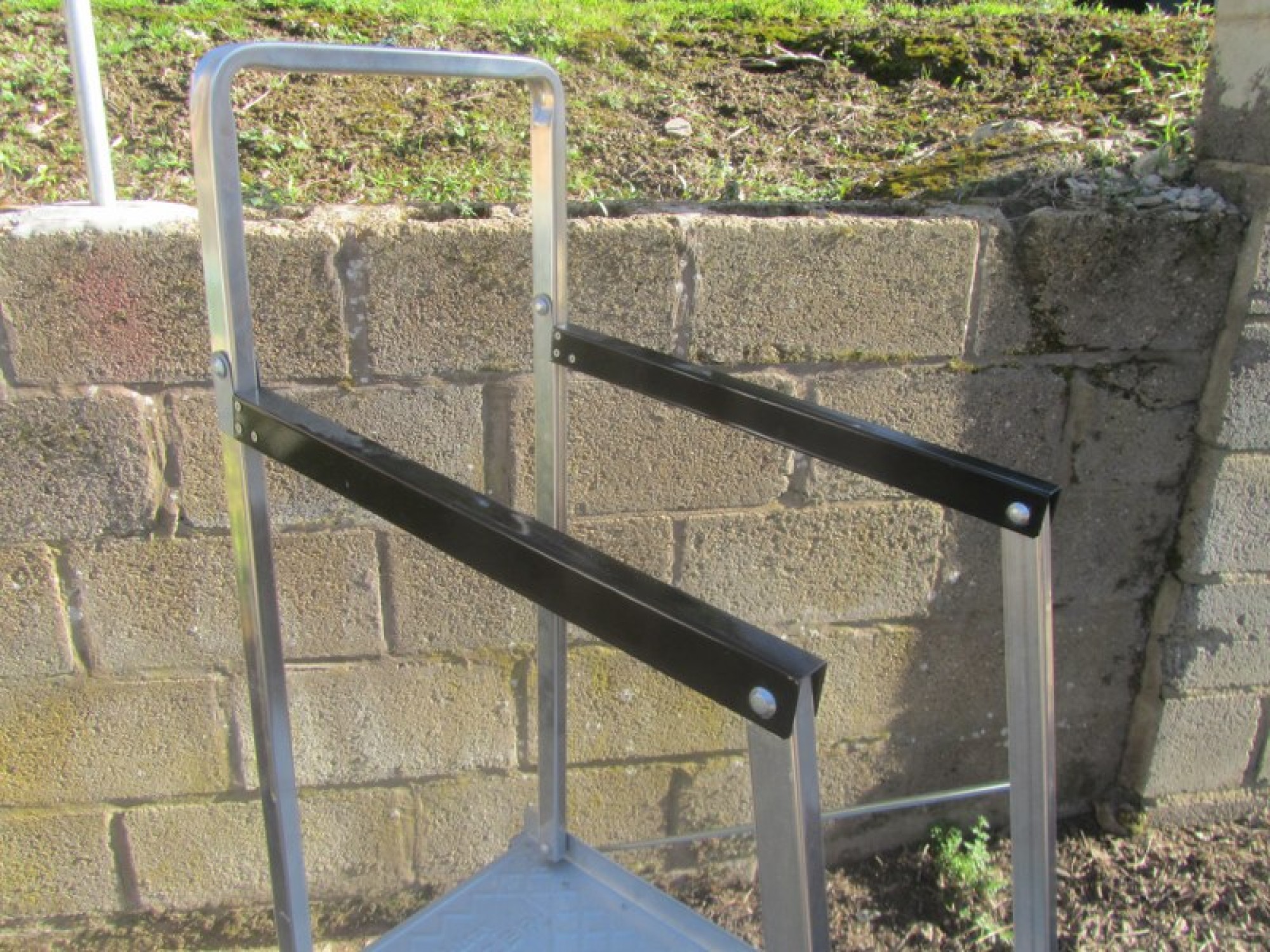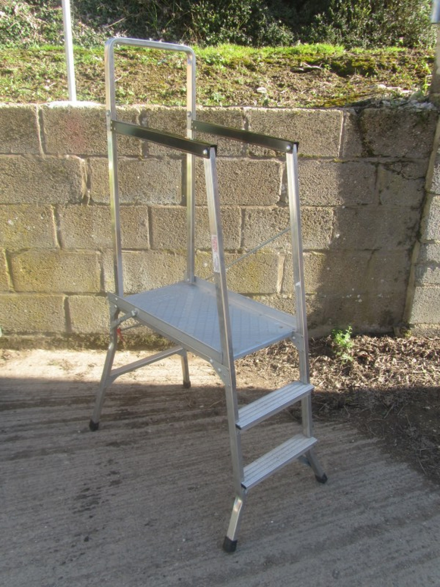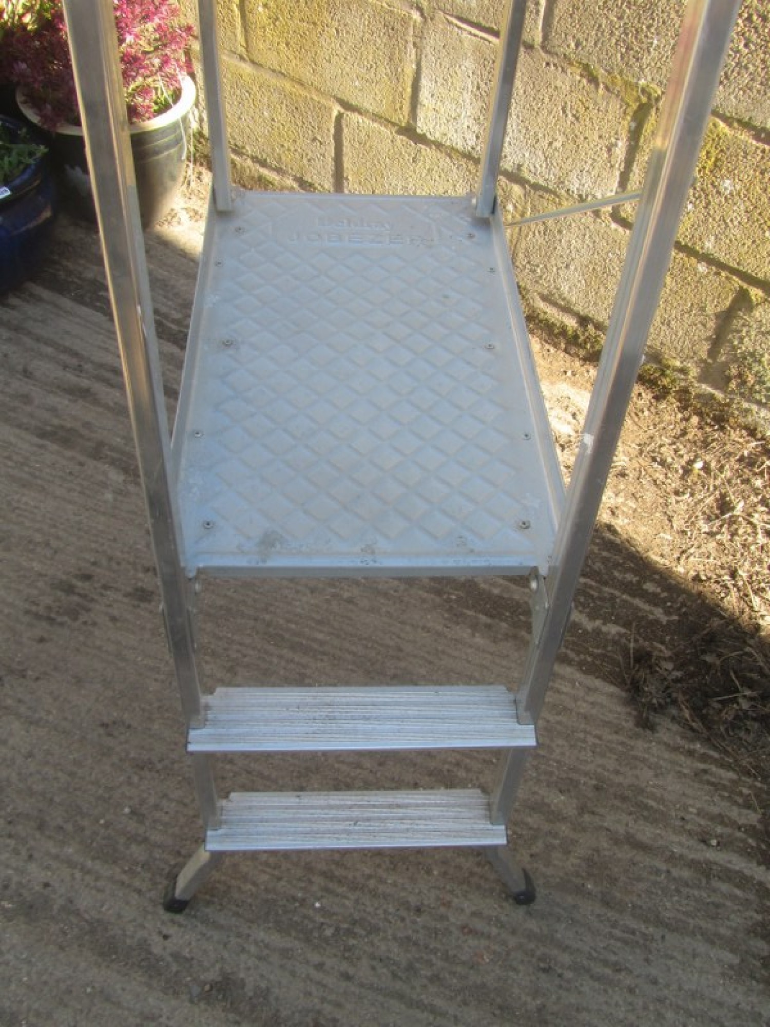 A SMALL SET OF STEP LADDERS WITH A STURDY PLATFORM, IDEAL FOR DECORATING. THEY ARE STURDY, MADE FROM METAL. LIGHTWEIGHT, THEY FOLD FLAT FOR STORAGE. IDEAL HEIGHT FOR CEILINGS. SOME WEAR AND OLD PAINT. INSTRUCTIONS FOR USE CAN BE DOWNLOADED ONLINE FROM THE MANUFACTURERS WEBSITE.