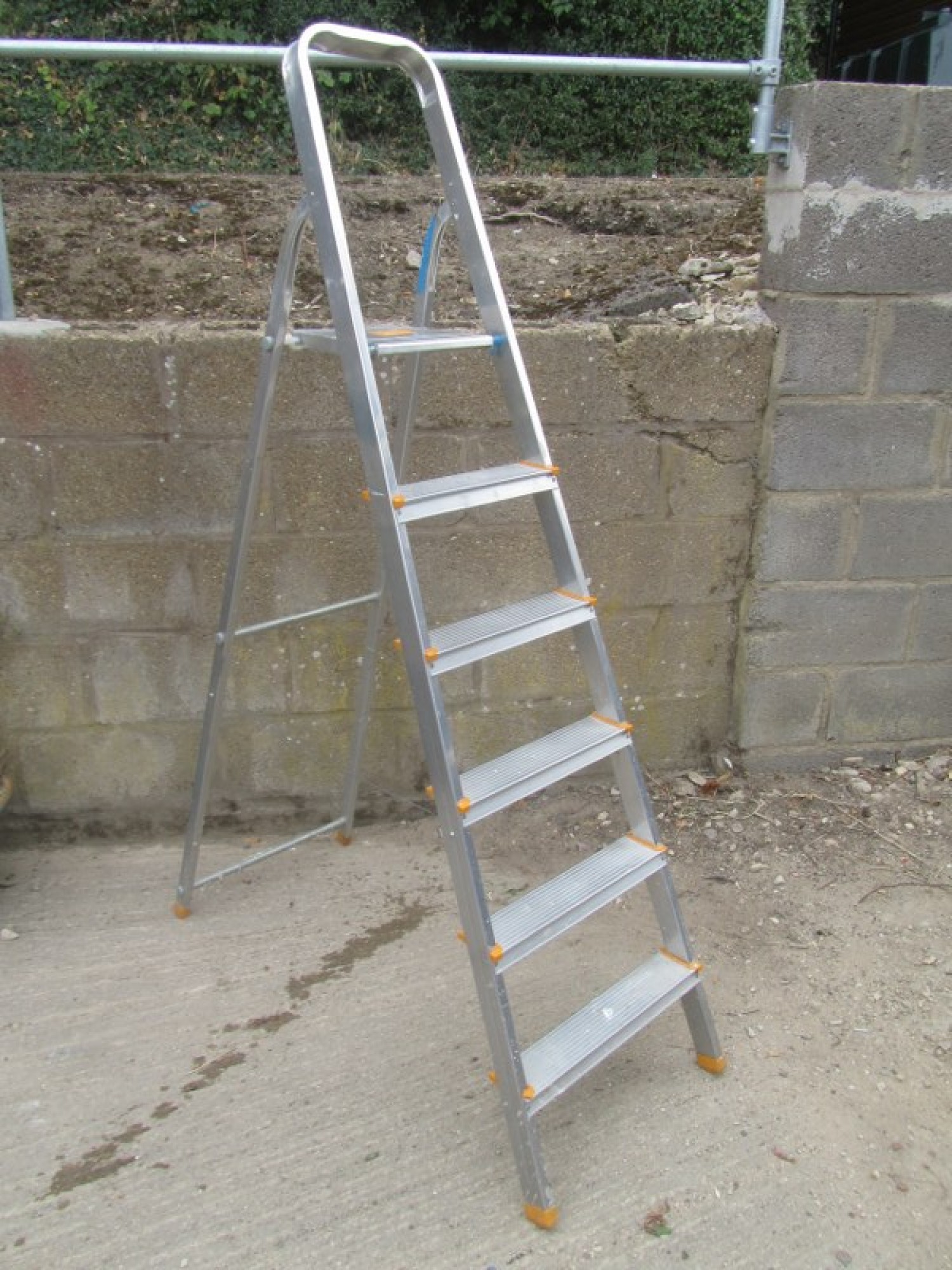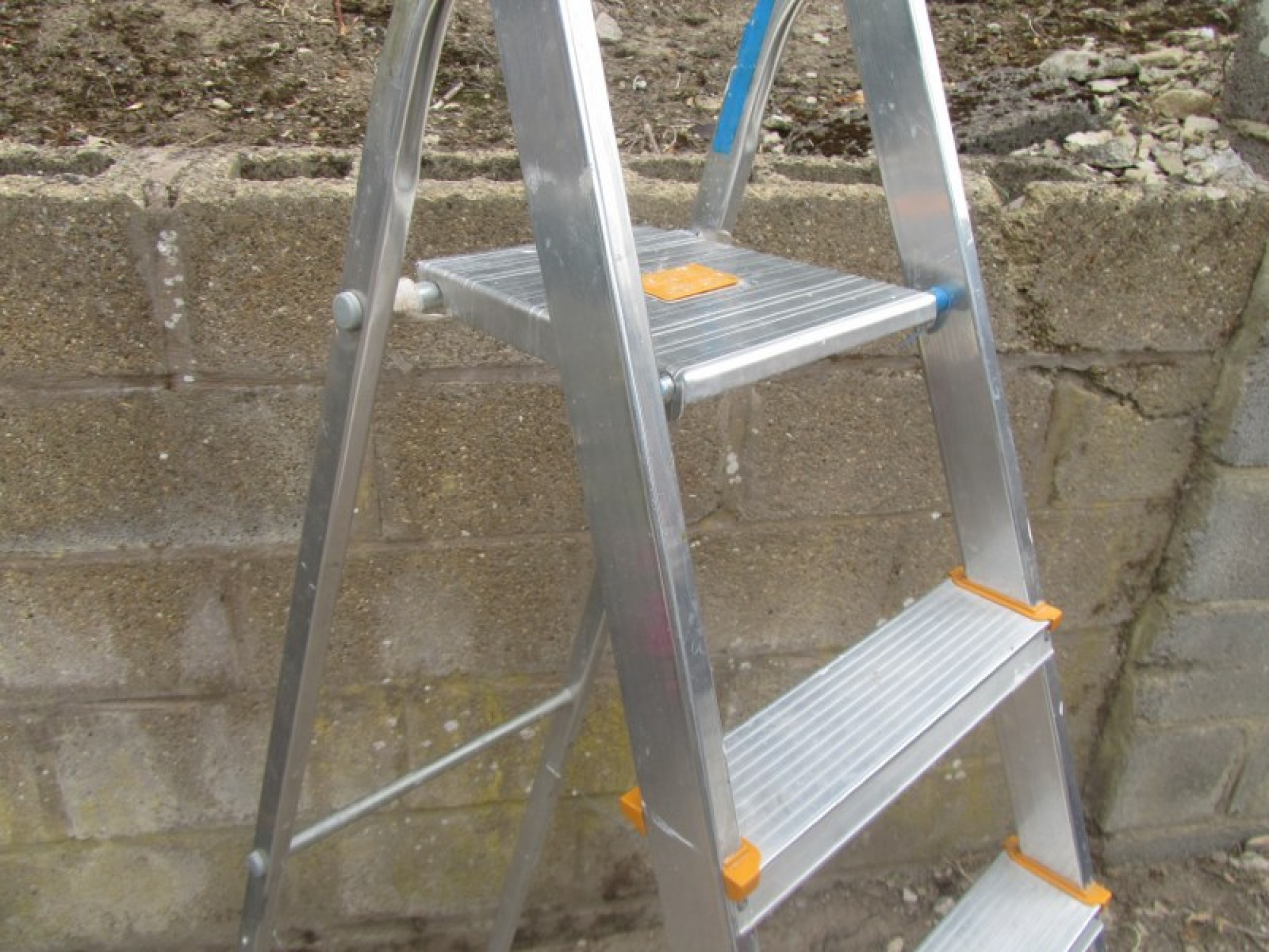 A TALL SET OF STEP LADDERS. THEY ARE STURDY, MADE FROM ALUMINIUM. LIGHTWEIGHT, THEY FOLD FLAT FOR STORAGE.