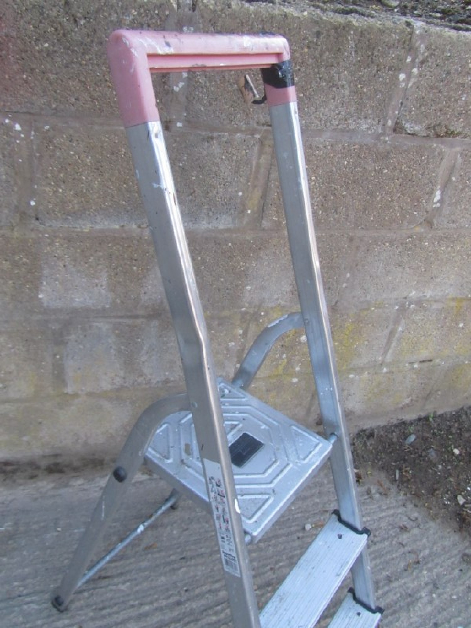 A SMALL SET OF STEP LADDERS. THEY ARE STURDY, MADE FROM ALUMINIUM. LIGHTWEIGHT, THEY FOLD FLAT FOR STORAGE. PAINT SPLASHES.