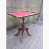 A SMALL TABLE ON 3 SPLAYED LEGS IN A MAHOGANY COLOUR, IT IS IN AVERAGE CONDITION. A REPRODUCTION OF A GEORGIAN TABLE. LEATHER EFFECT TOP. SOME VENEER IS MISSING ON ONE EDGE.