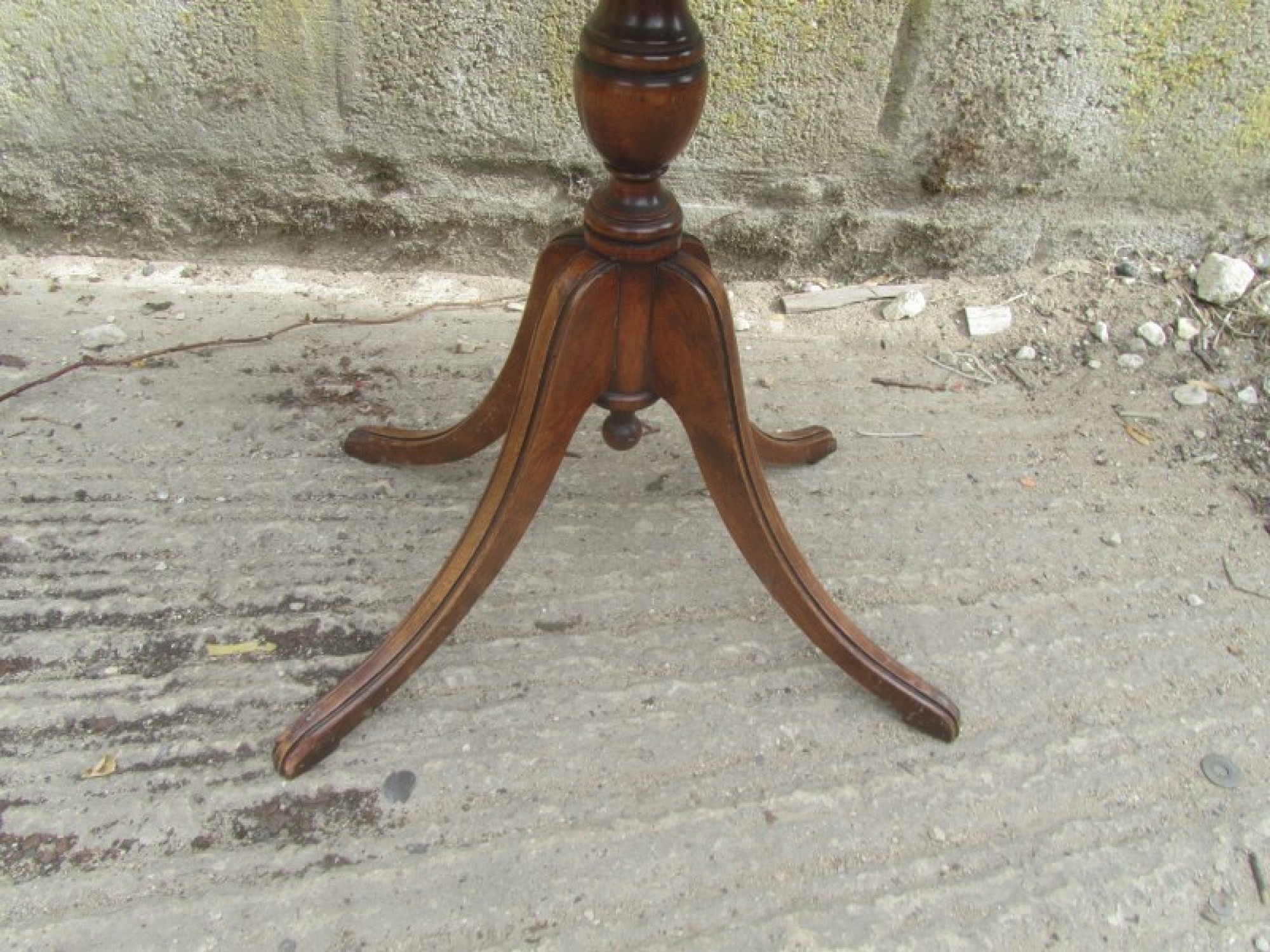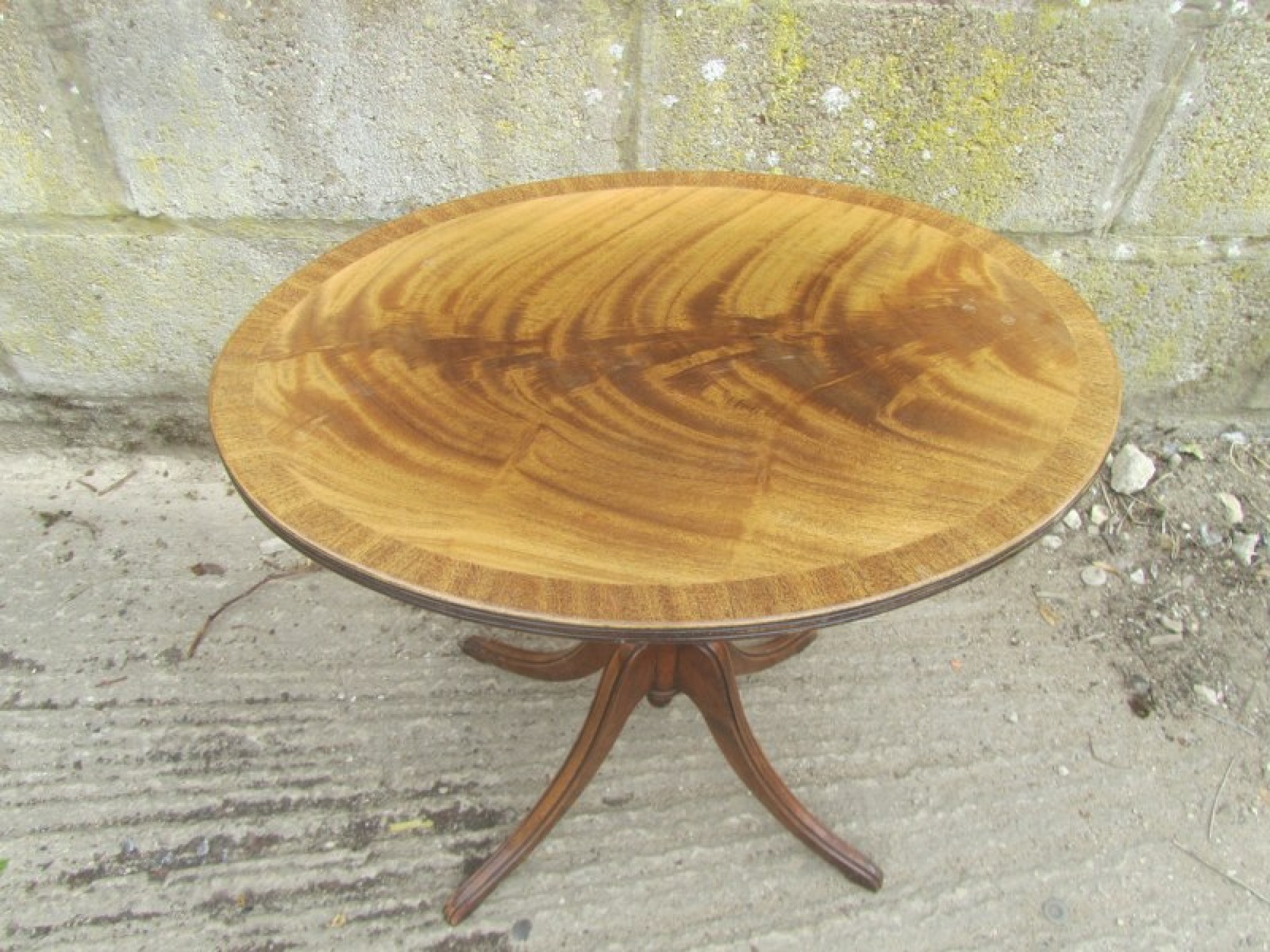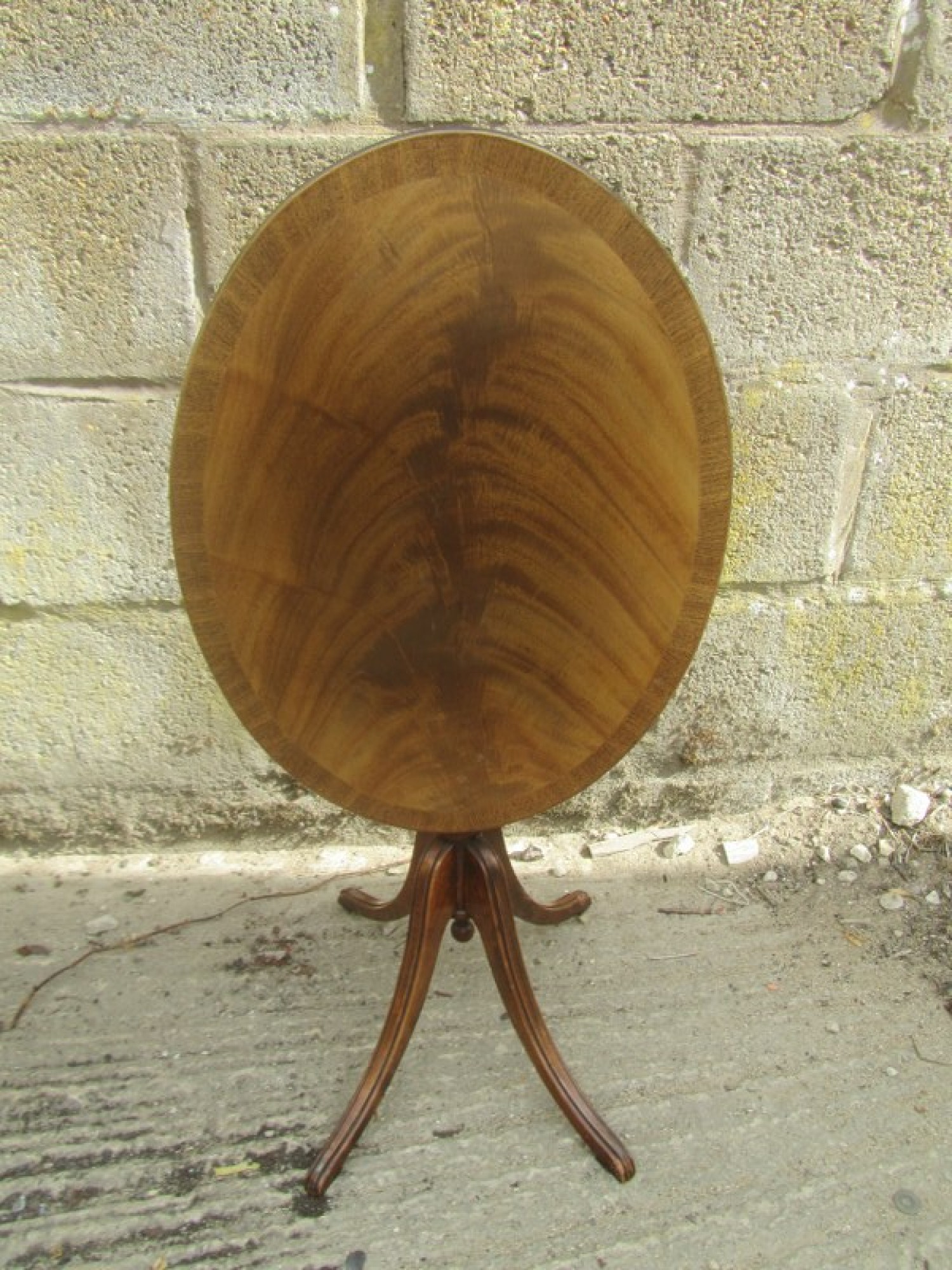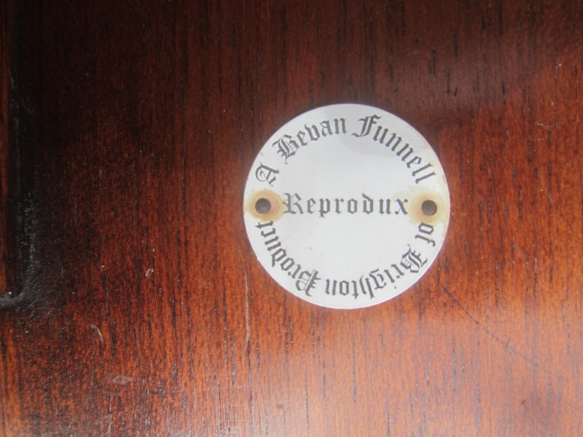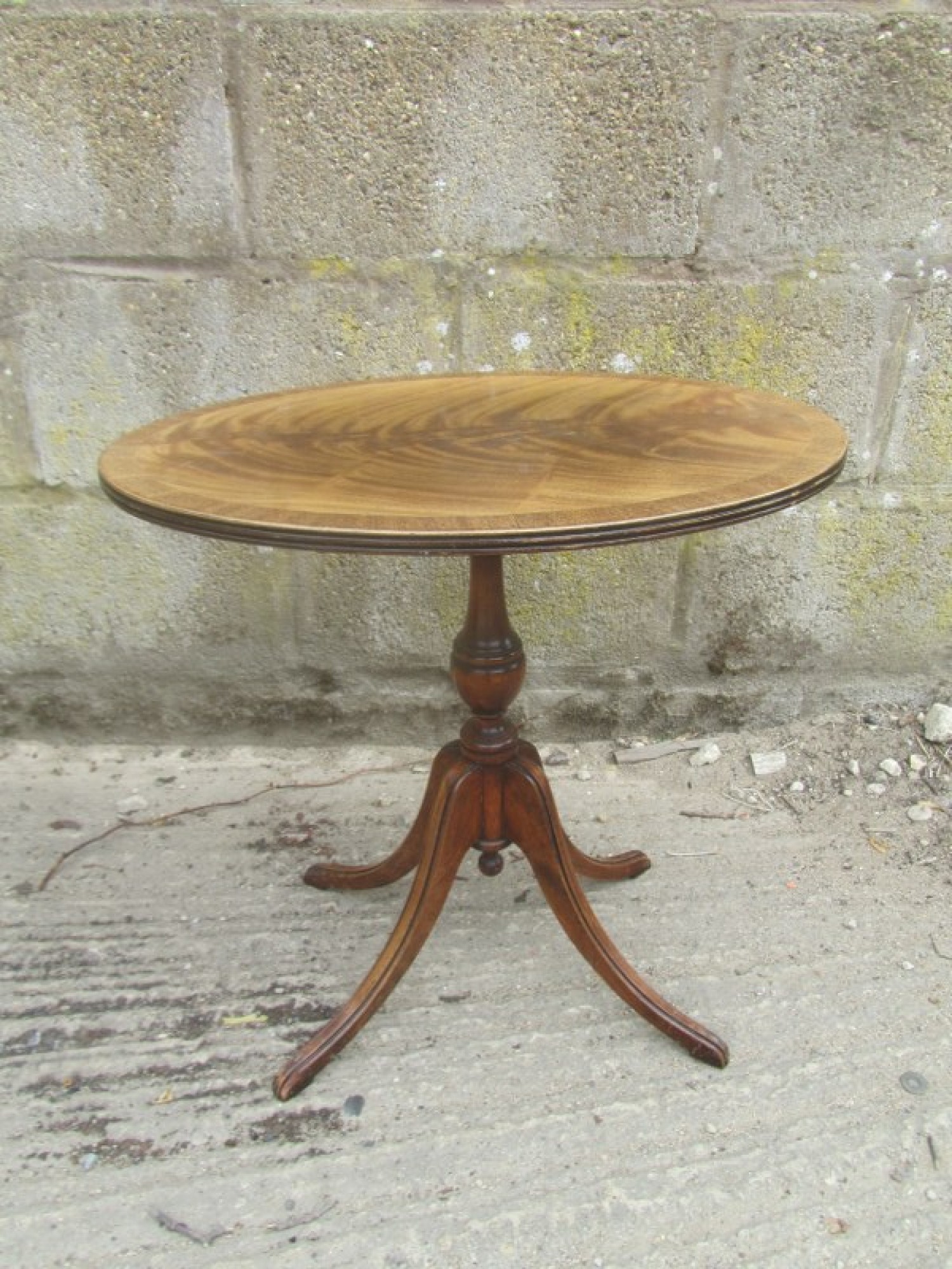 A SMALL TABLE ON 3 SPLAYED LEGS IN A MAHOGANY COLOURED WOOD, IT IS IN AVERAGE CONDITION. A REPRODUCTION OF A GEORGIAN TABLE. GOOD QUALITY. MADE BY BEVAN & FUNNEL. TILT TOP. FADED ON THE TOP.