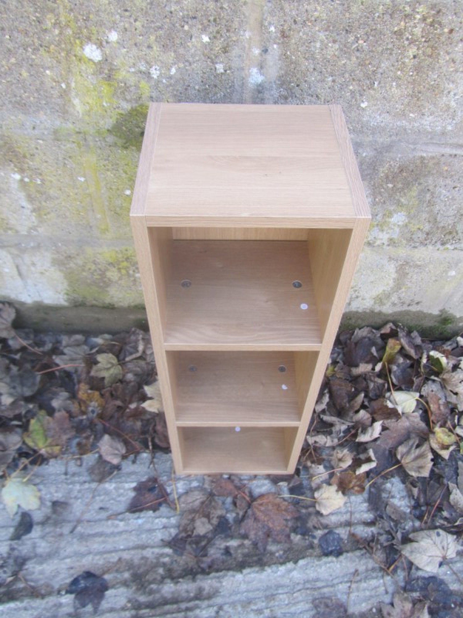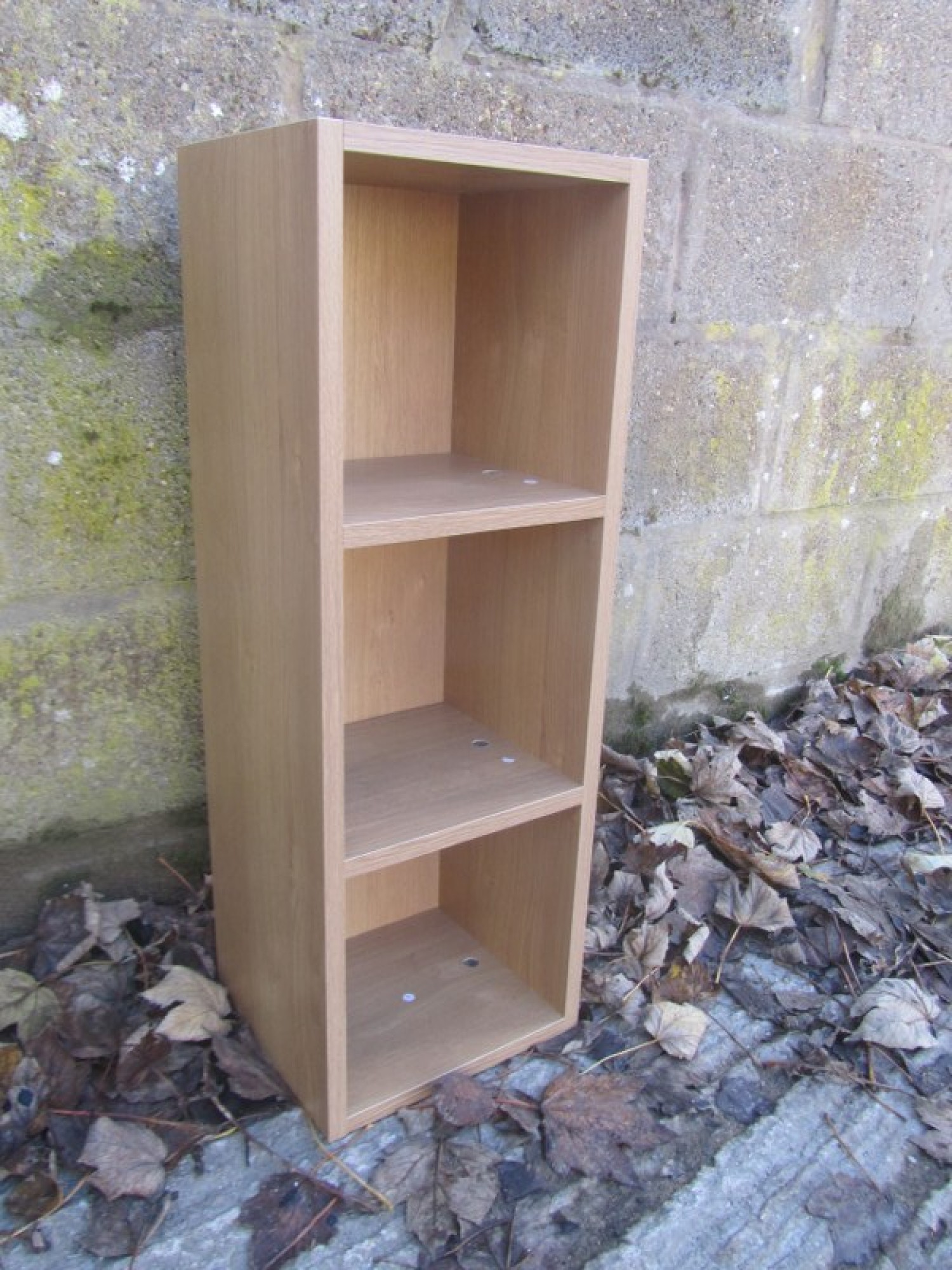 A SMALL BOOKCASE IN AN OAK EFFECT MELAMINE FINISH. BASIC CONSTRUCTION.