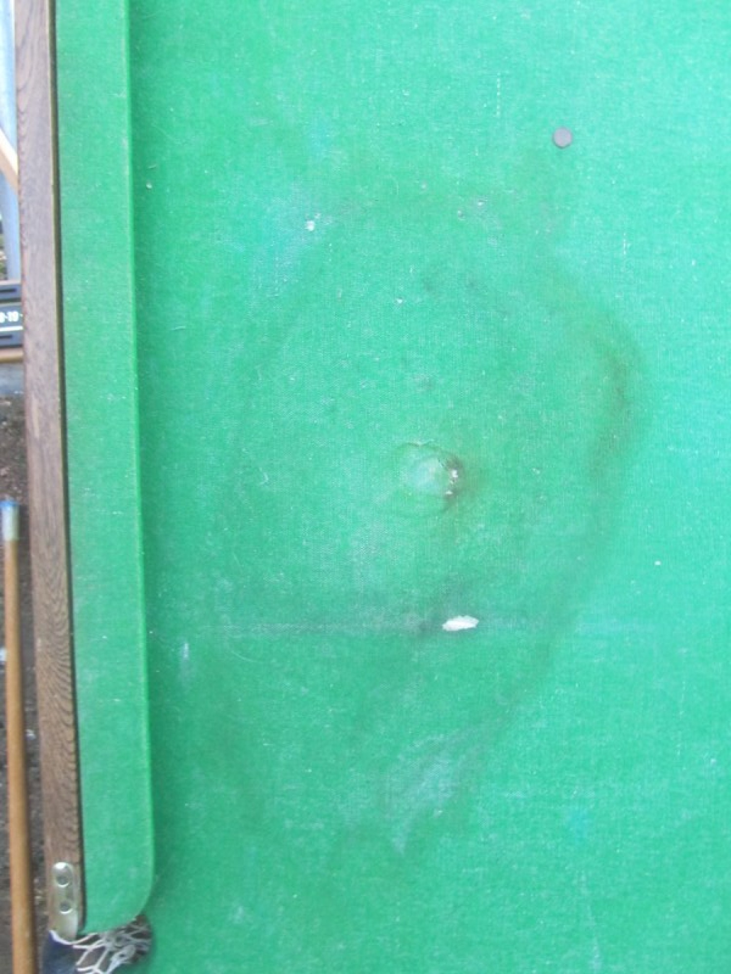 A SMALL POOL/SNOOKER TABLE. THE LEGS FOLD FLAT, BUT 2 OF THE LEG SUPPORTS ARE DAMAGED AND NEED REPAIR. THE FELT IS WORN, SOME STAINS/MARKS. THIS IS NOT A QUALITY POOL TABLE, IT IS A BASIC SMALL SET, IDEAL FOR TEENAGERS. IT INCLUDES 2 CUES, ONE TIP MISSING. THERE ARE A SET OF SMALL BALLS.