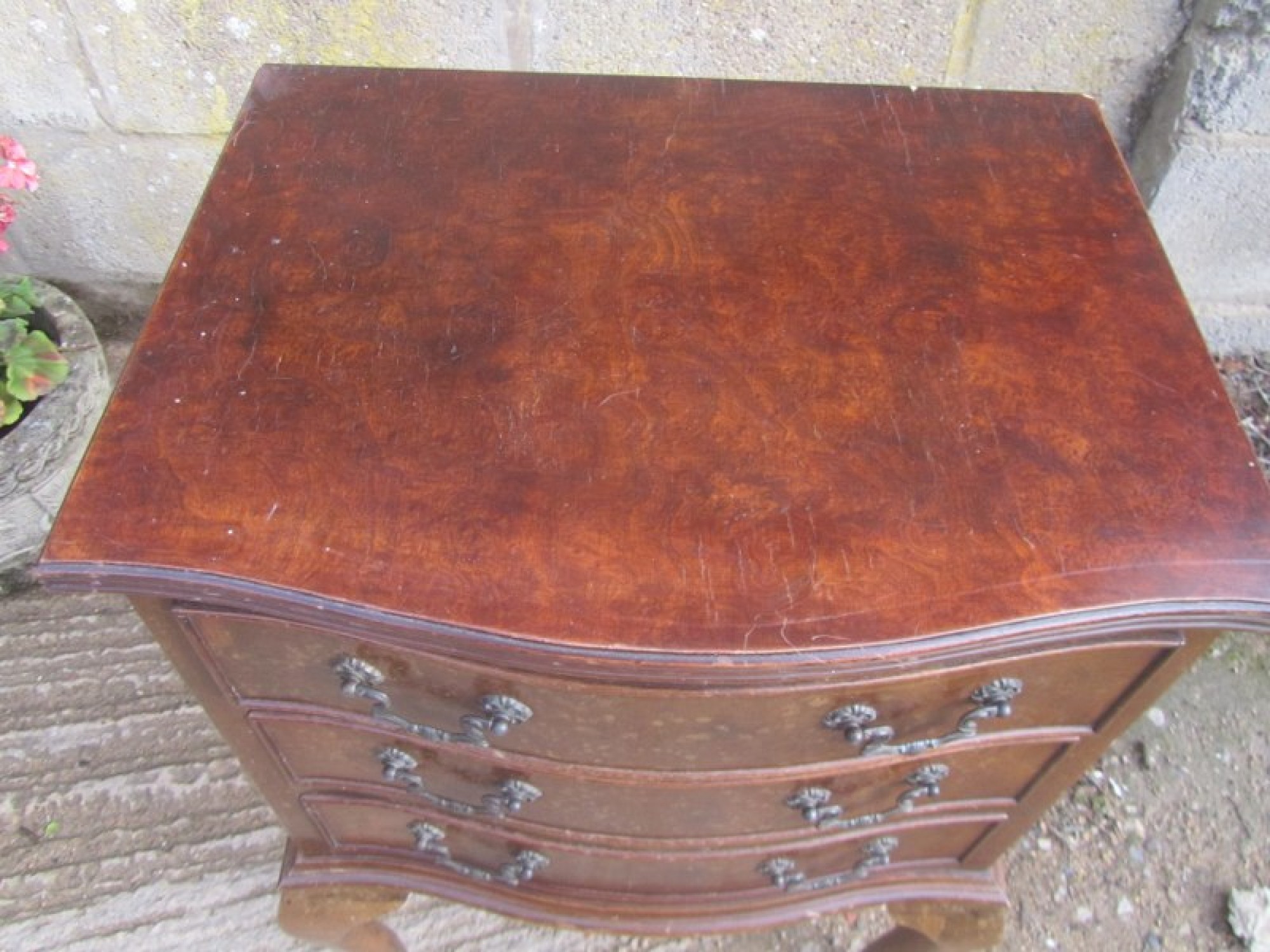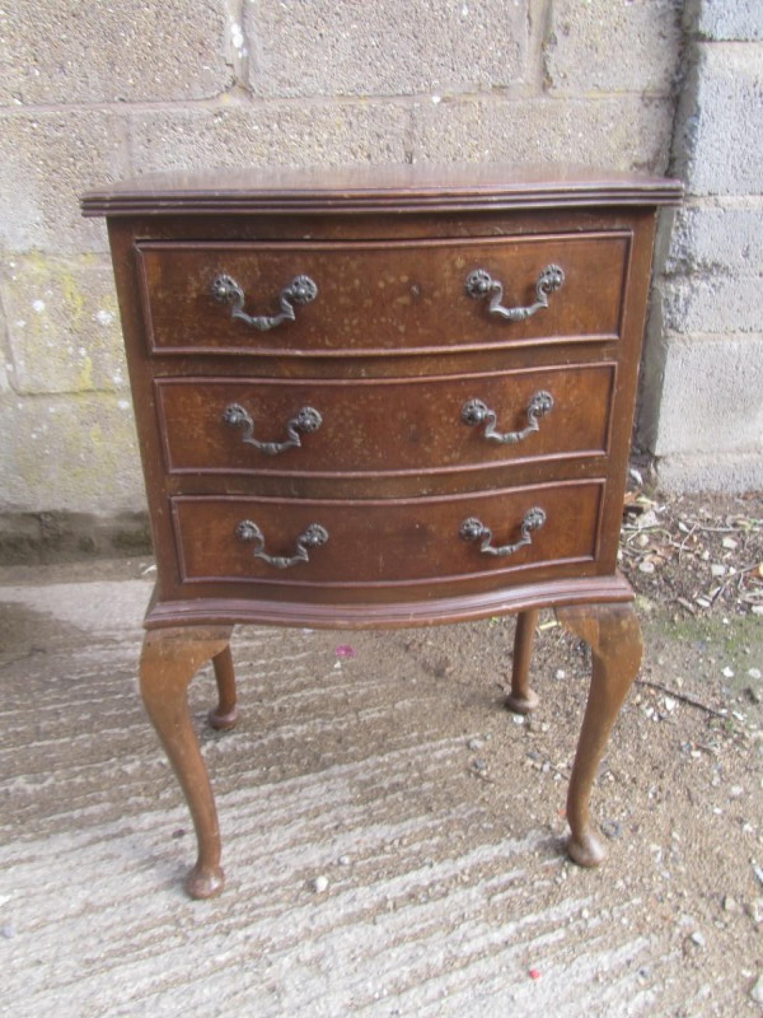 THIS IS A SMALL CHEST OF DRAWERS OR BEDSIDE CABINET, IT IS A QUALITY REPRODUCTION PIECE, VENEERED IN MAHOGANY. THERE ARE DRAWERS WITH ORIGINAL METAL HANDLES. IN A GEORGIAN REGENCY STYLE. MARKS AND WEAR ON THE DRAWER FRONTS.