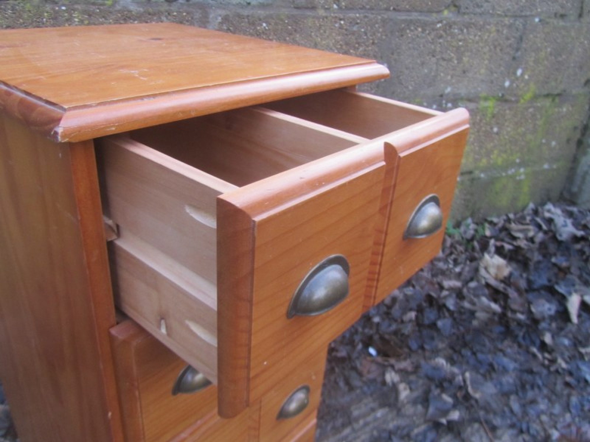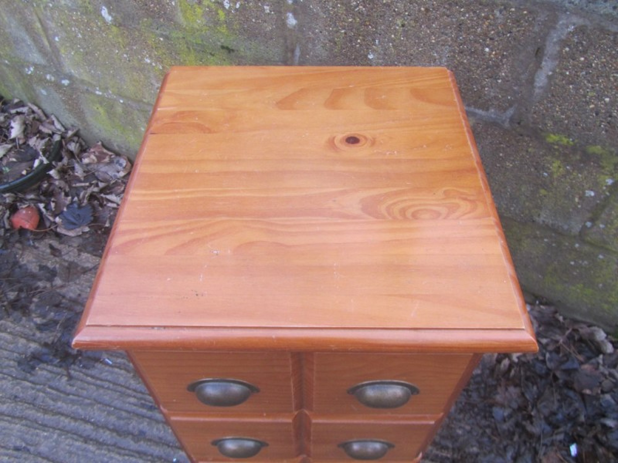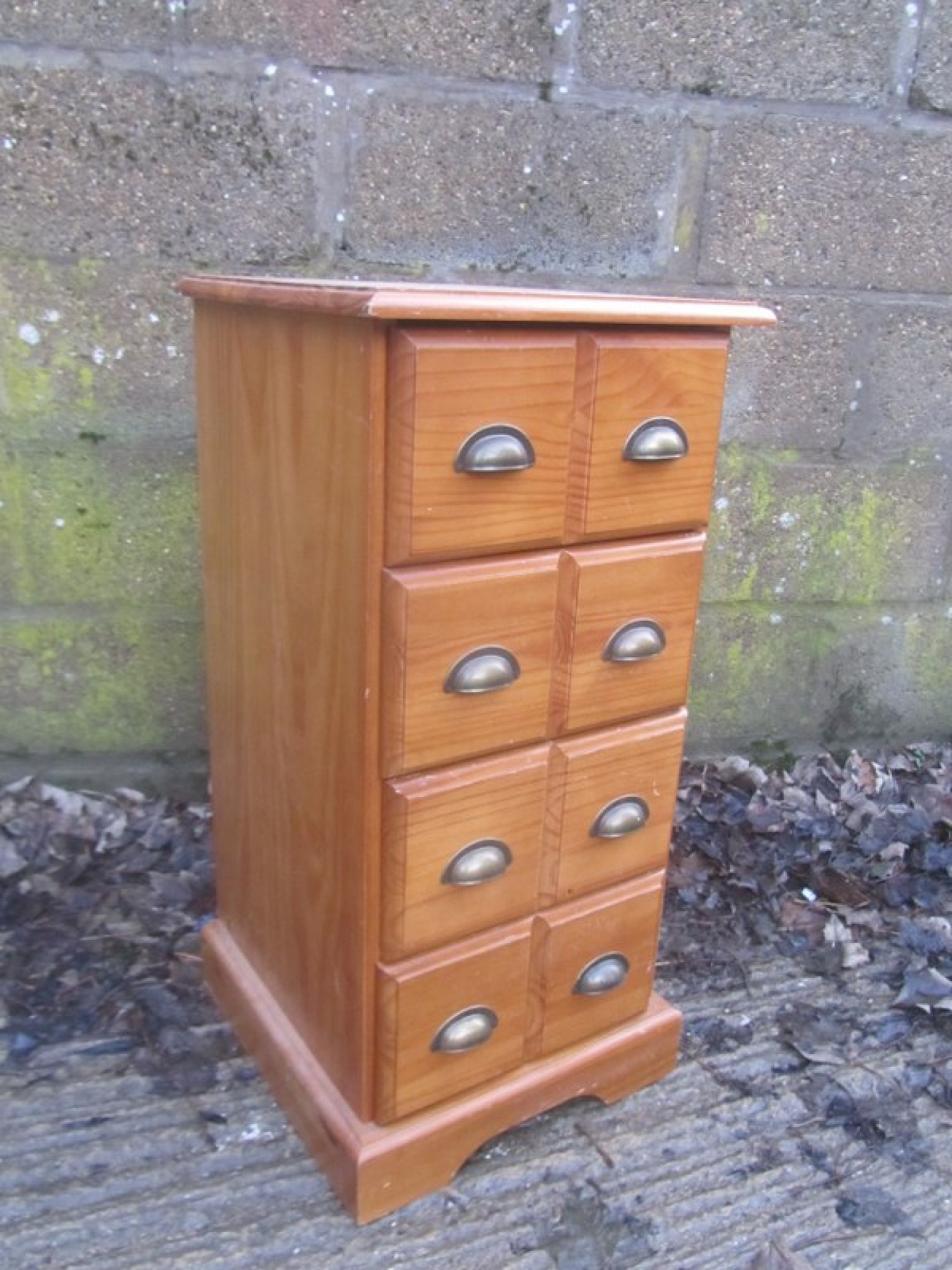 A SOLID PINE CABINET FOR STORING CDs. DAMAGED ON ONE CORNER.
