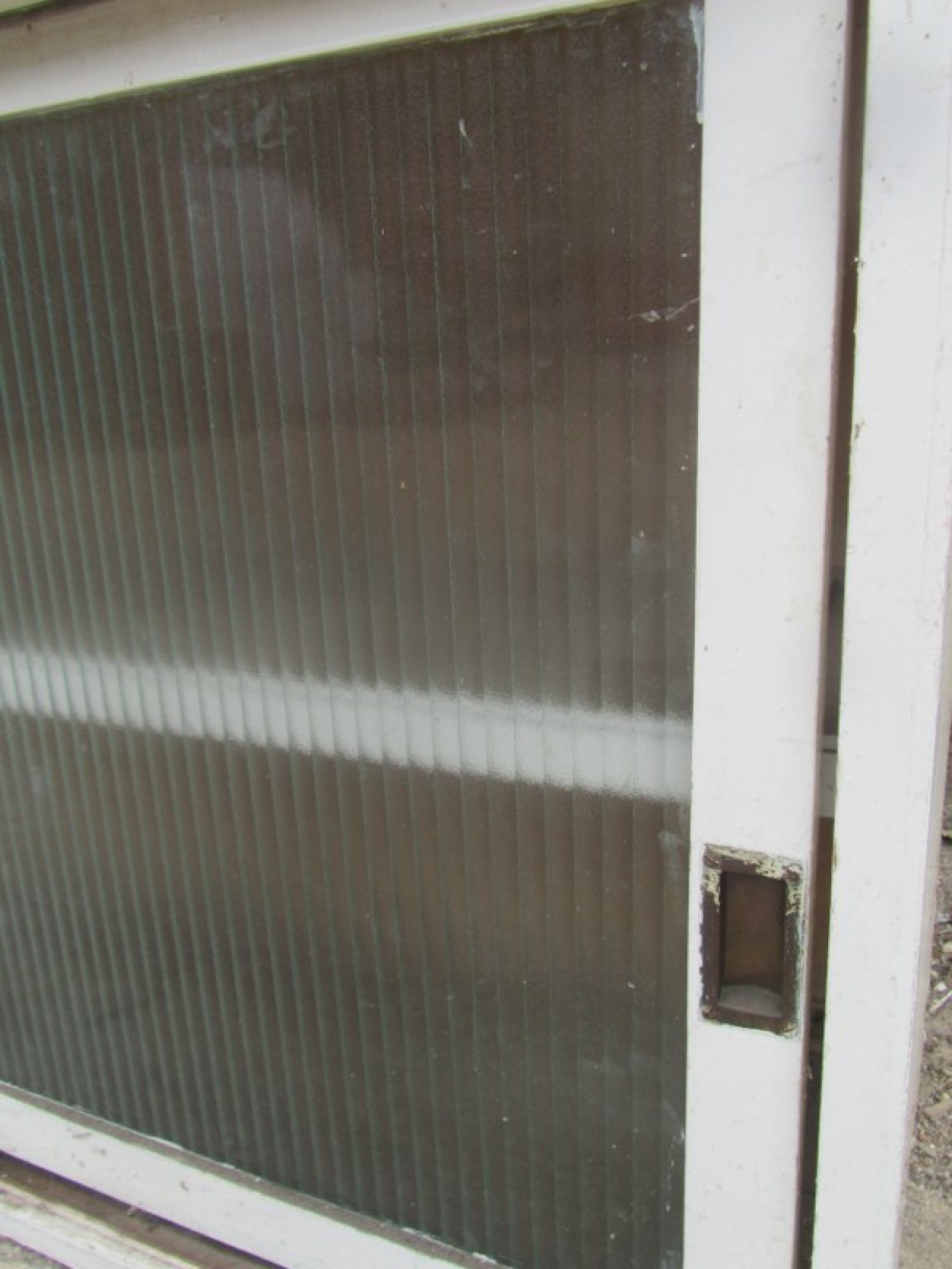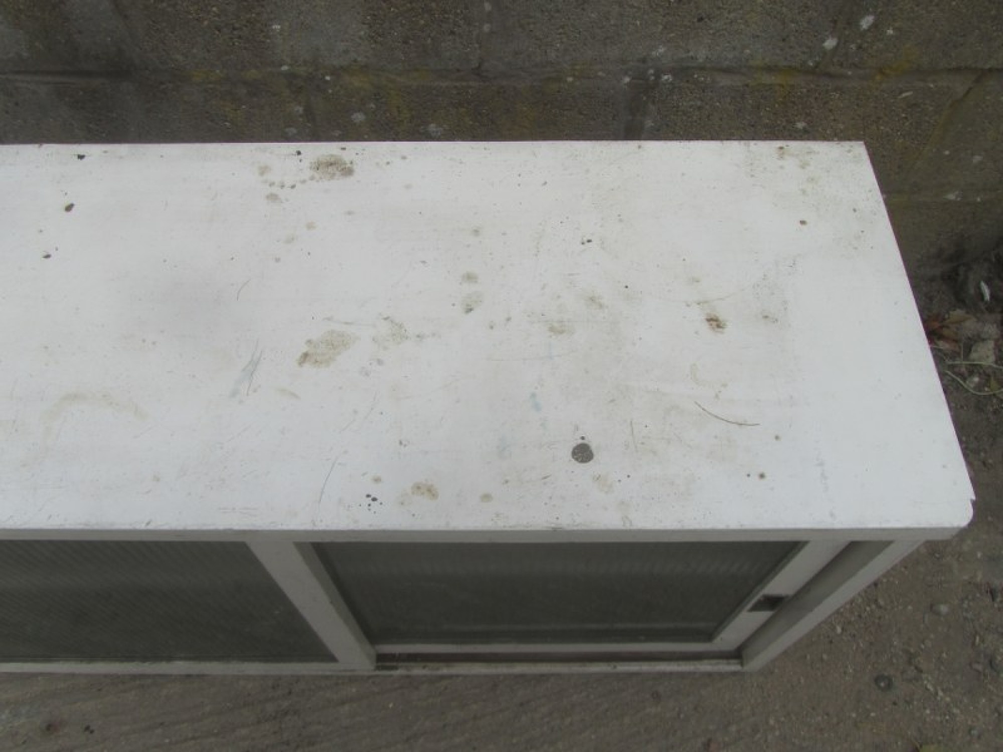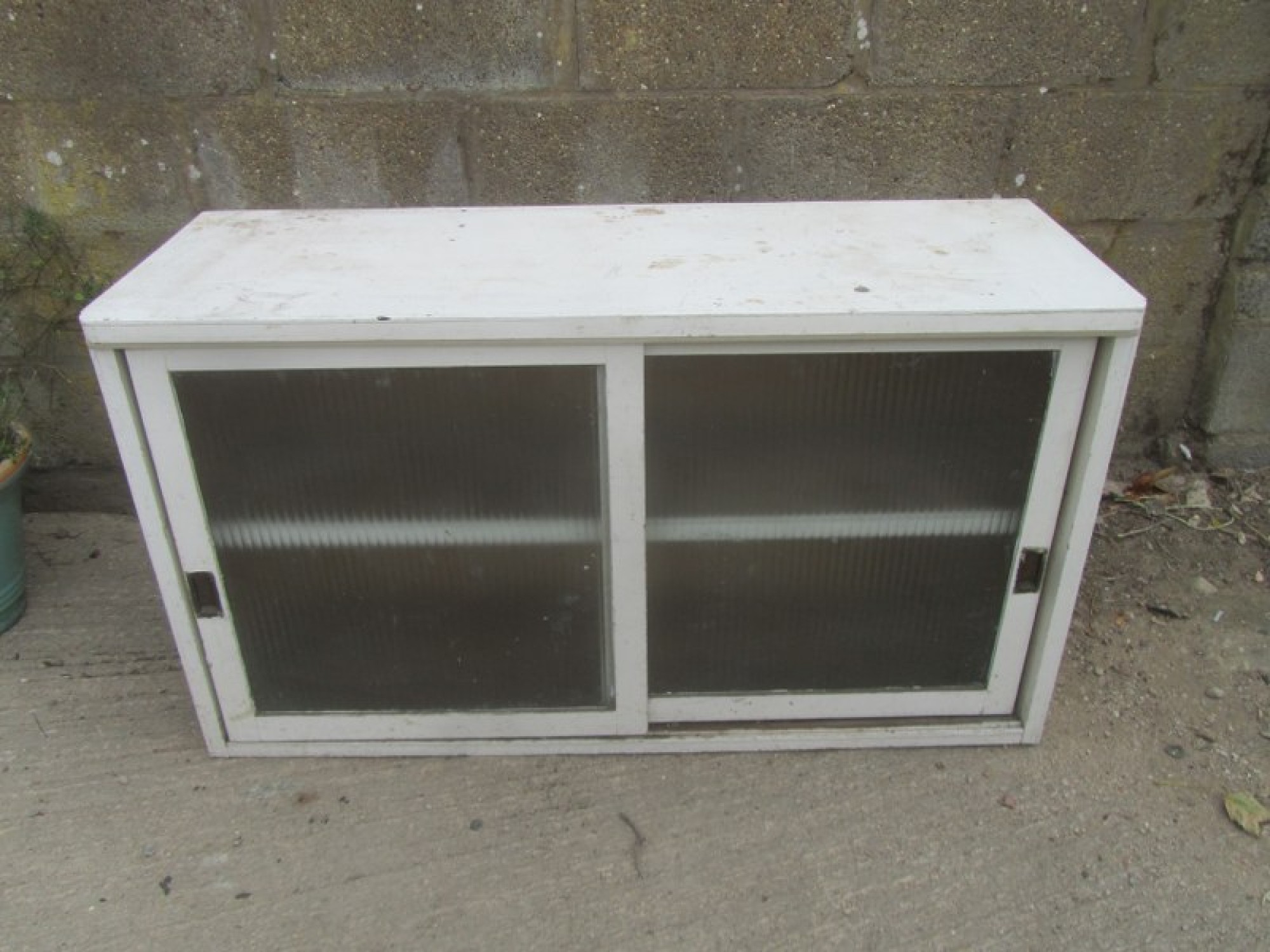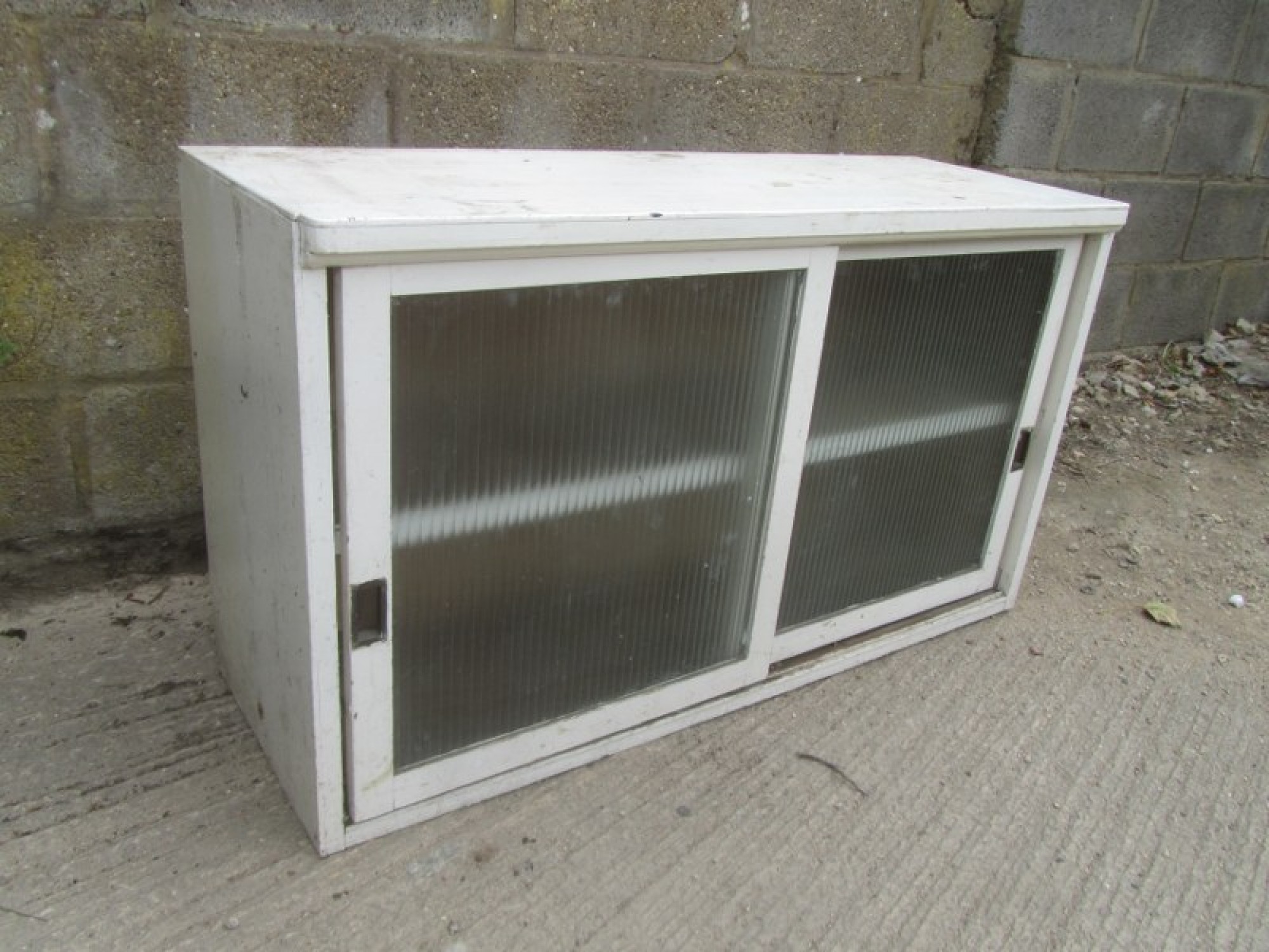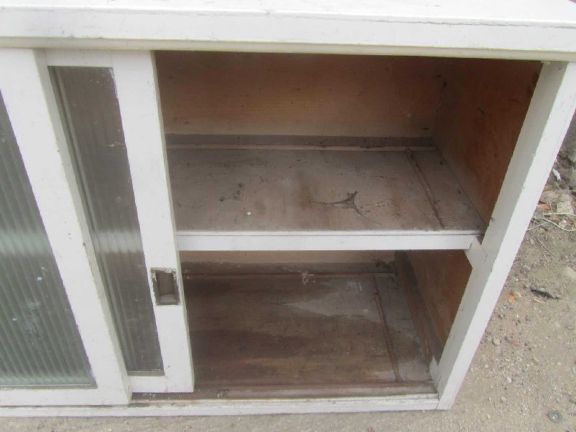 A PLYWOOD BOOKCASE, STRONG AND STURDY WITH SHELVES INSIDE. PAINTED WHITE A LONG TIME AGO. THE FRONT HAS 2 SLIDING GLASS DOORS. IT HAS BEEN USED IN AN OUTBUILDING FOR DECADES. IS WORN, STAINED AND FADED. IT HAS SUFFERED WITH WOOD WORM IN THE PAST, IT IS PROBABLY LONG DEAD! BUT I WOULD RECOMMEND TREATING IT TO BE SURE.