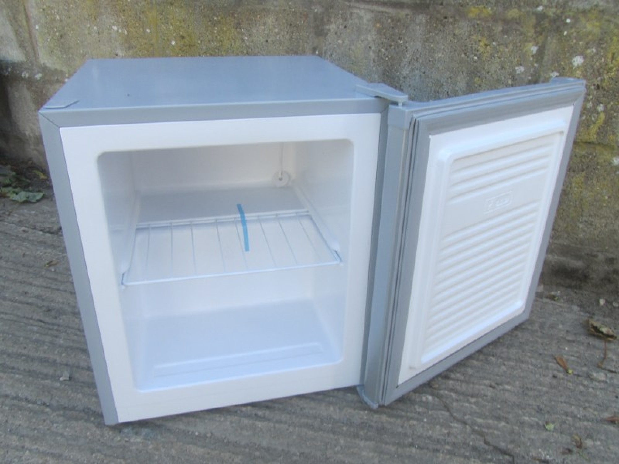 A SMALL TABLE TOP FREEZER. IT IS SILVER, INSIDE THERE IS A SHELF.