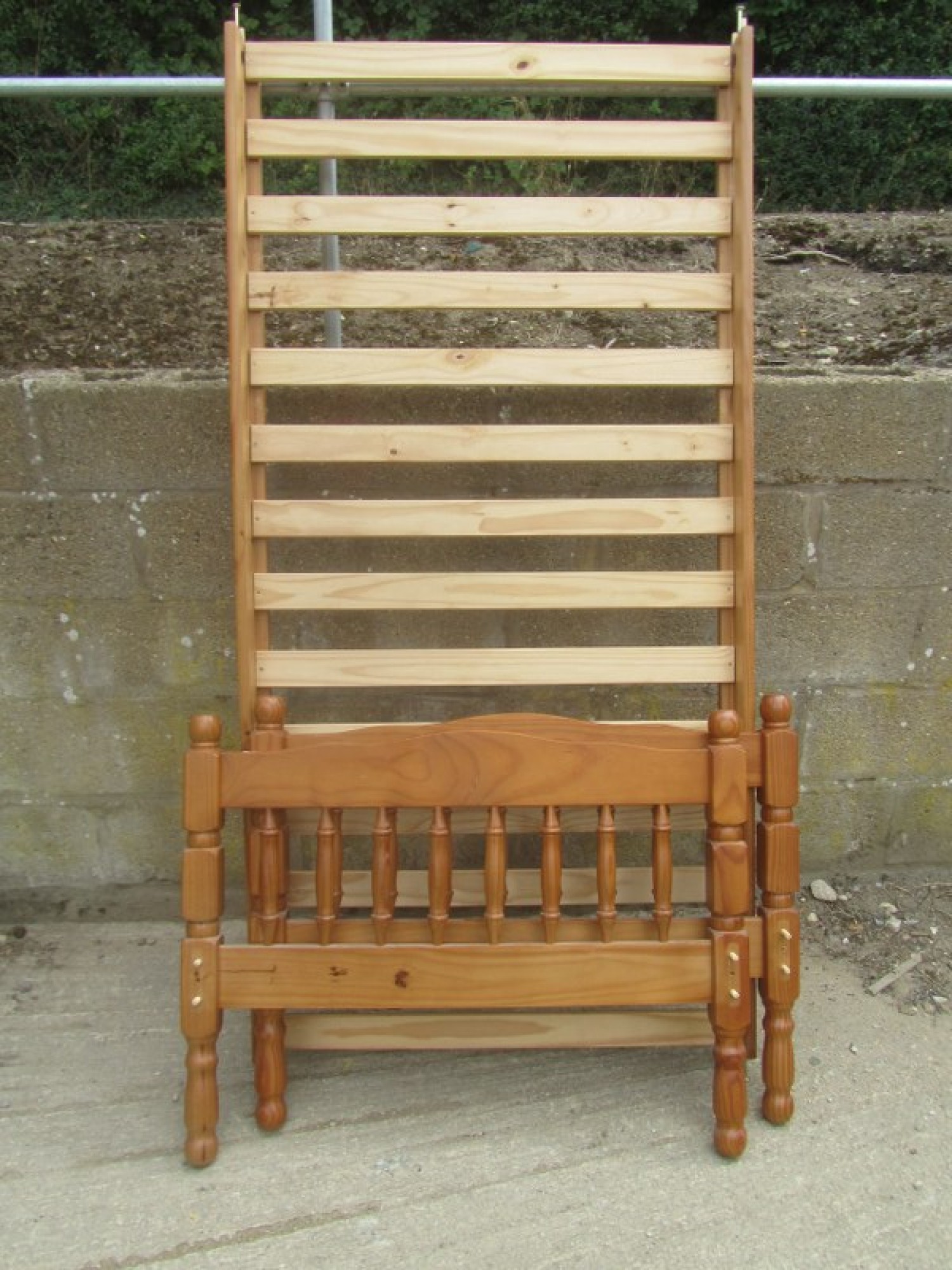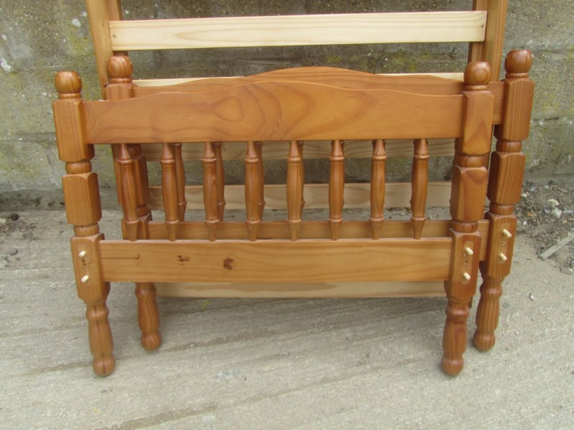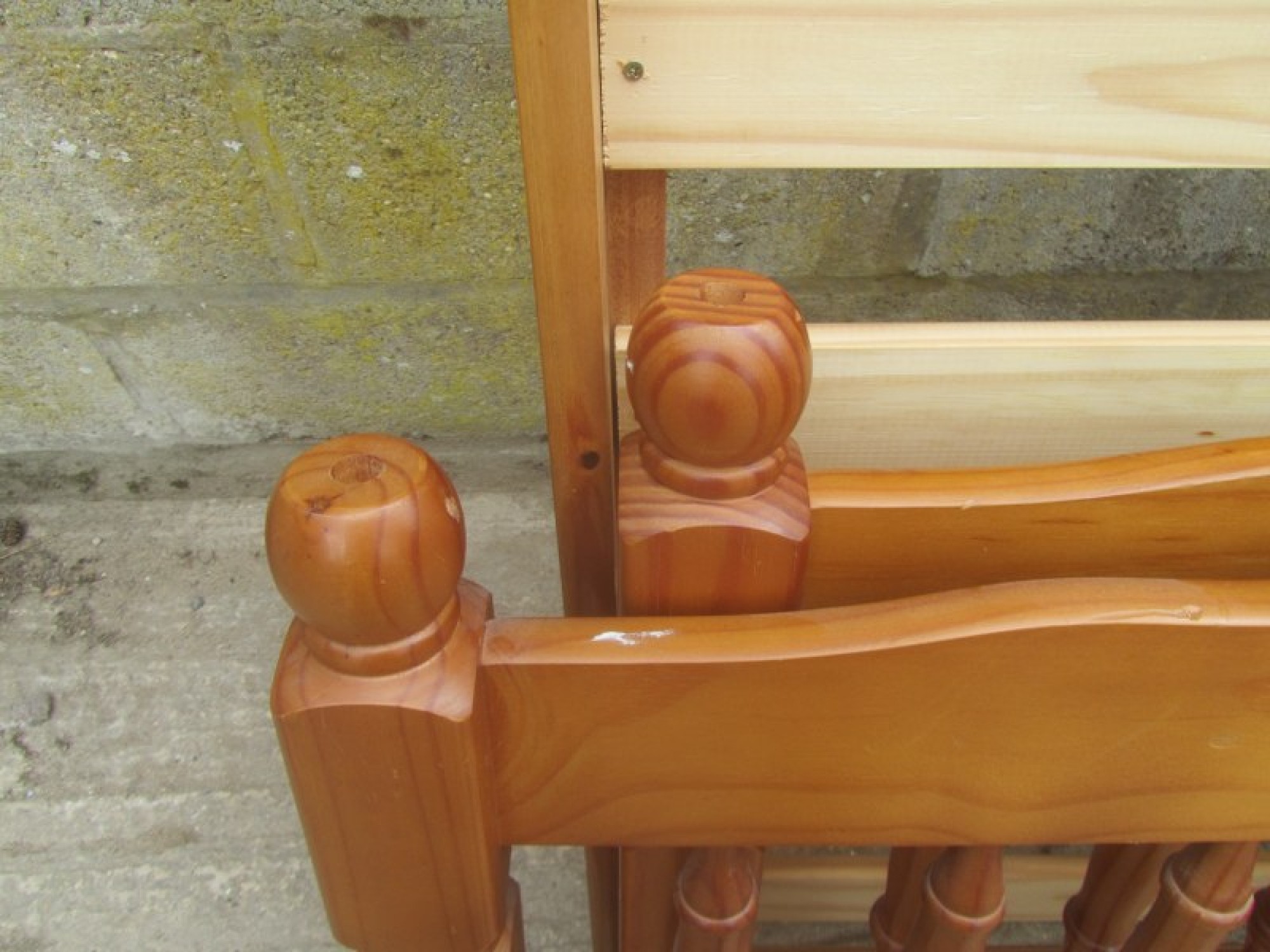 A STURDY 3' SINGLE BED FRAME MADE FROM SOLID PINE, IT IS FLATPACKED AND READY FOR COLLECTION. IN AVERAGE CONDITION. SOME SCUFFS. IT HAS BEEN A BUNK BED, THERE ARE SOME HOLES IN THE WOOD FROM THE FITTINGS.