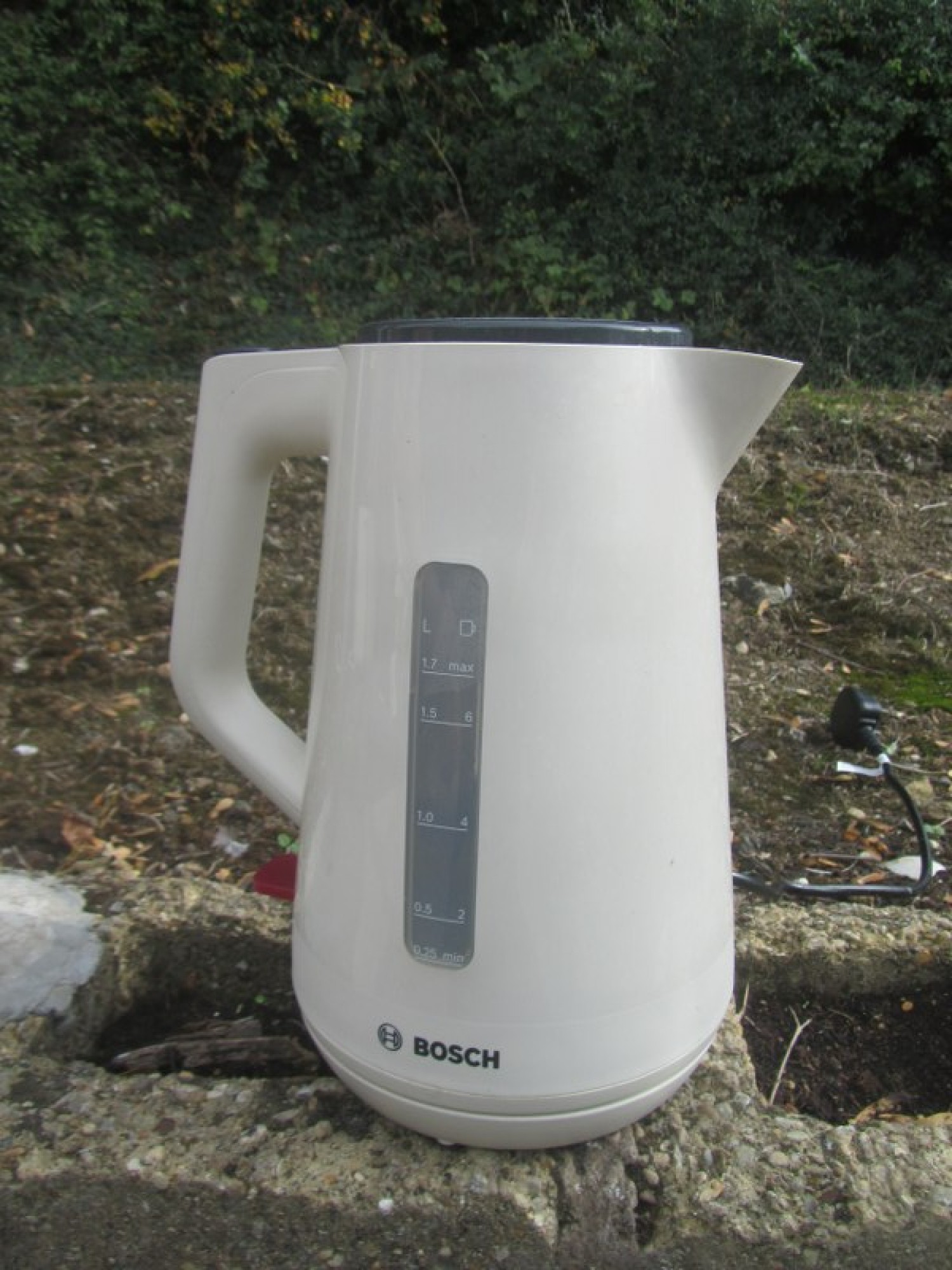 A CORDLESS KETTLE MADE BY BOSCH IN A CREAM FINISH.