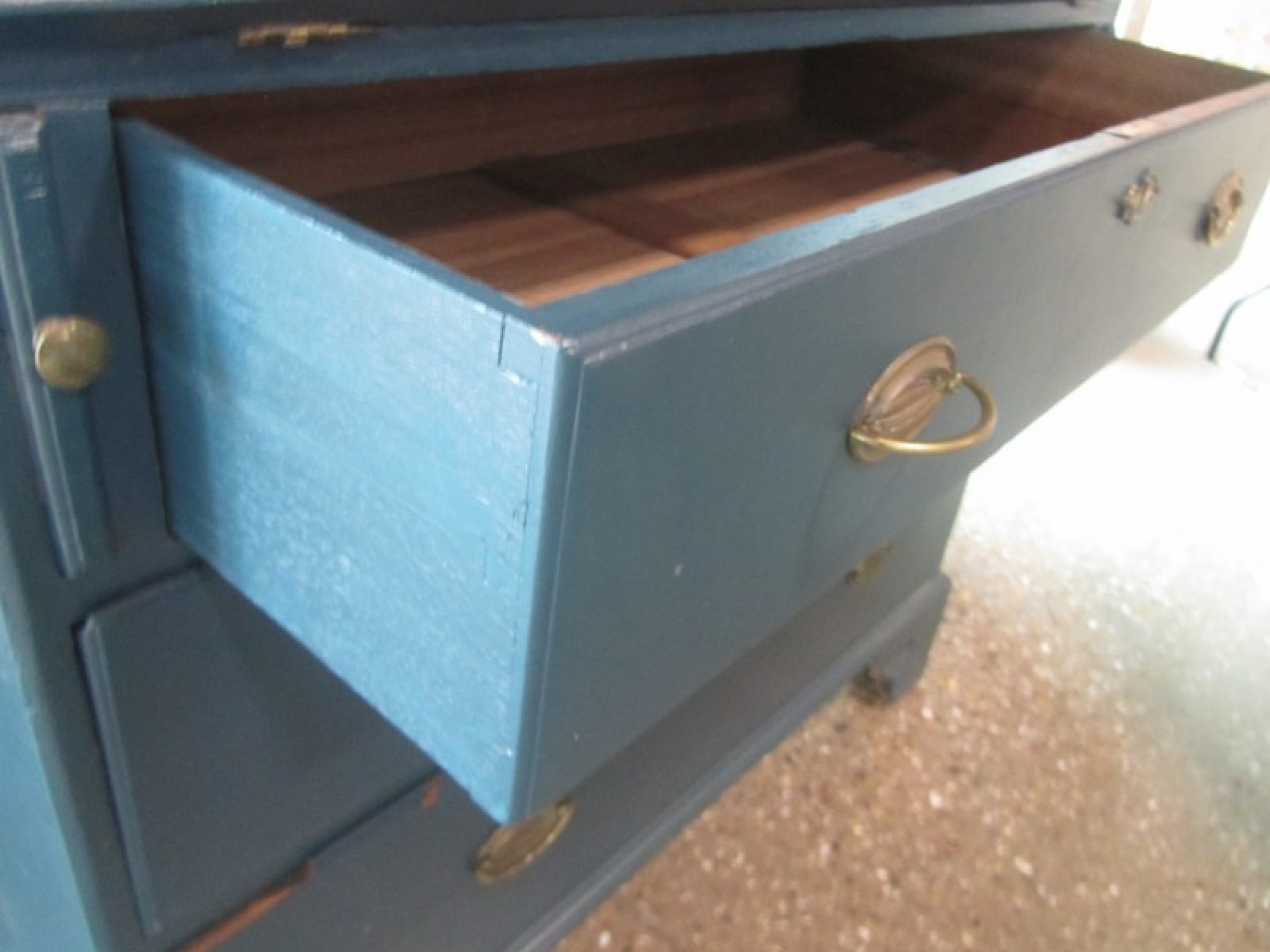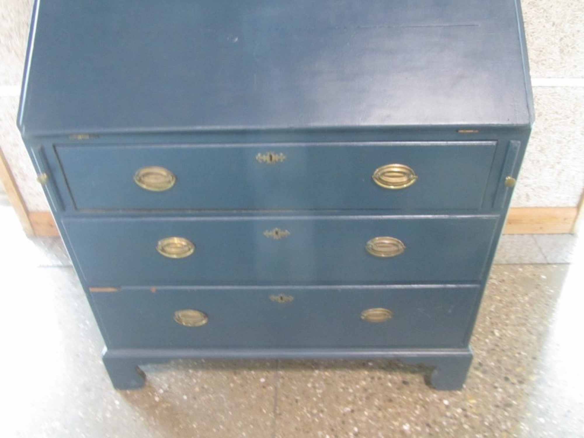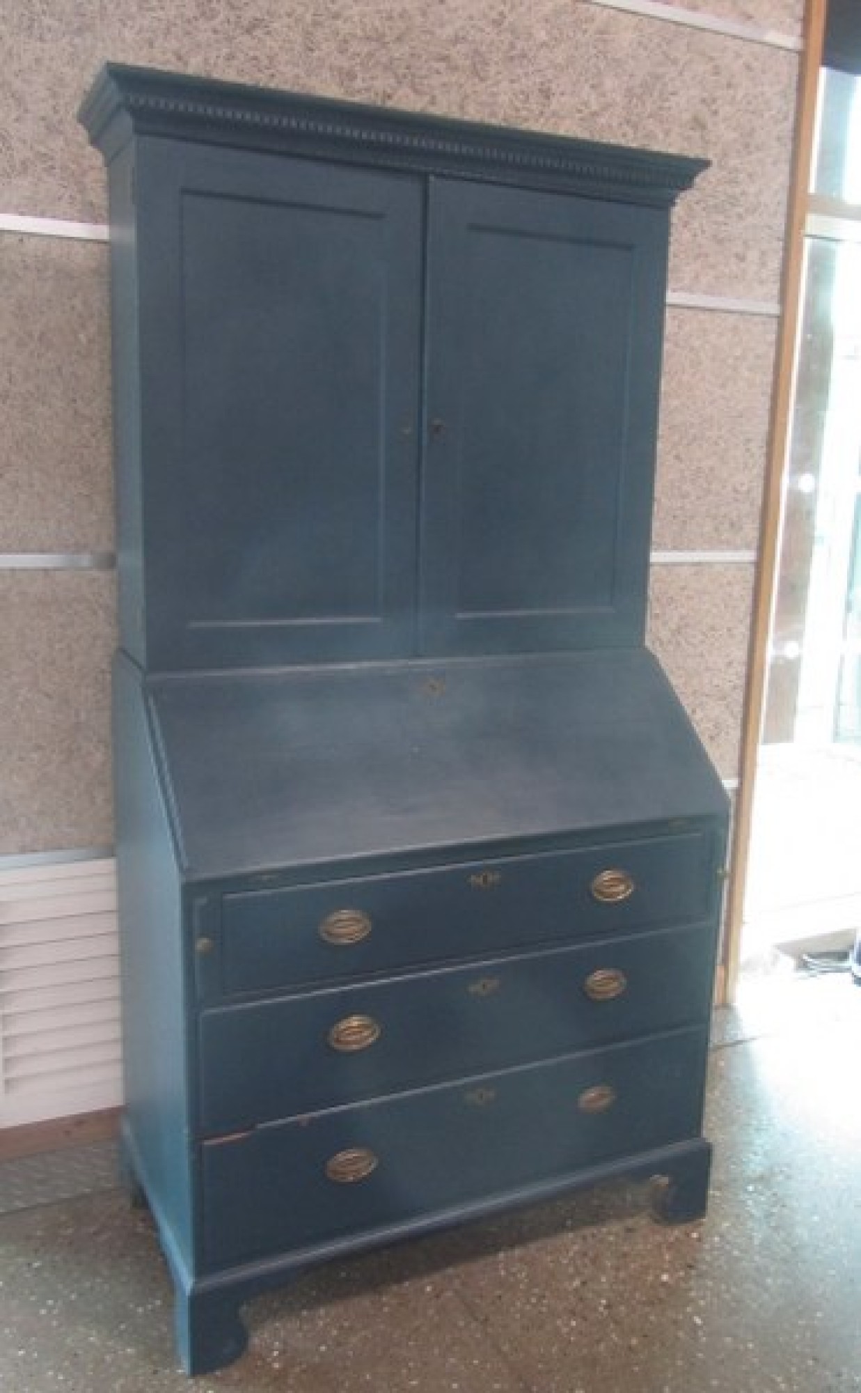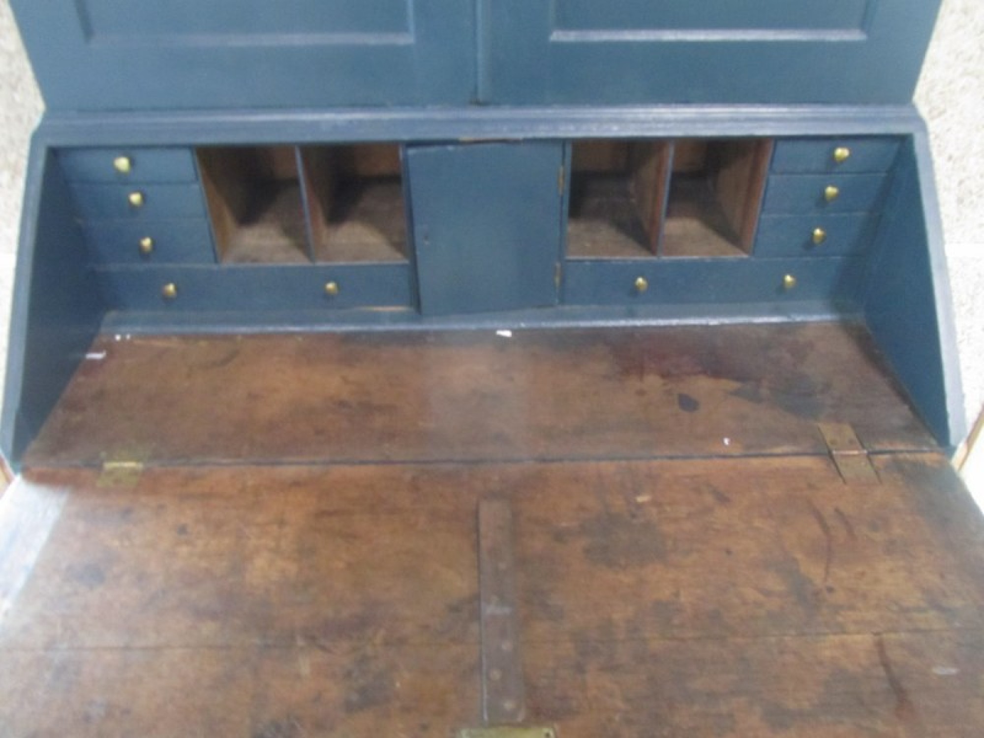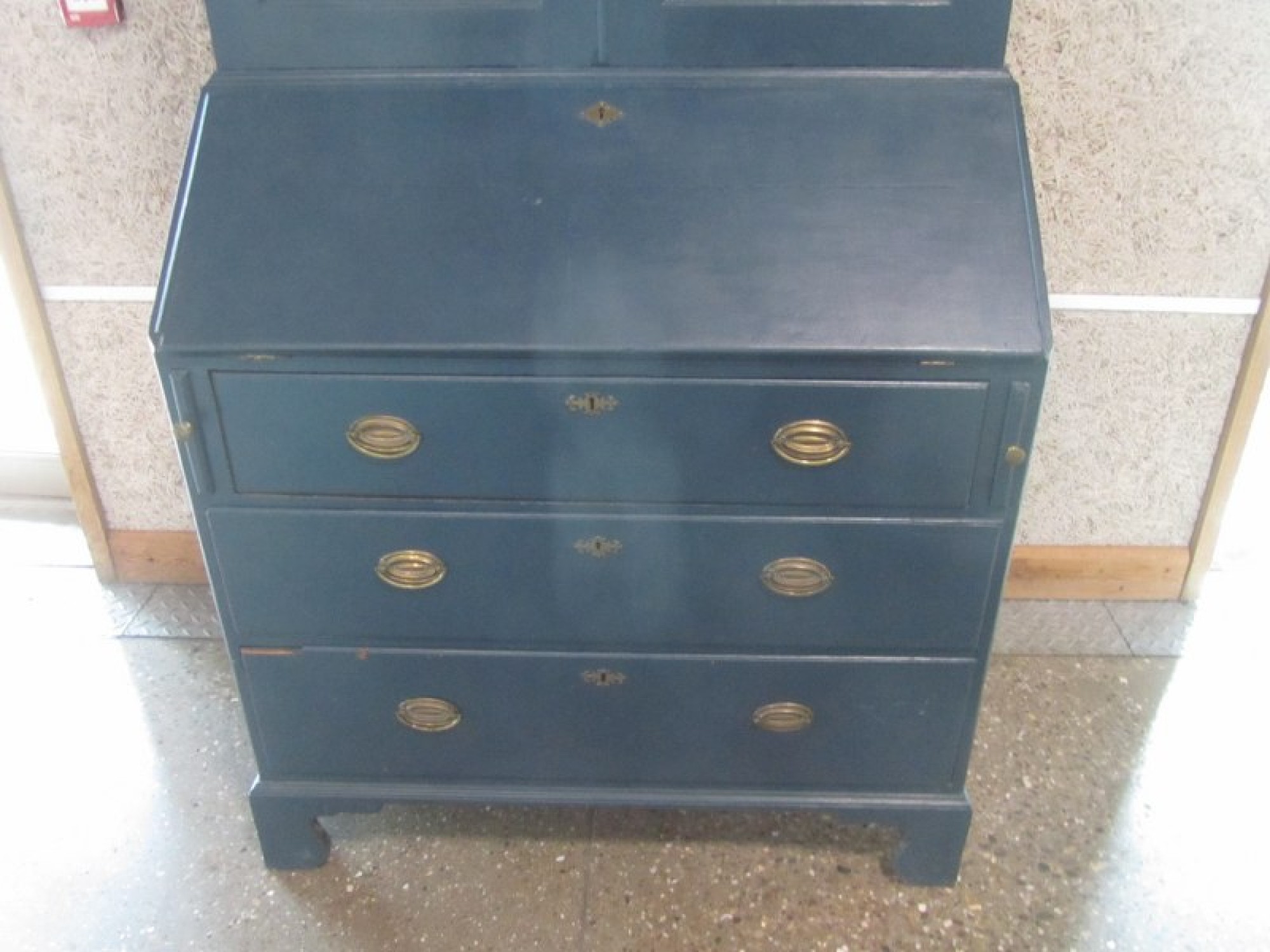 THIS IS A TALL BUREAU BOOKCASE, IT IS A QUALITY PIECE FROM THE VICTORIAN PERIOD. IT IS SOLID OAK, PAINTED IN A RICH BLUE COLOUR. THE TOP SECTION IS A BOOKCASE WITH ADJUSTABLE SHELVES, WITH LOCK AND KEY.
