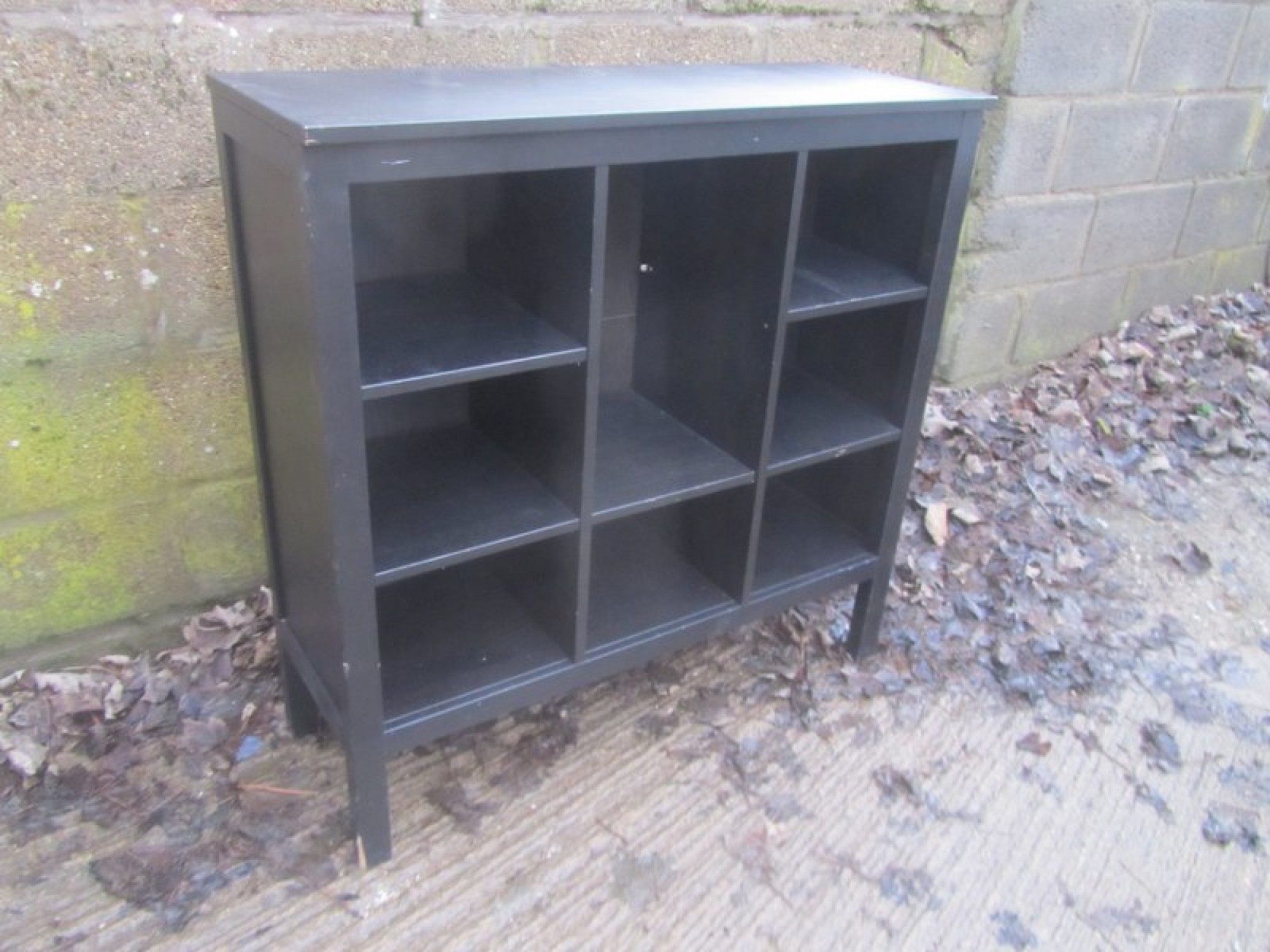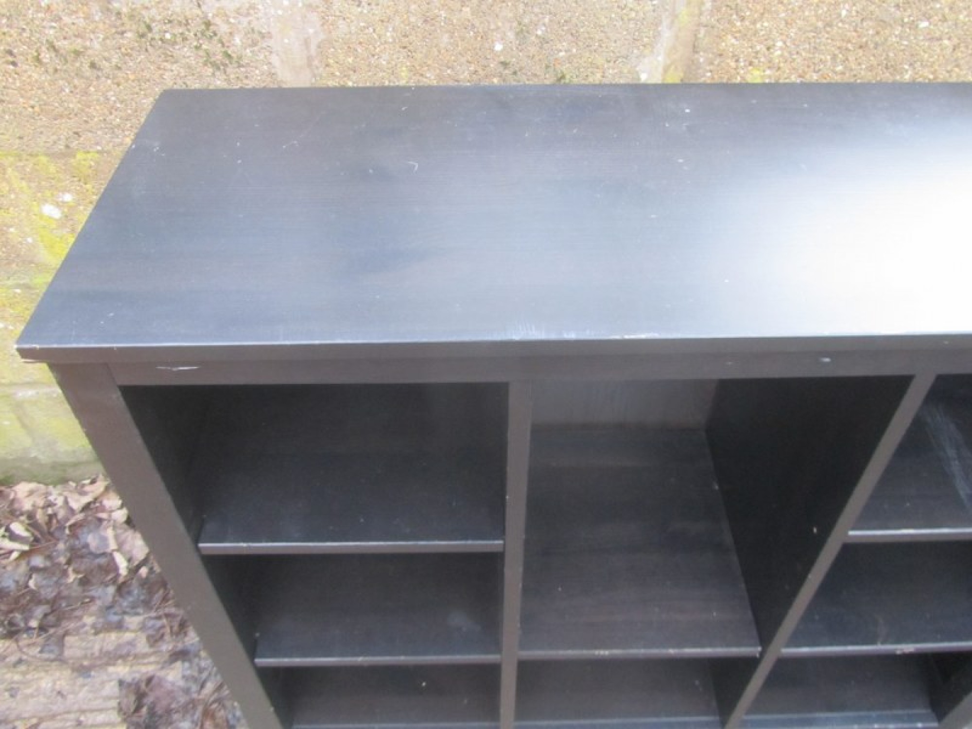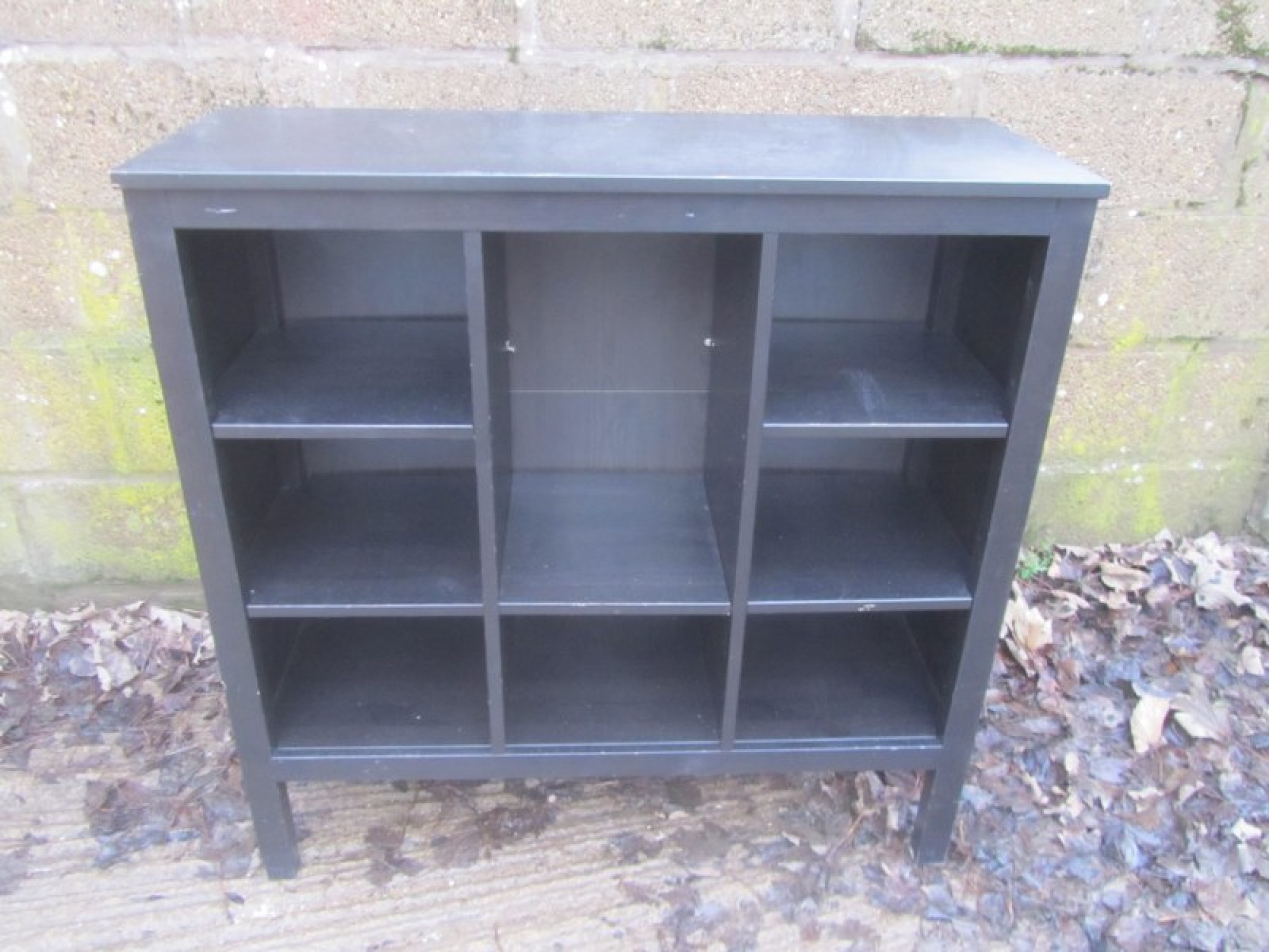 A BOOKCASE MADE FROM SOLID PINE IN A BLACK FINISH. IT HAS SHELVES AND IS STRONG AND STURDY.