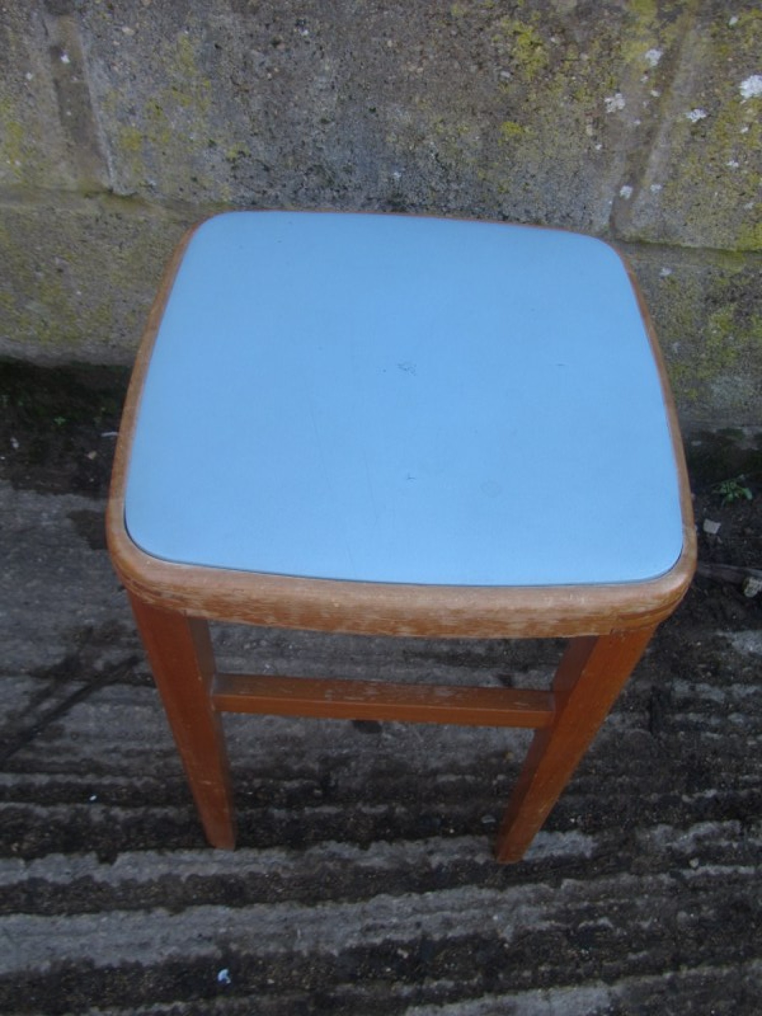 THIS IS A VINTAGE STOOL FROM THE 1960s. IT HAS A STURDY SOLID BEECH WOOD FRAME. THE TOP IS PADDED AND COVERED IN MATERIAL. A GOOD RETRO PIECE, IN AVERAGE CONDITION.