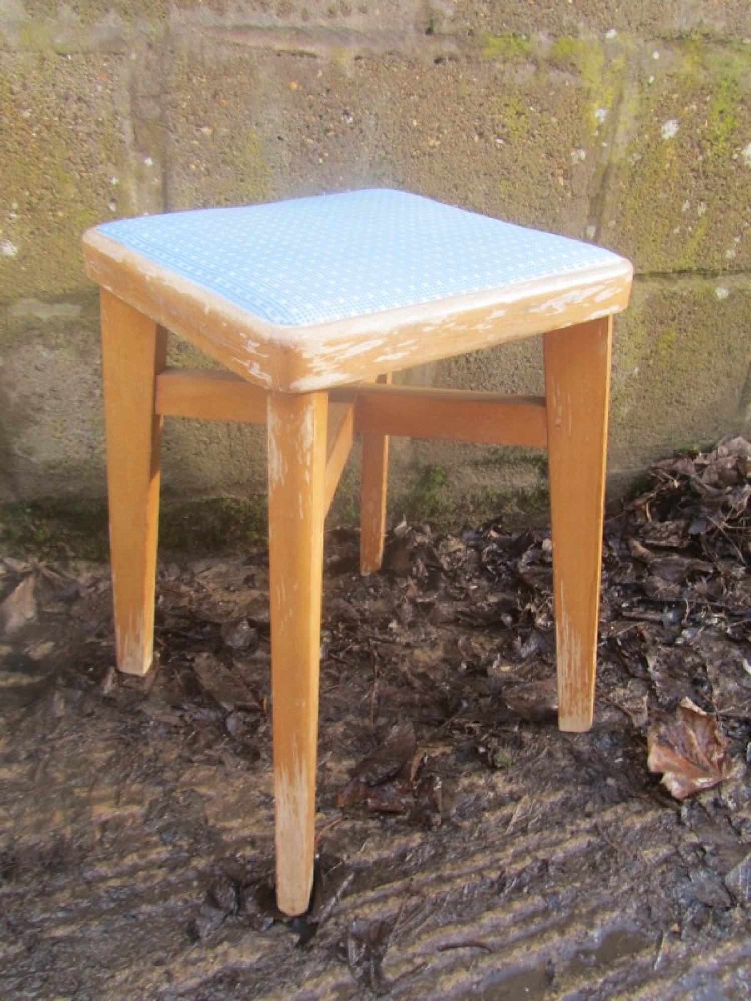 THIS IS A VINTAGE STOOL FROM THE 1960s. IT HAS A STURDY SOLID BEECH WOOD FRAME. THE TOP IS PADDED AND COVERED IN VINYL. A GOOD RETRO PIECE.