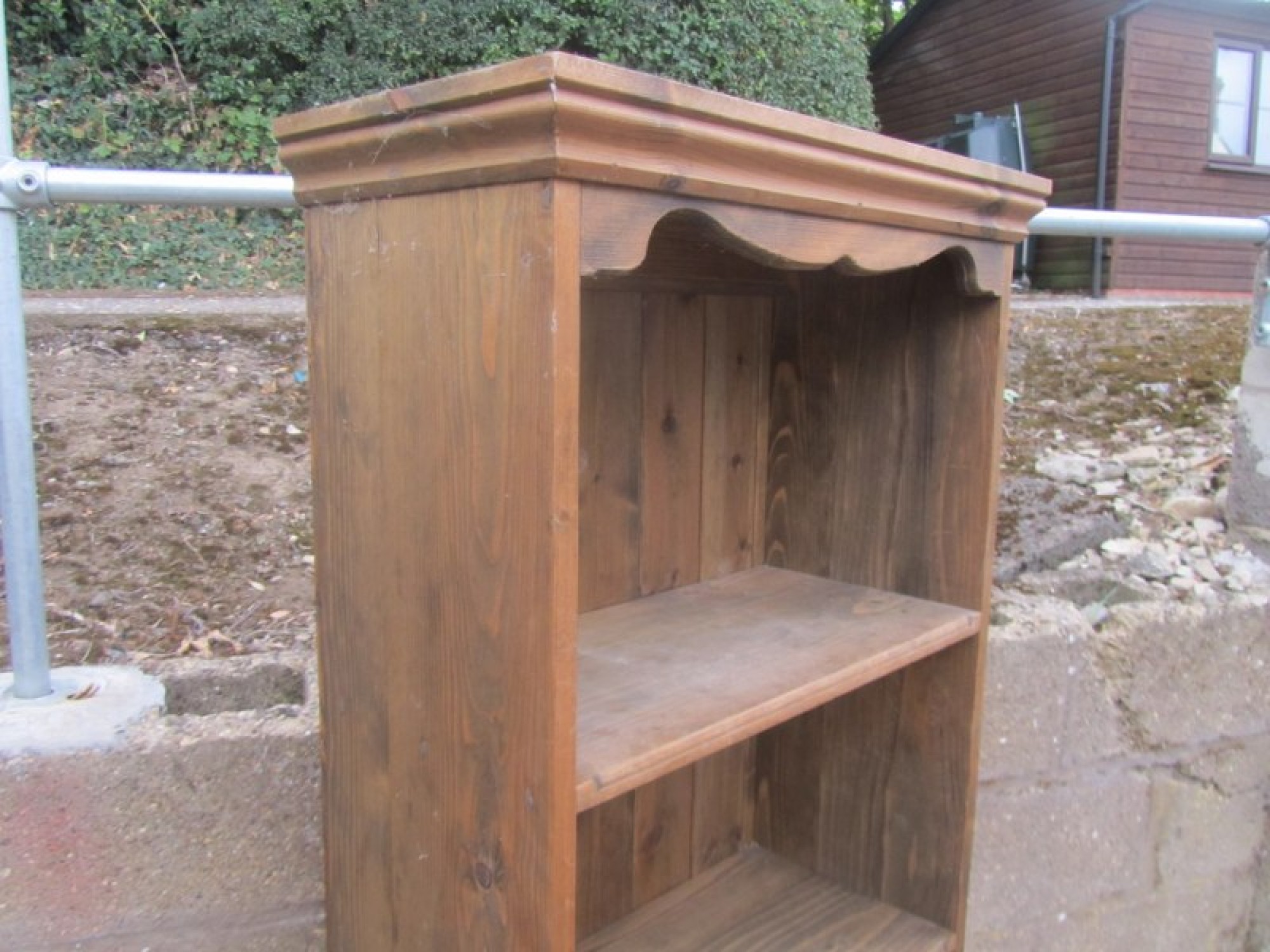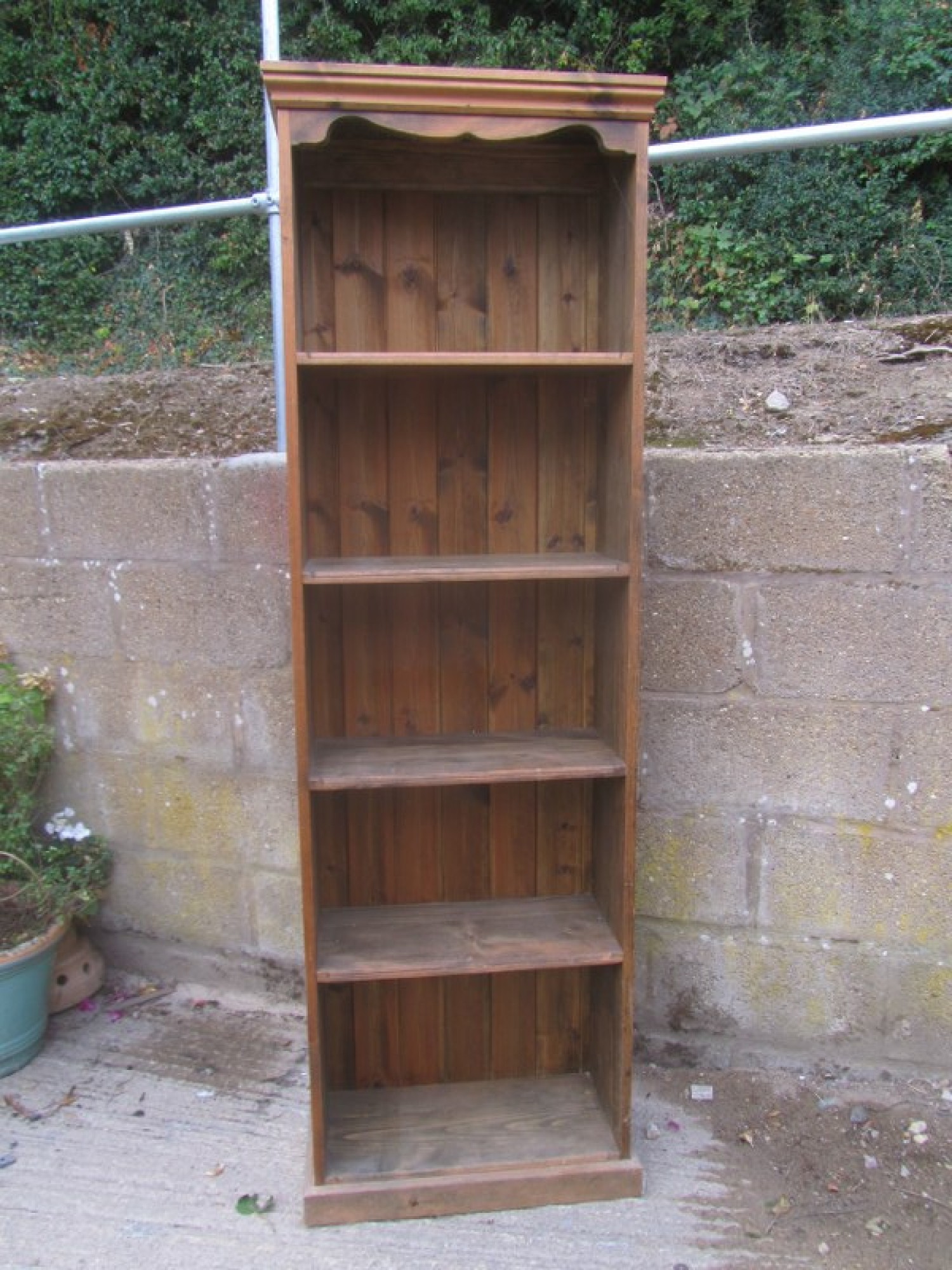 A TALL BOOKCASE MADE FROM SOLID PINE IN AN ANTIQUE PINE COLOUR FINISH.