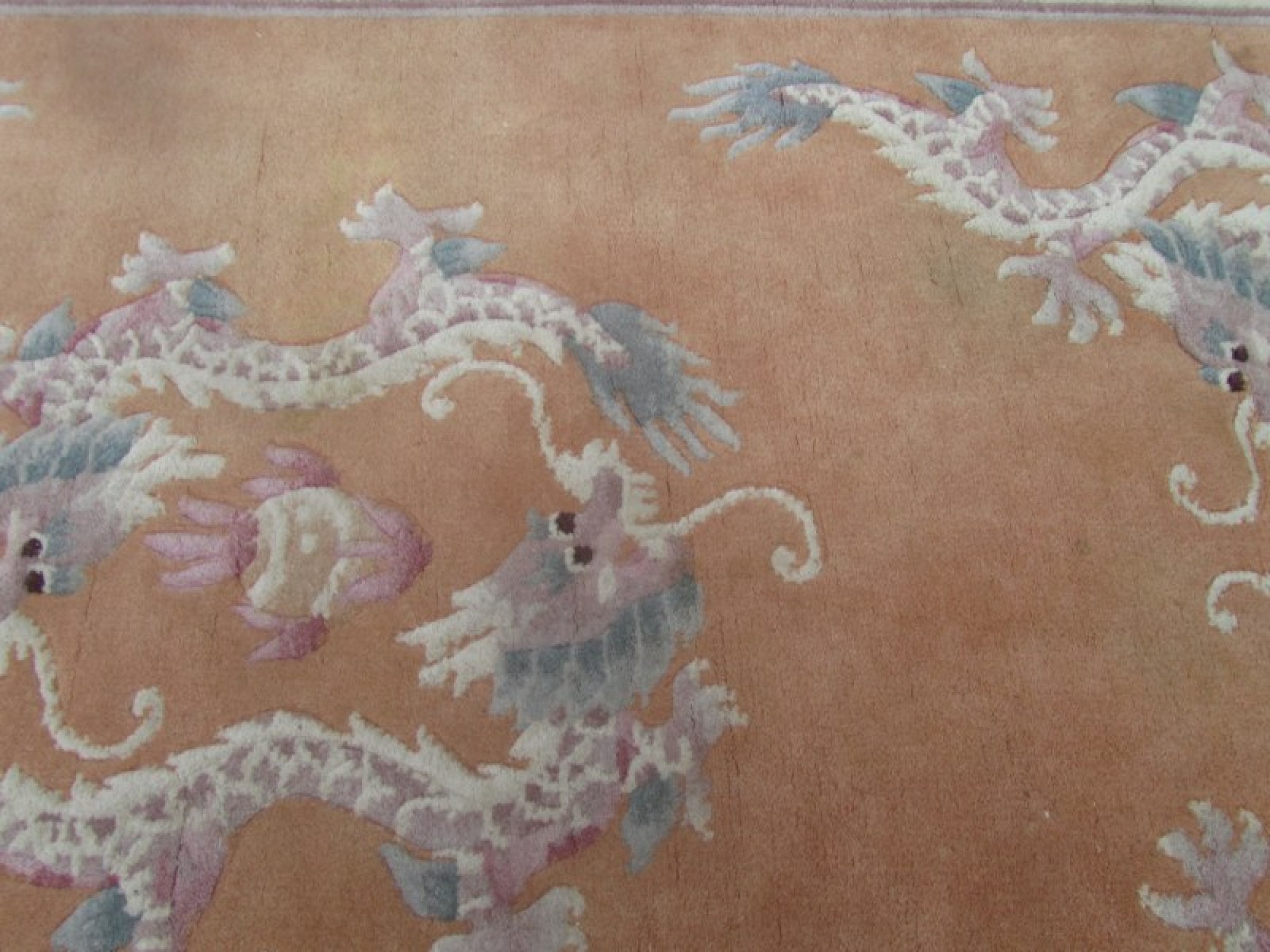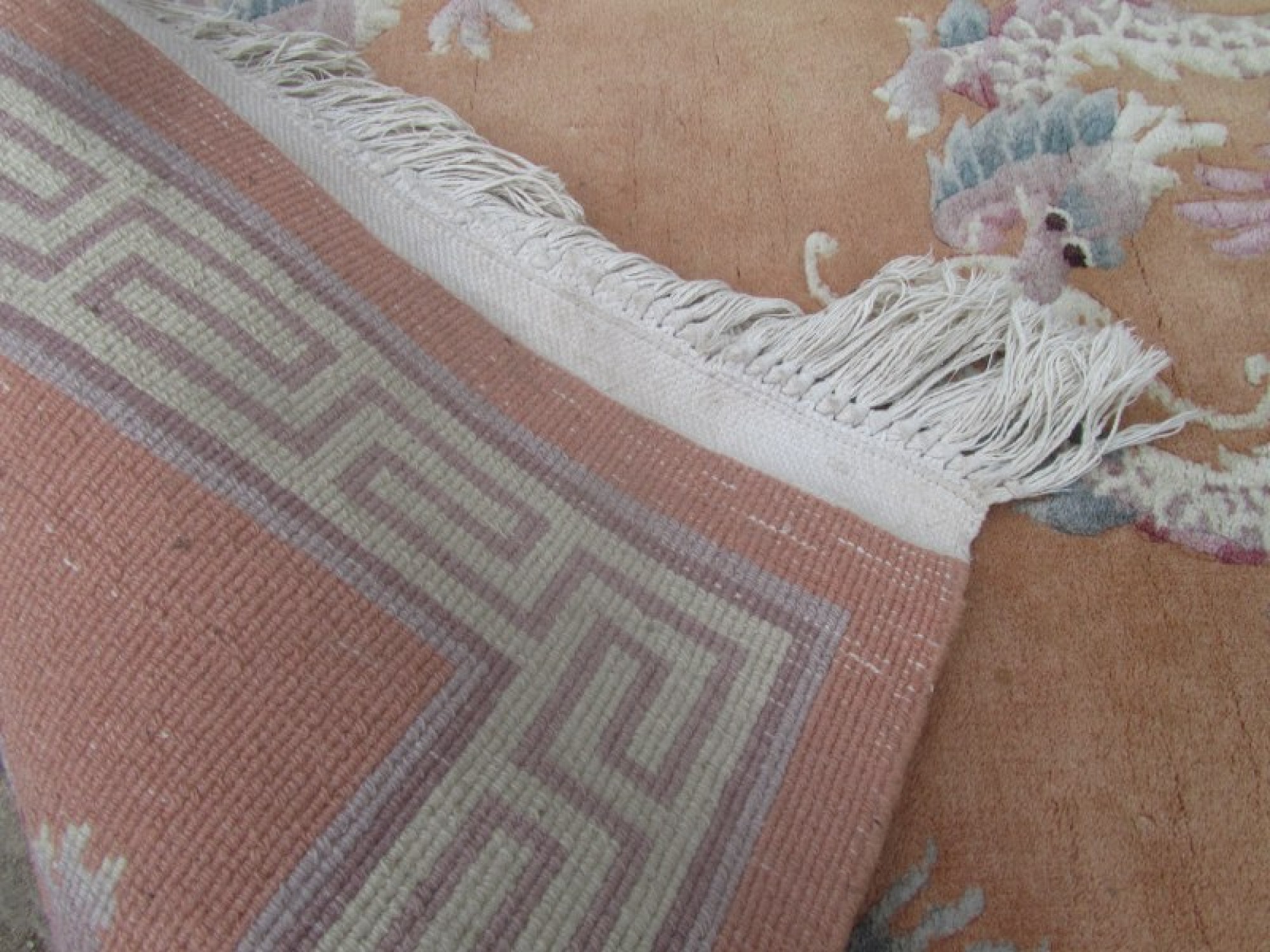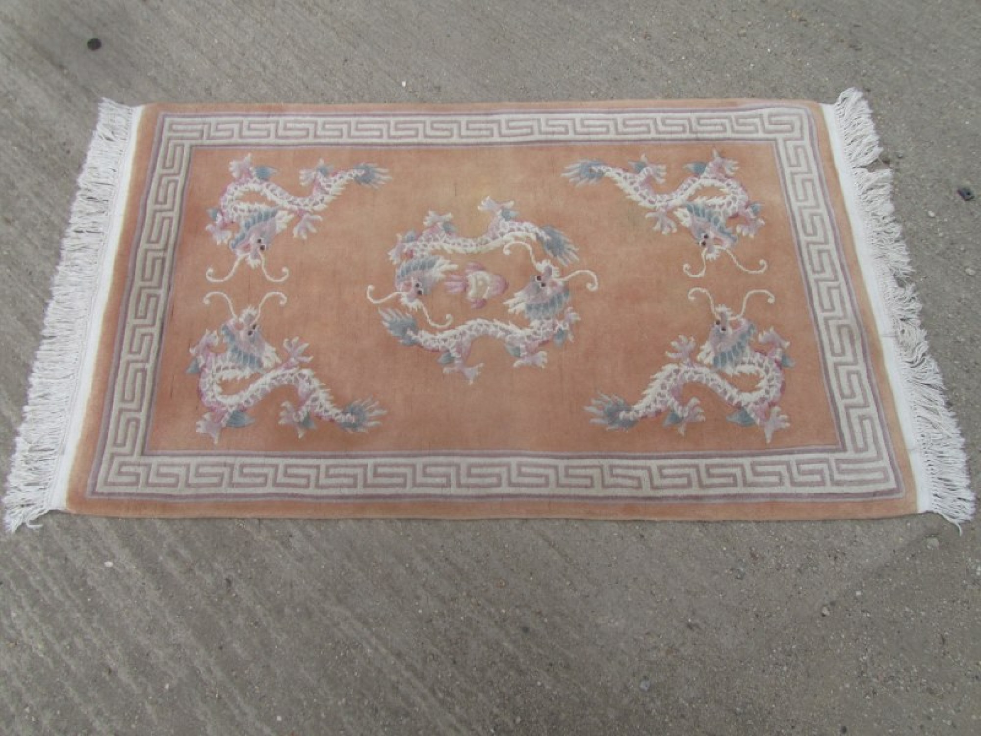 A RECTANGULAR RUG, IT HAS A TRADITIONAL PATTERN, A GOOD QUALITY RUG. SOME LIGHT WEAR AND MARKS.