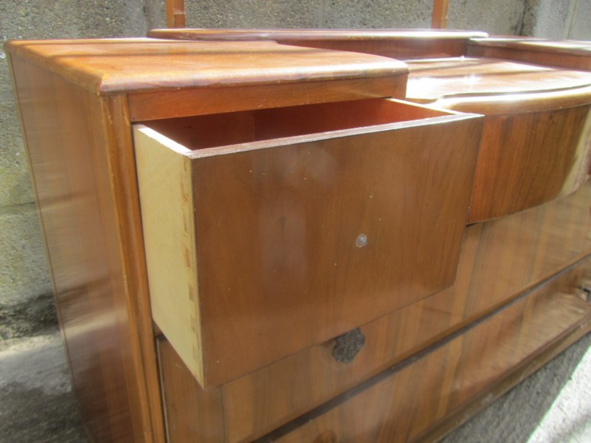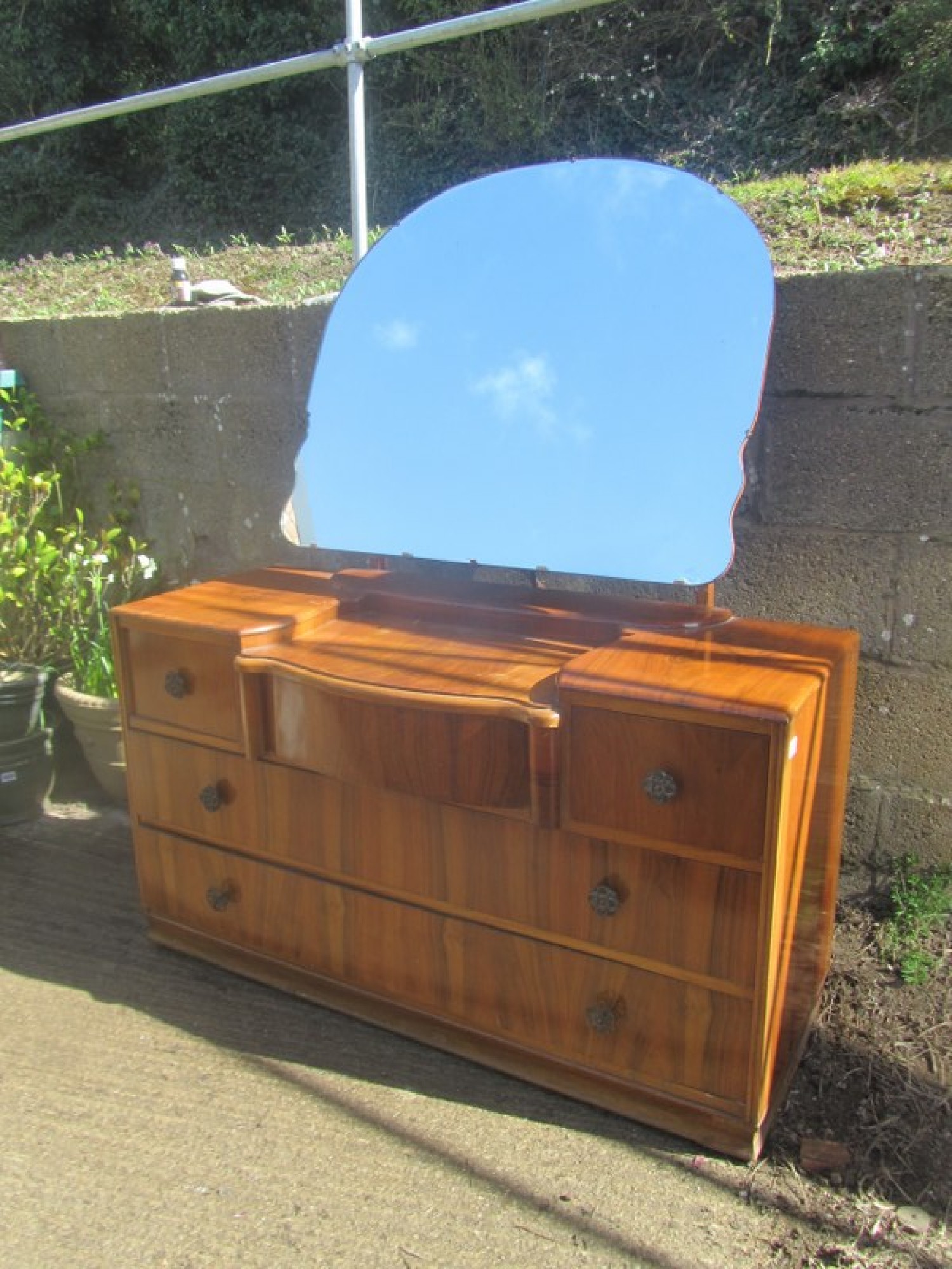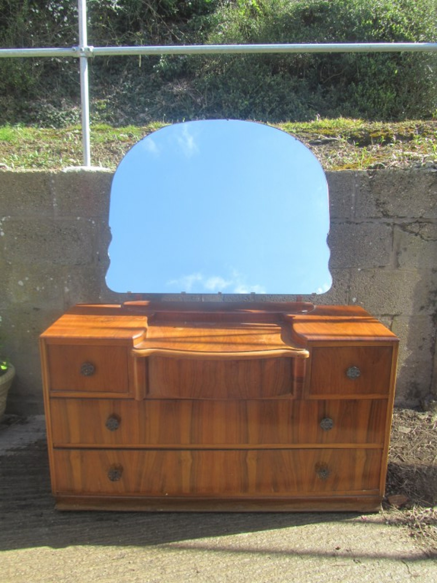 THIS IS A WALNUT VENEERED ART DECO DRESSING TABLE FROM THE 1940s/50s. IT HAS A LARGE MIRROR. DRAWERS BELOW. THE TOP LEFT HAND DRAWER HAS THE HANDLE MISSING, IT BROKE AFTER TAKING THE PHOTO! THE METAL MIRROR ADJUSTMENT BRACKET IS MISSING. THERE IS A LARGE CHIP TO THE BOTTOM RIGHTHAND SIDE OF THE MIRROR.