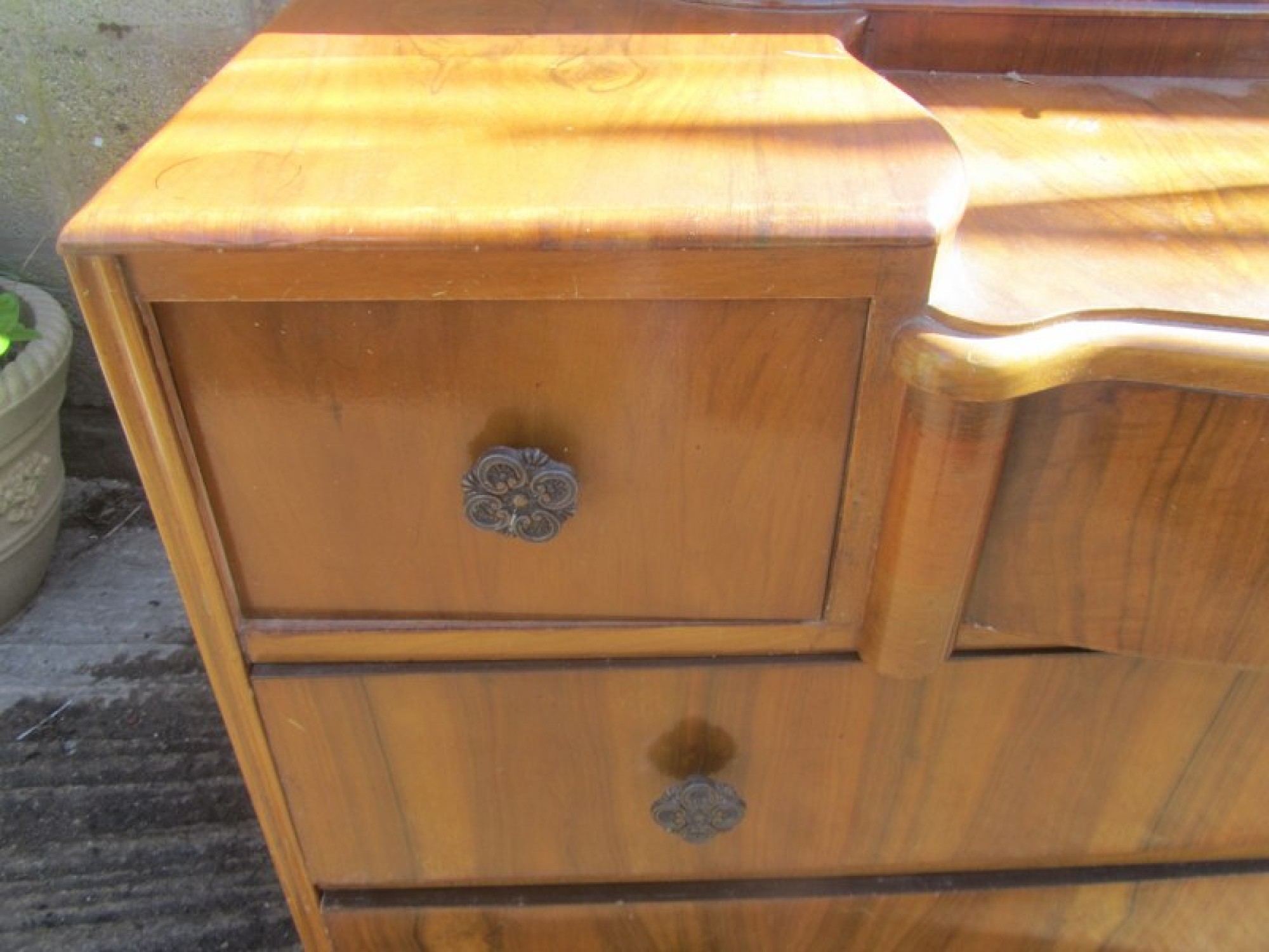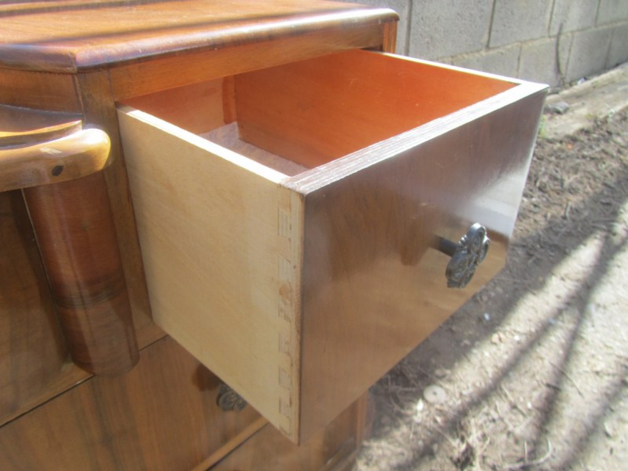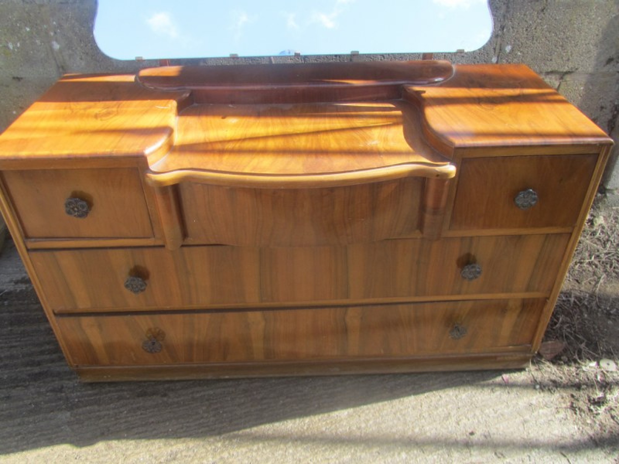THIS IS A WALNUT VENEERED ART DECO DRESSING TABLE FROM THE 1940s/50s. IT HAS A LARGE MIRROR. DRAWERS BELOW. THE TOP LEFT HAND DRAWER HAS THE HANDLE MISSING, IT BROKE AFTER TAKING THE PHOTO! THE METAL MIRROR ADJUSTMENT BRACKET IS MISSING. THERE IS A LARGE CHIP TO THE BOTTOM RIGHTHAND SIDE OF THE MIRROR.