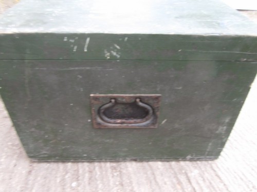 A LARGE STURDY WOODEN TRUNK WITH METAL HANDLES EACH SIDE. FOR MILITARY USE, STAMPED WITH 'ANTI TANK REGIMENT'. A GREAT CHEST FOR STORAGE OF TOYS, SHOES etc.