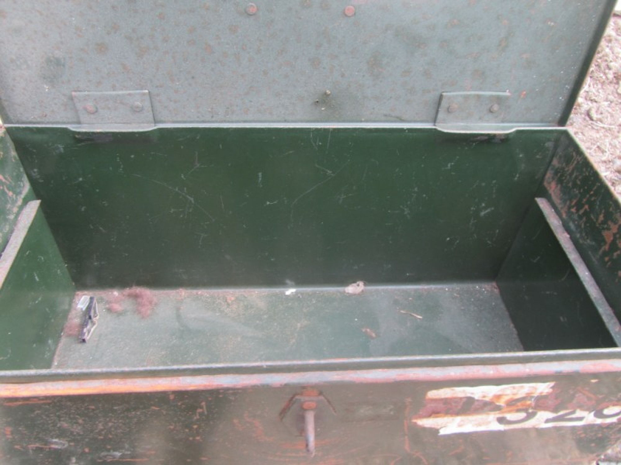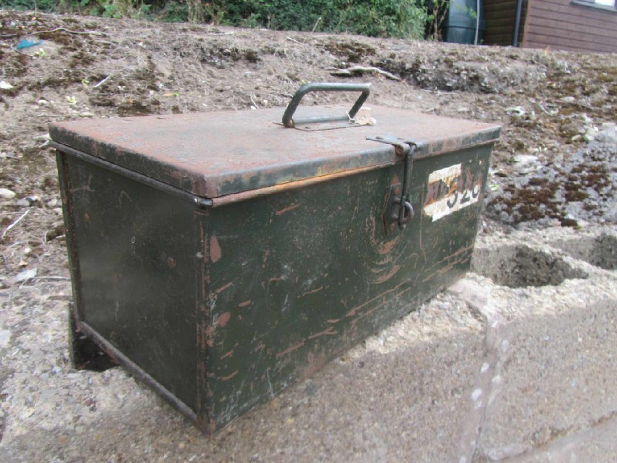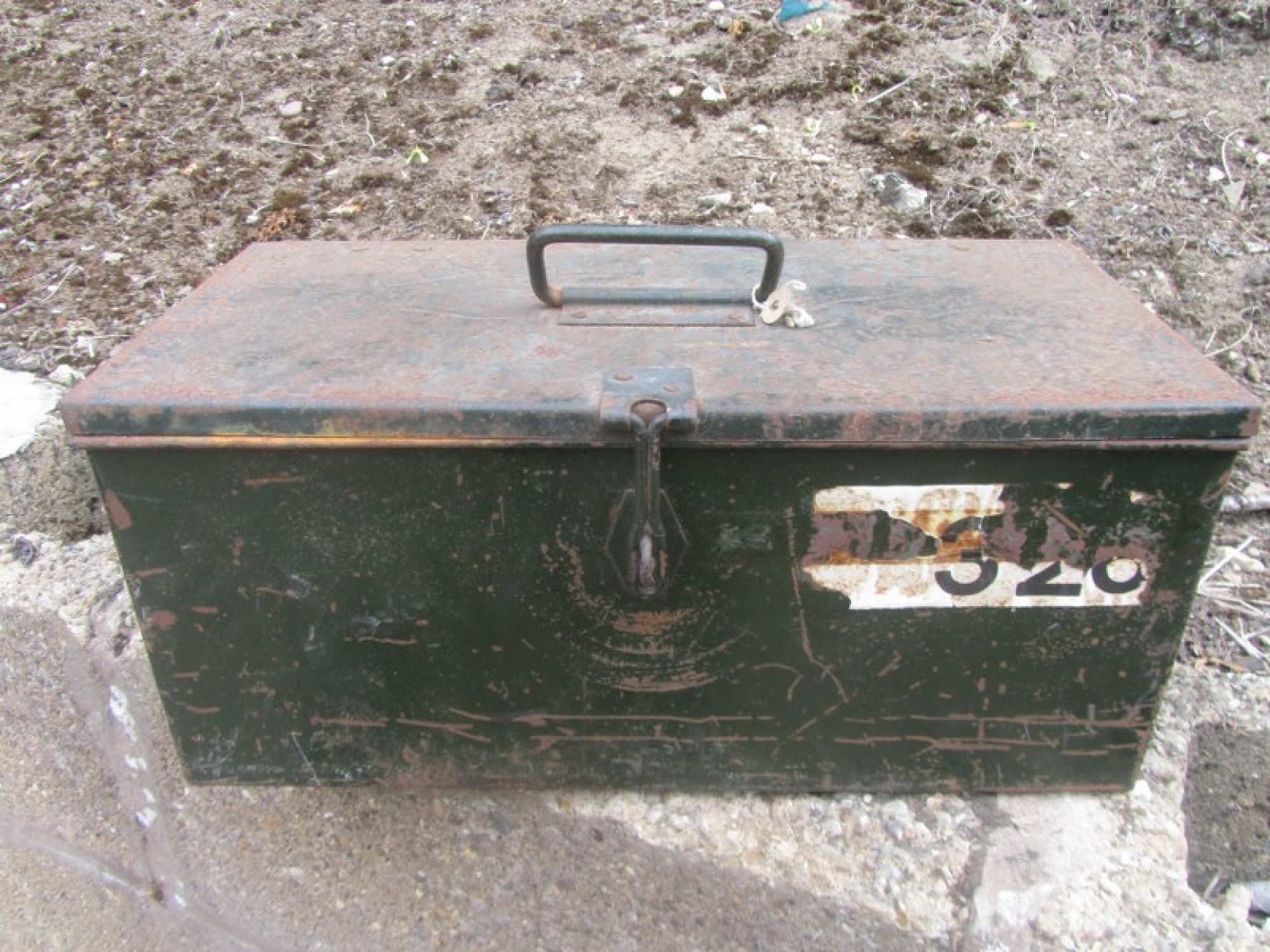 A SMALL METAL TRUNK WITH METAL HANDLE. PROBABLY FOR MILITARY USE, SMALL METAL CATCH.