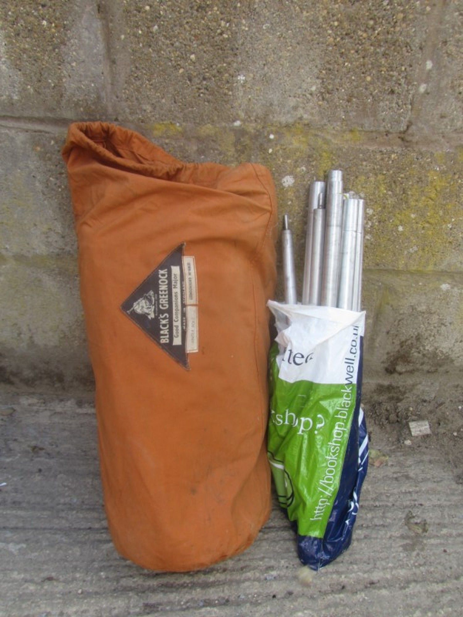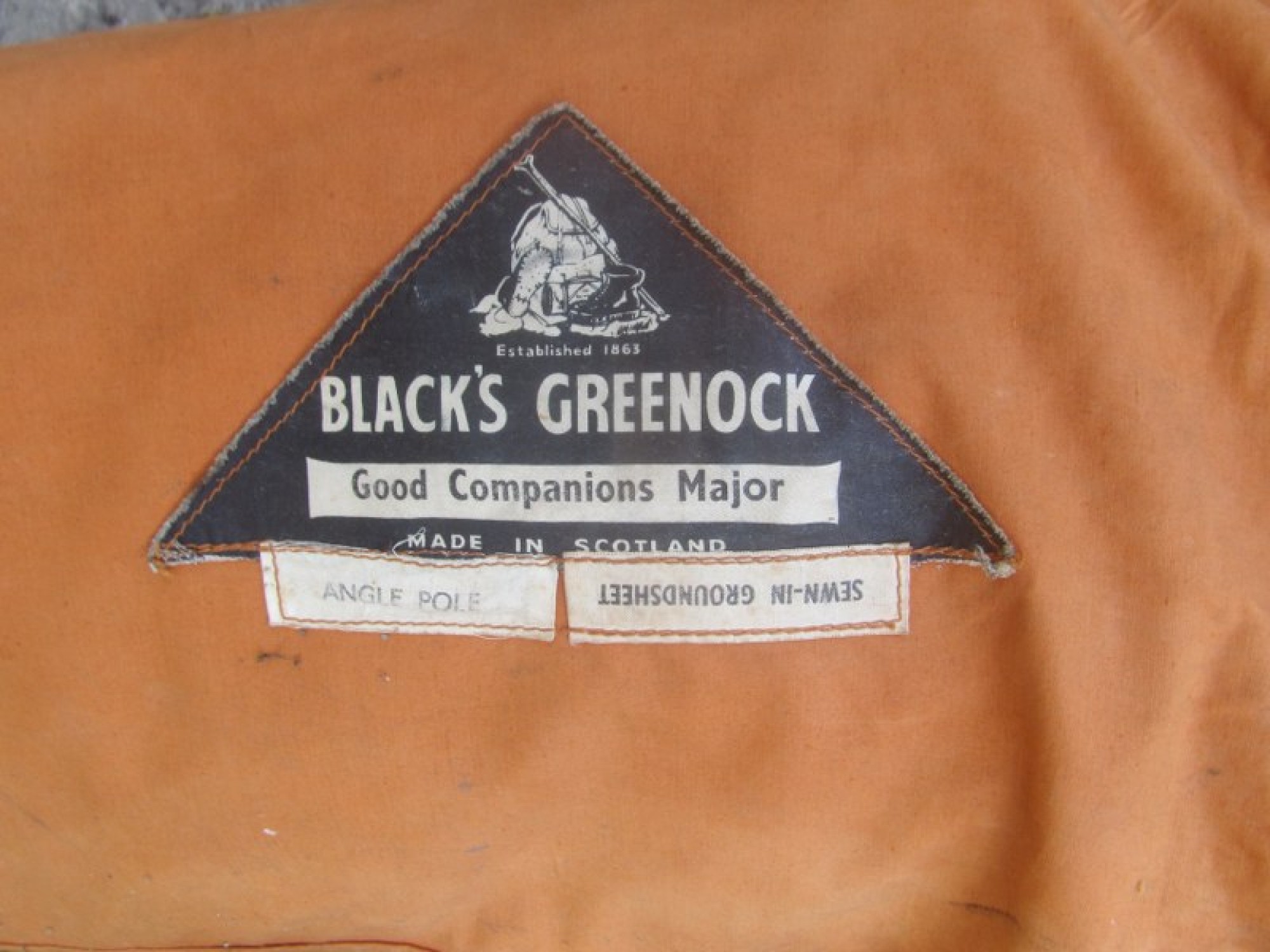 VINTAGE BLACKS GREENOCK GOOD COMPANIONS MAJOR TENT. ORANGE CANVAS, FADED, WITH GROUNDSHEET AND POLES. SOME WEAR AND MARKS FROM USE.