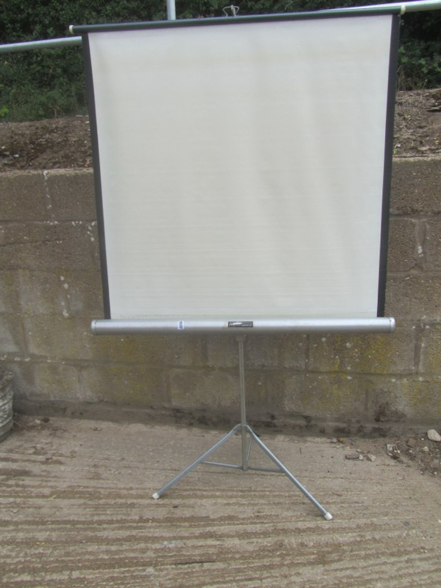A VINTAGE PROJECTOR SCREEN, ORIGINALLY FOR SLIDE PROJECTORS, BUT CAN ALSO BE USED FOR POWERPOINT PRESENTATIONS. IT HAS A METAL FRAME AND A COATED MATERIAL SCREEN. THE SCREEN ROLLS UP INSIDE WHEN NOT IN USE. THE FRAME COLLAPSES TO A COMPACT SIZE.