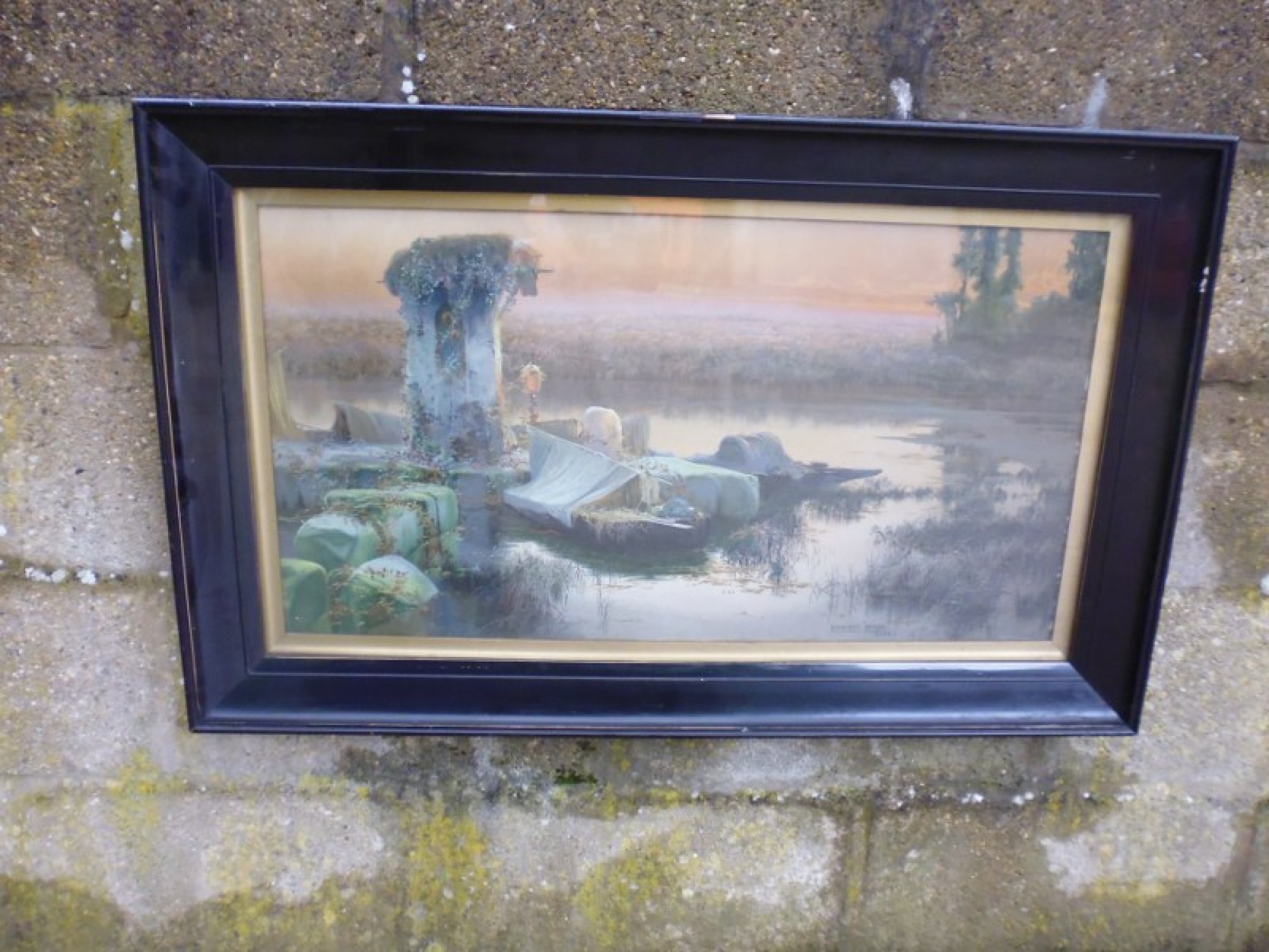 A VINTAGE PRINT OF A LAKE BY ARTIST ENRIQUE SERRA - ROMA. IN A BLACK FRAME. res3112