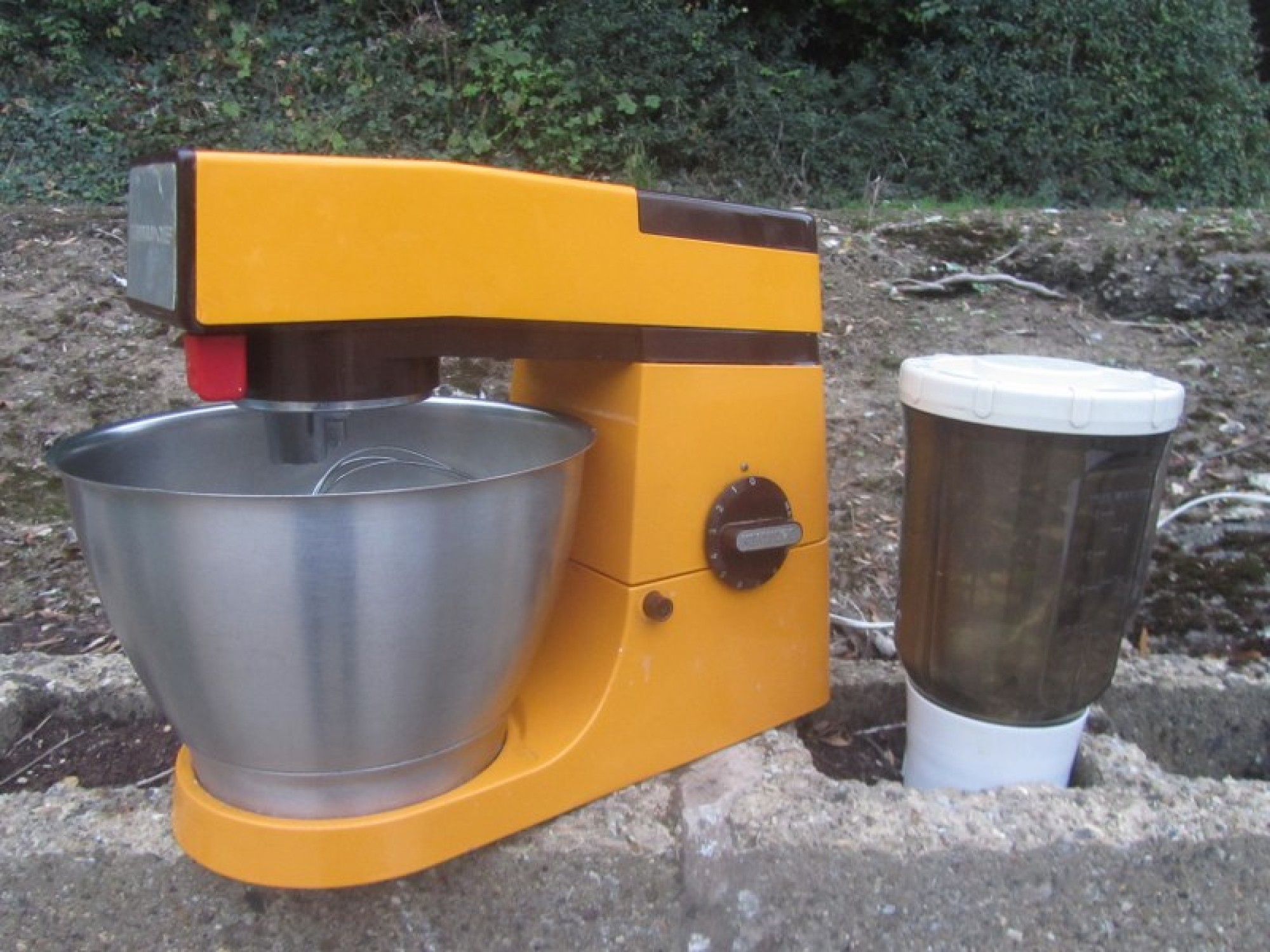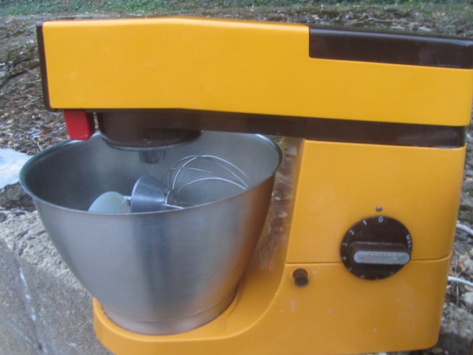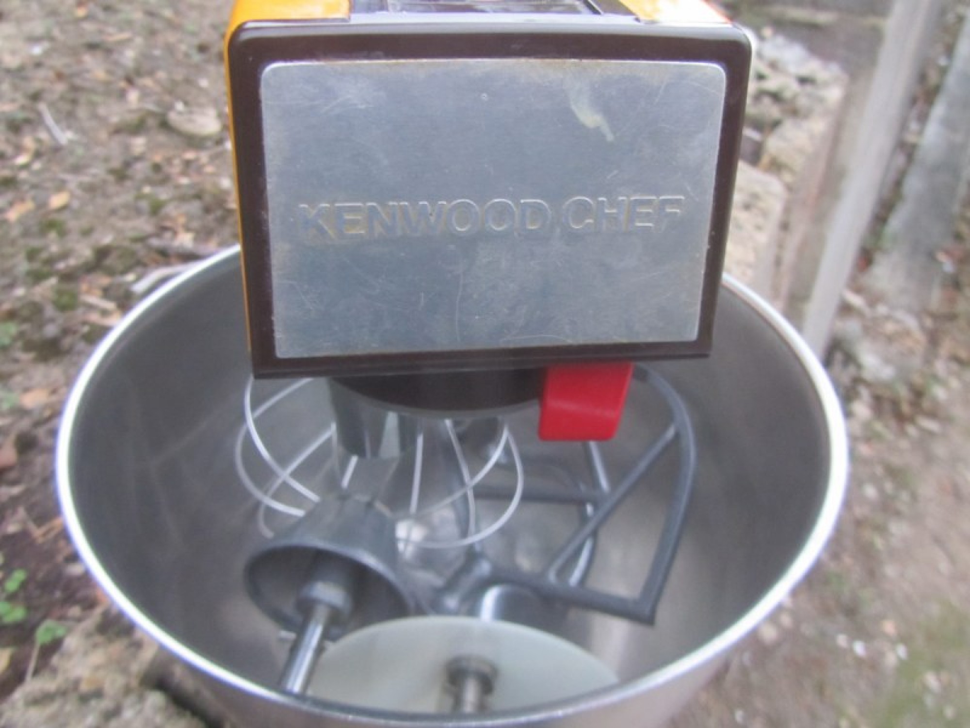 THIS IS A KENWOOD FOOD MIXER. IT IS WORKING. IT COMES WITH ATTACHMENTS AND ORIGINAL BOWL. IN AN ORANGE FINISH. SOME WEAR AND DAMAGED PAINT AROUND THE BOWL HOLDER.