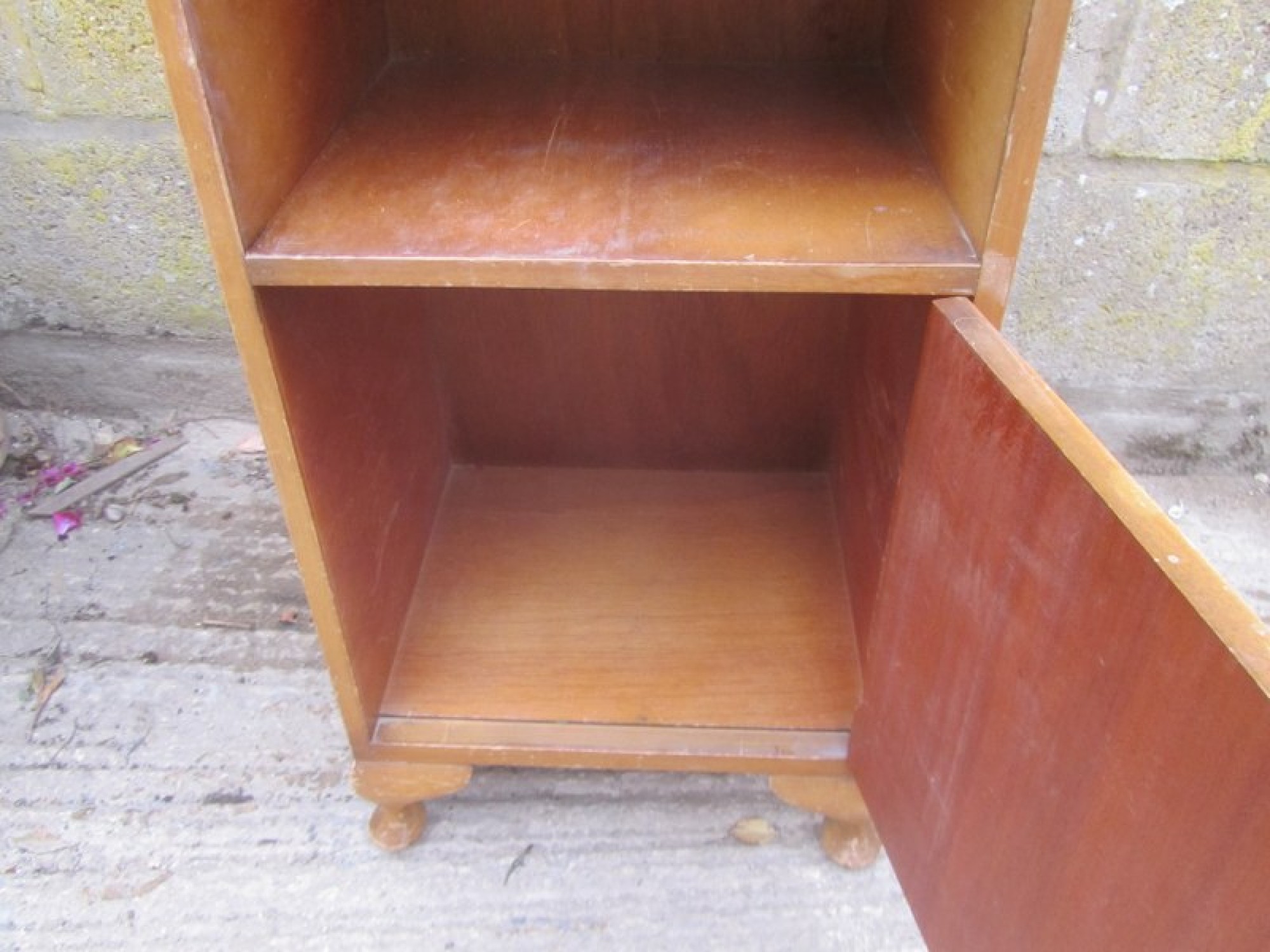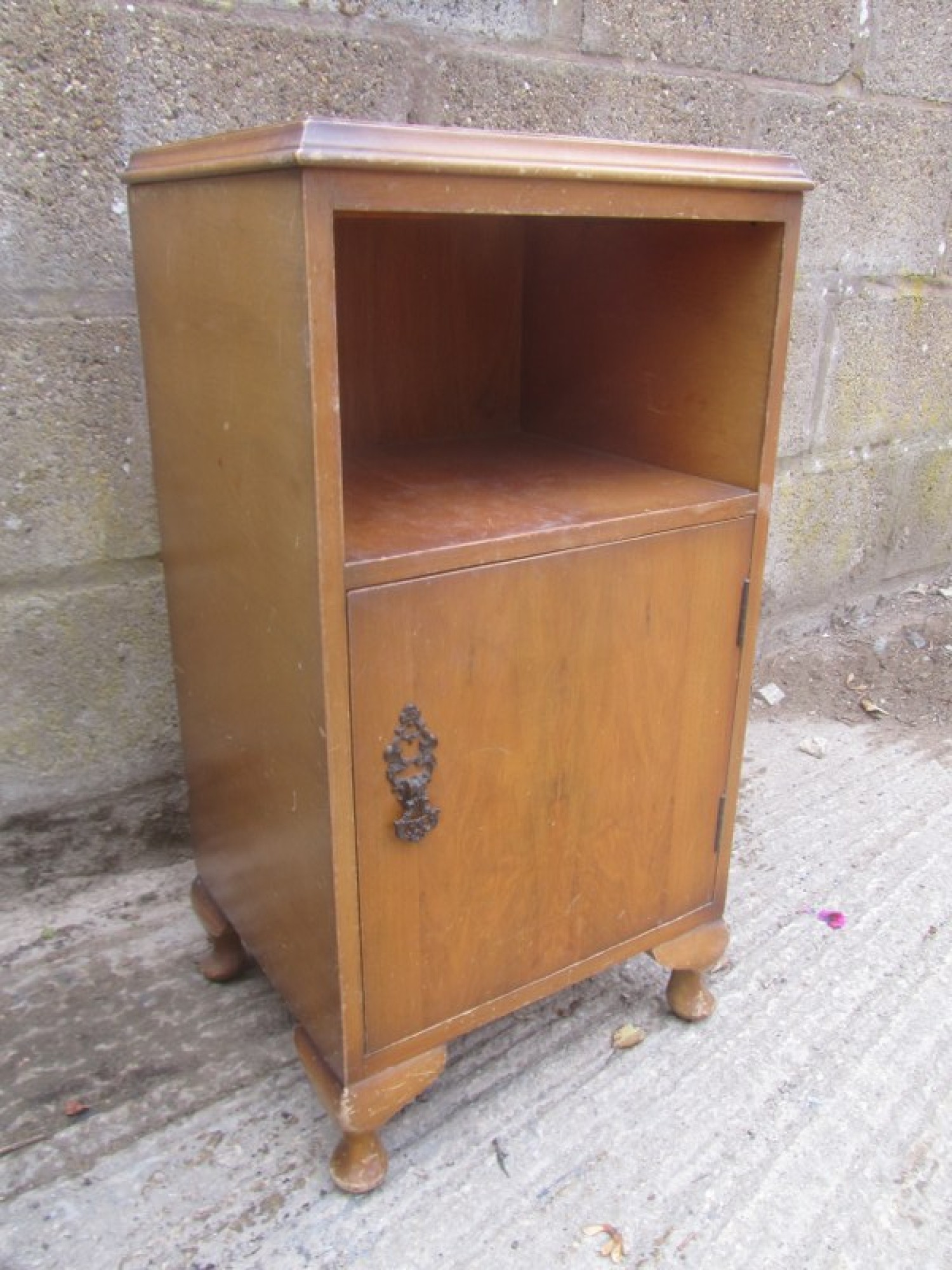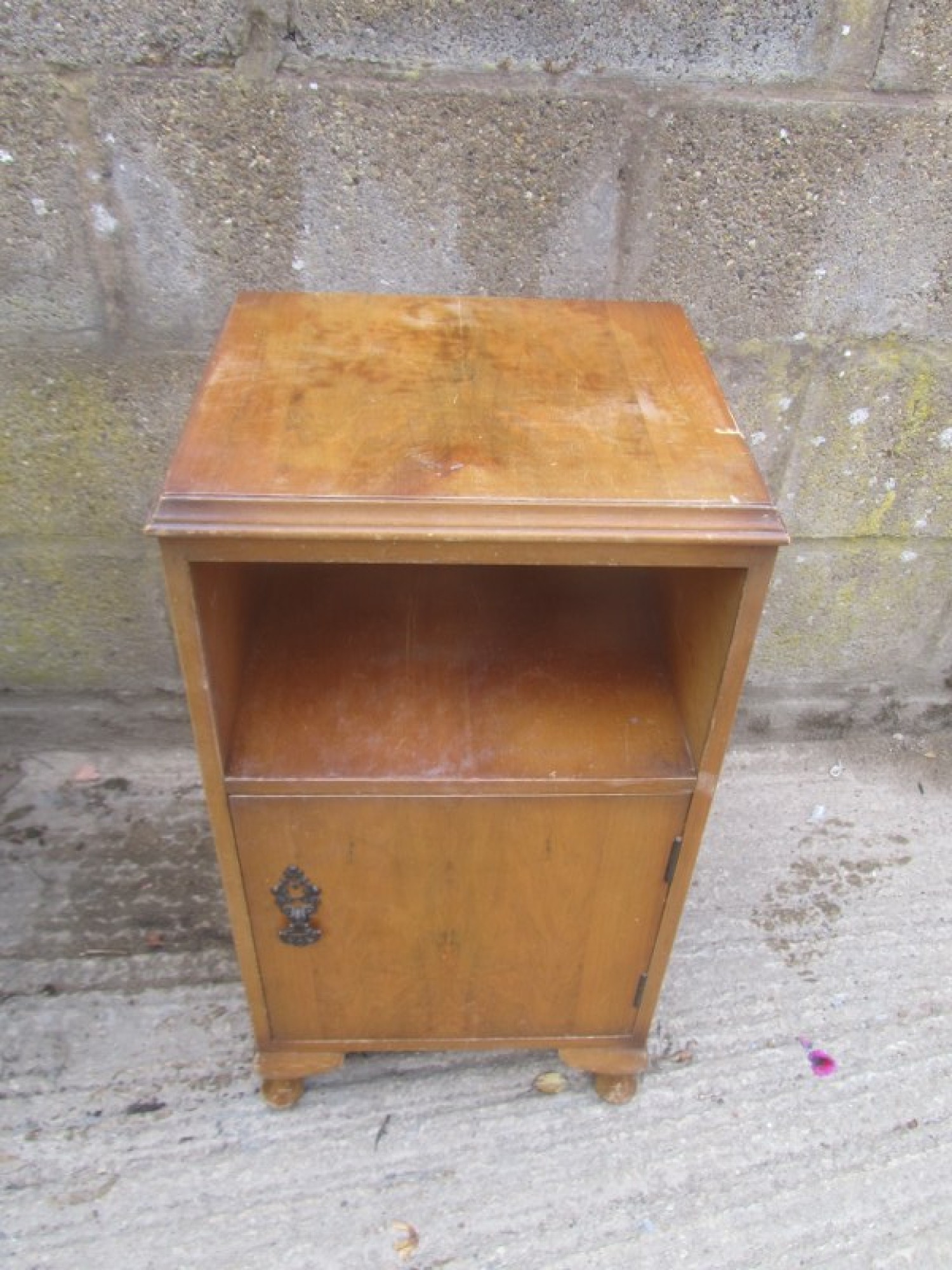 A WALNUT VENEERED BEDSIDE CABINET WITH A SINGLE DOOR. MARKS AND WEAR.