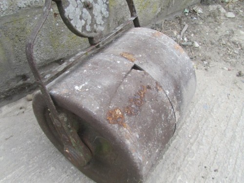 A VINTAGE METAL GARDEN ROLLER. A HEAVY METAL ROLLER MADE FROM METAL, IN WORKING ORDER, OR CAN JUST USED AS A DECORATIVE GARDEN ITEM. THE DRUM IS METAL, THE METAL ON THE OUTSIDE IS RUSTY AND CRACKED.