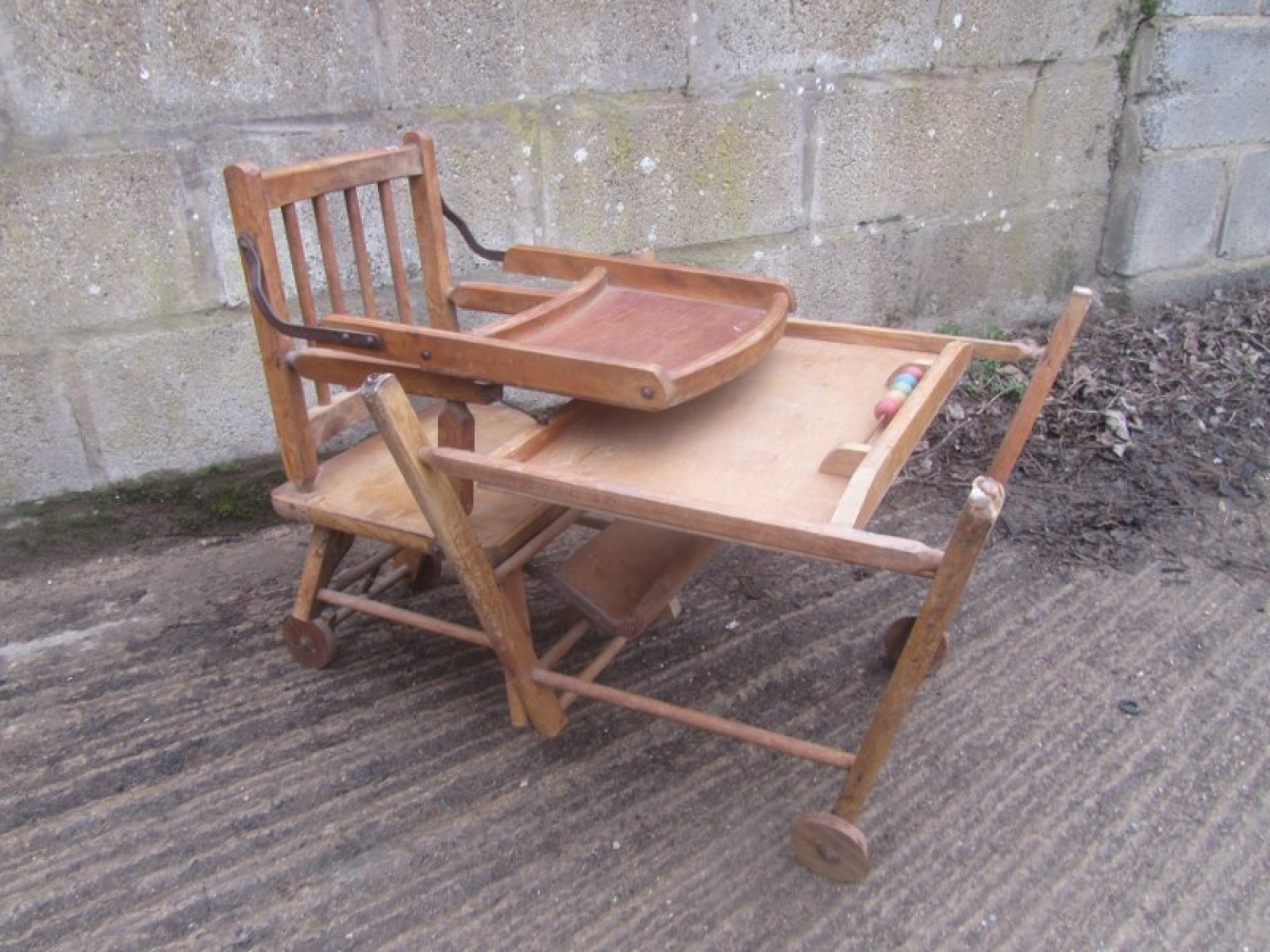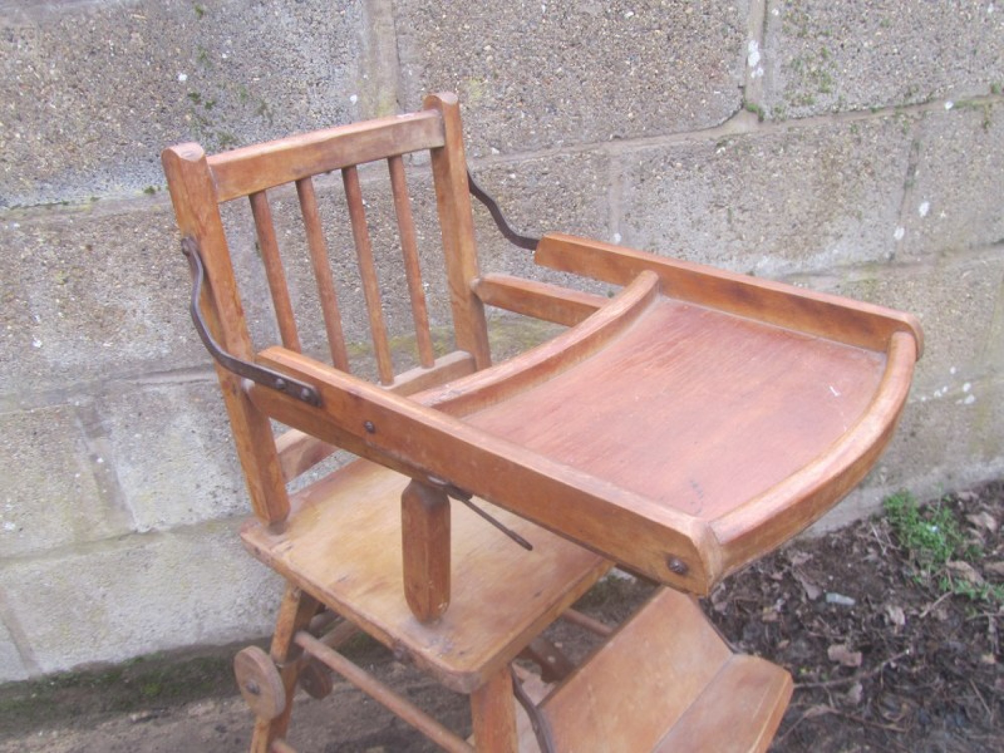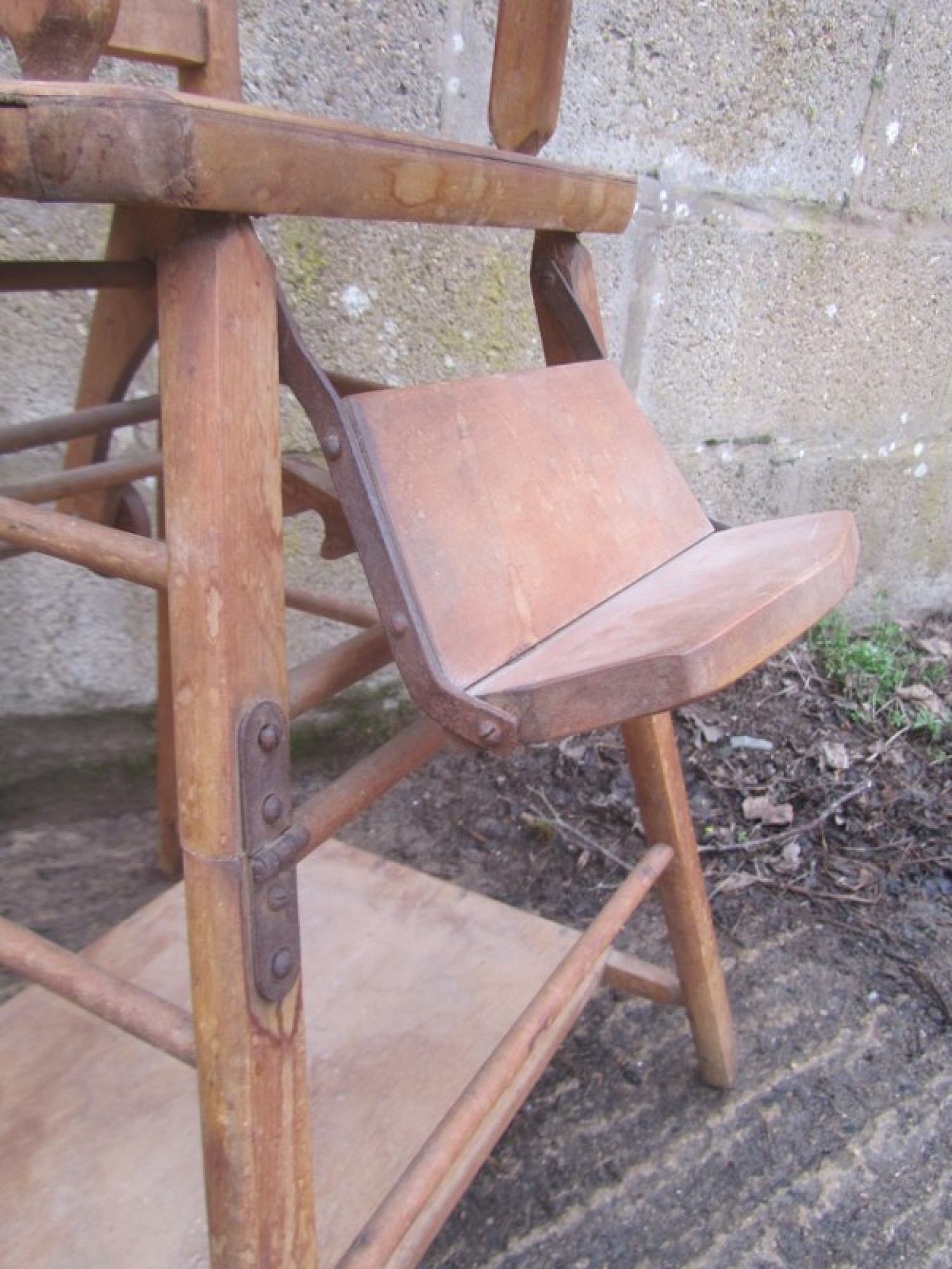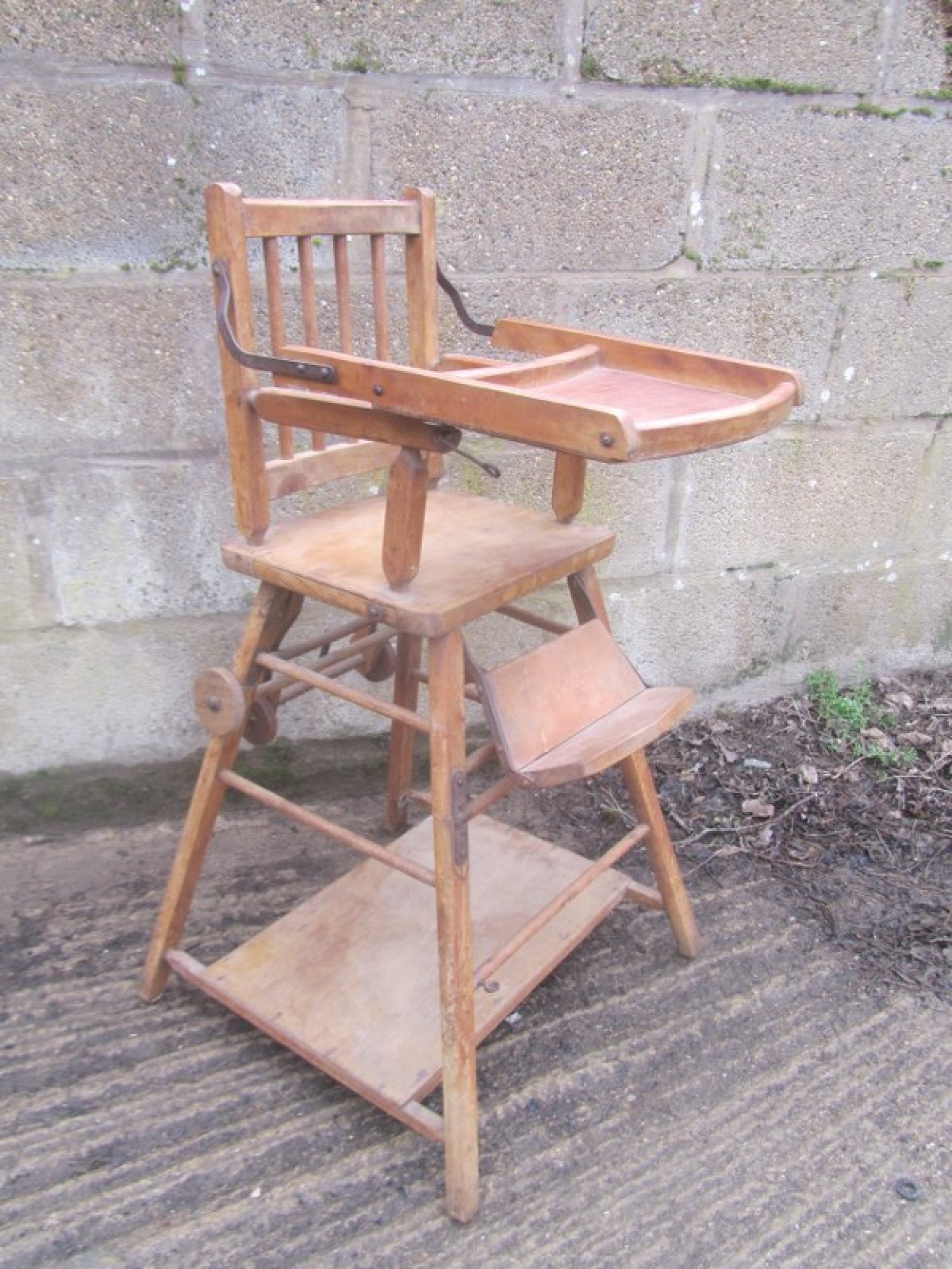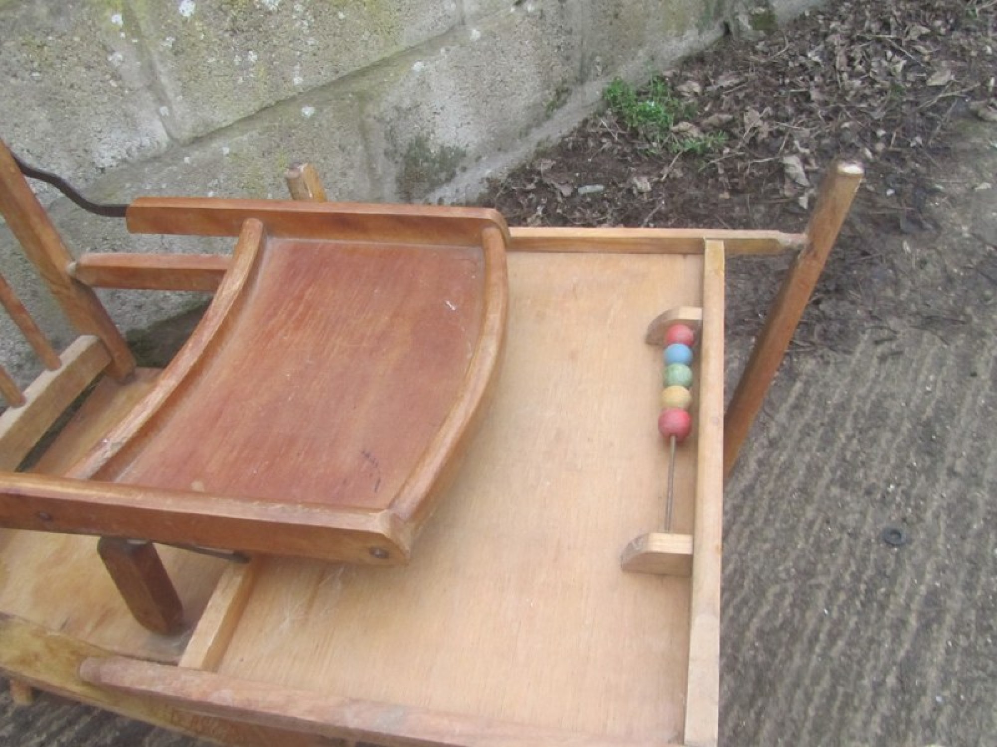 A VINTAGE HIGH CHAIR, DUE TO HEALTH AND SAFETY THIS IS FOR SALE AS A DECORATIVE ITEM ONLY AND IS NOT INTENDED FOR USE BY CHILDREN. THE FRAME IS SOLID BEECH WOOD & PLYWOOD.