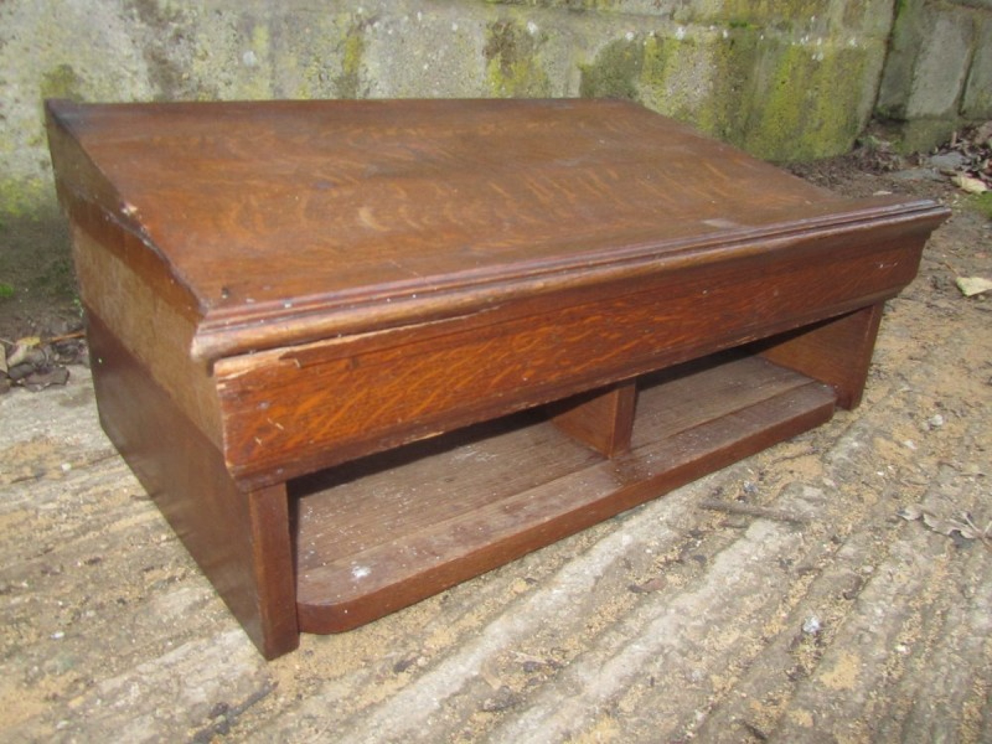 THIS LOOKS TO HAVE BEEN ATTACHED TO A WALL, WITH A SLOPING TOP, PROBABLY FOR READING. SOME TRIM MISSING ON THE SIDES.